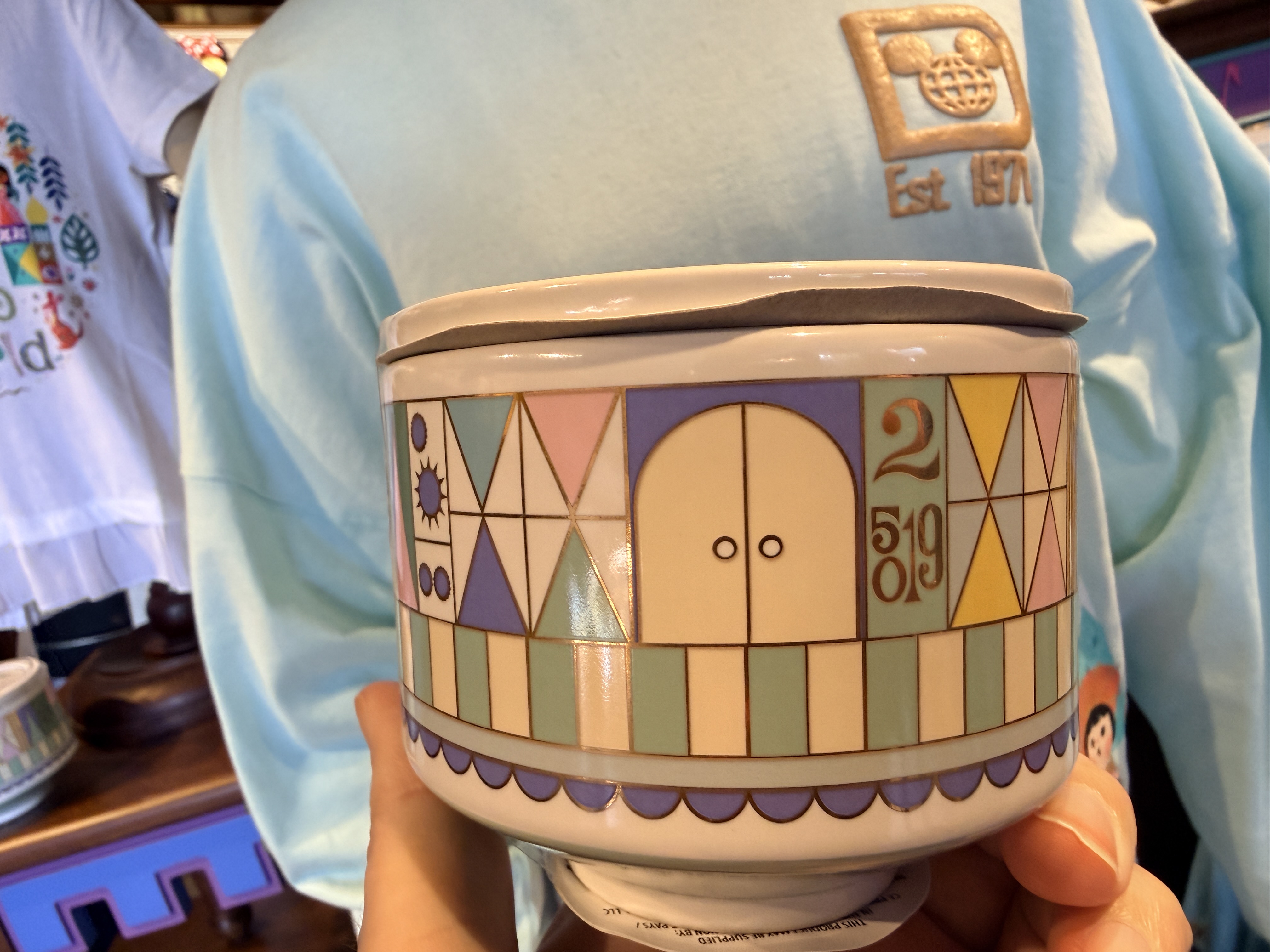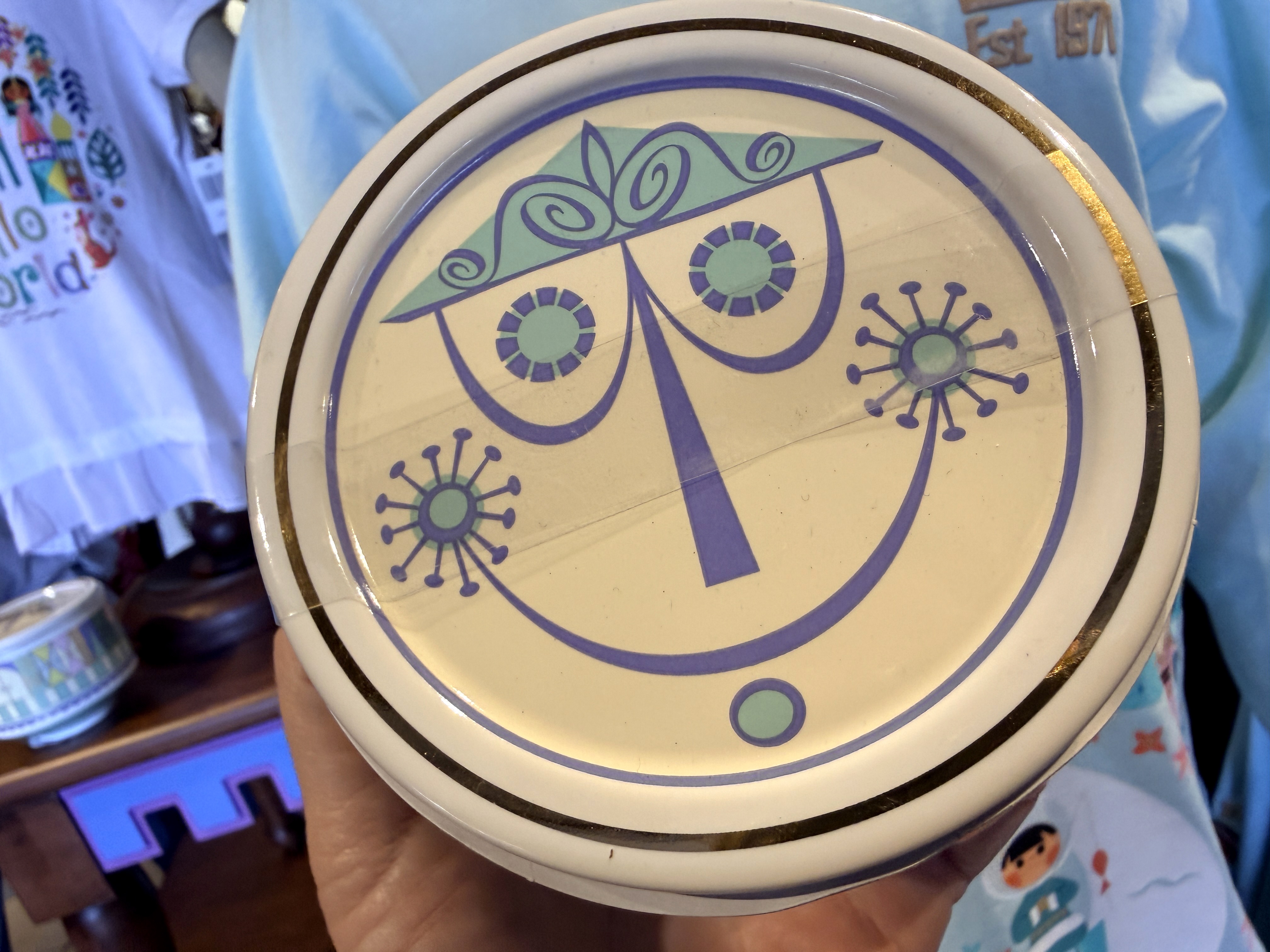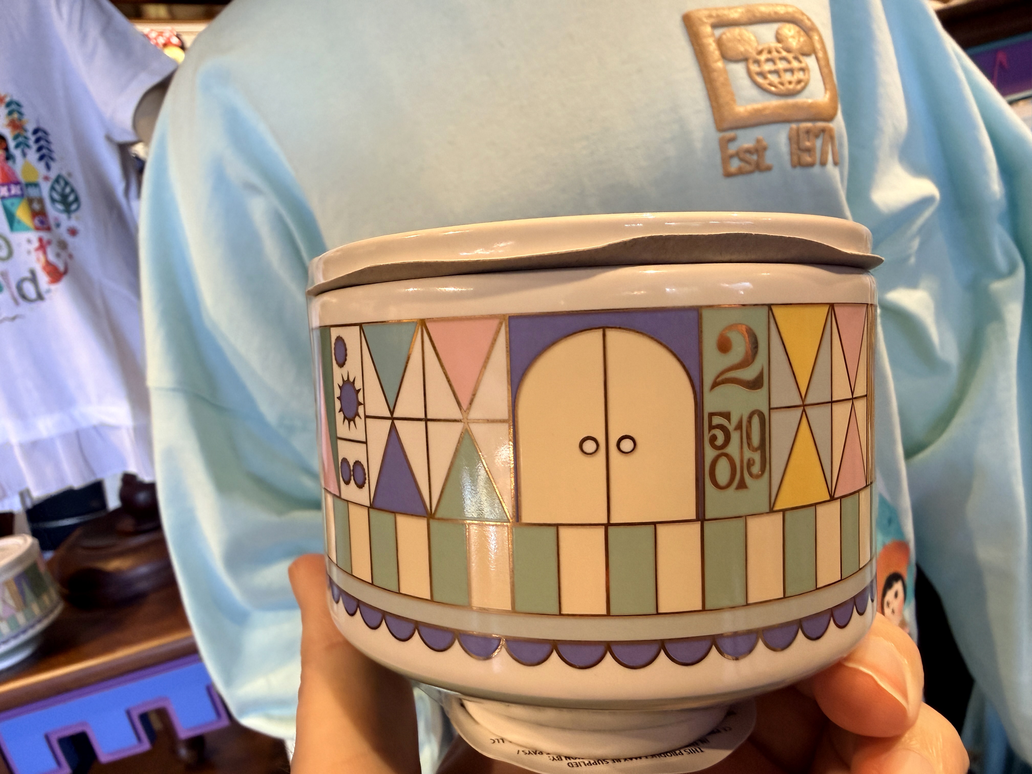 Two new items inspired by "it's a small world" were spotted today at the Magic Kingdom. First is a new candle featuring the iconic Mary Blair-style designs from the attraction. The cover of the candle is the iconic clock face from the attraction. Offering a fresh citrus scent, the candle retails for $44.99.