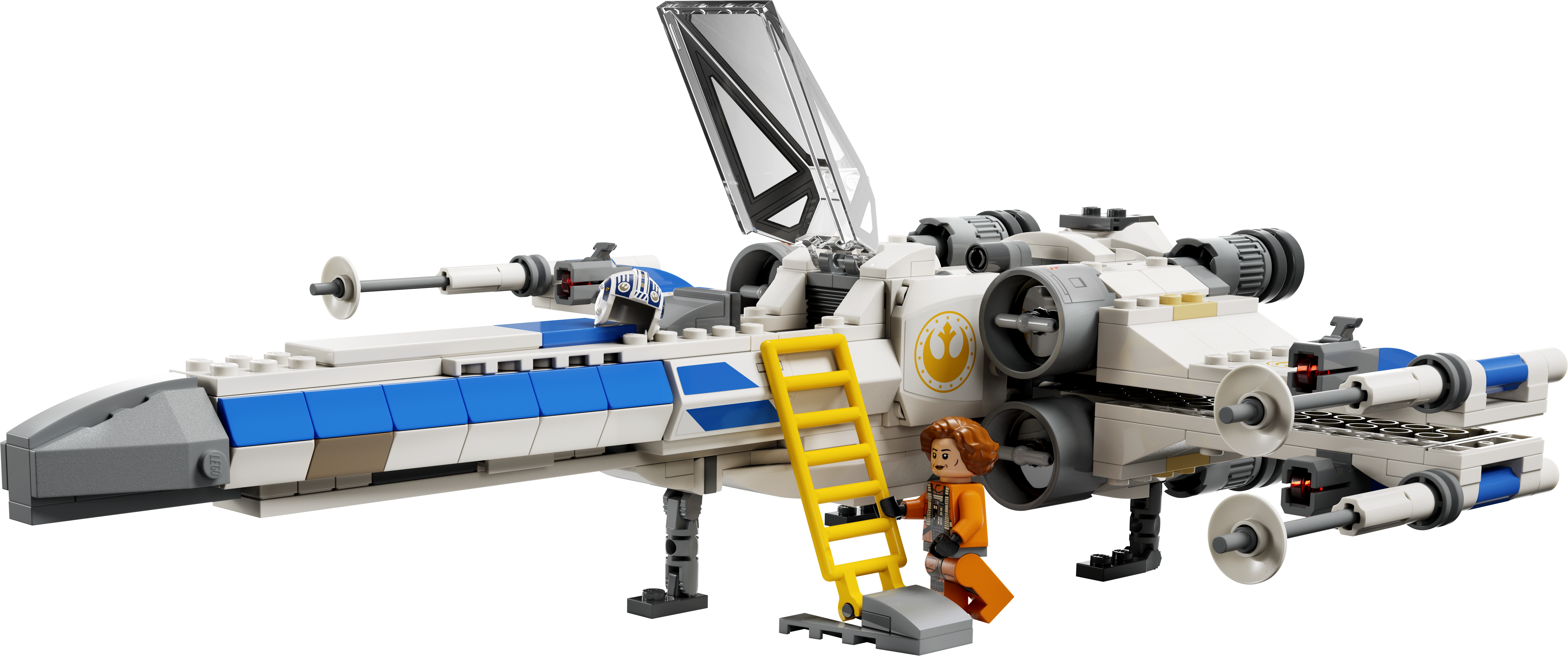 - You can stow equipment in the rear compartment, place the New Republic Astromech LEGO droid figure behind the cockpit, retract the landing gear, push the button to flip the wings into attack mode, and activate the 4-stud shooters.
