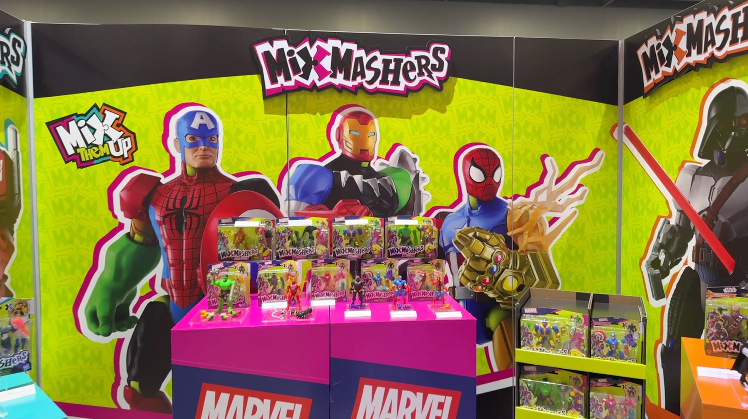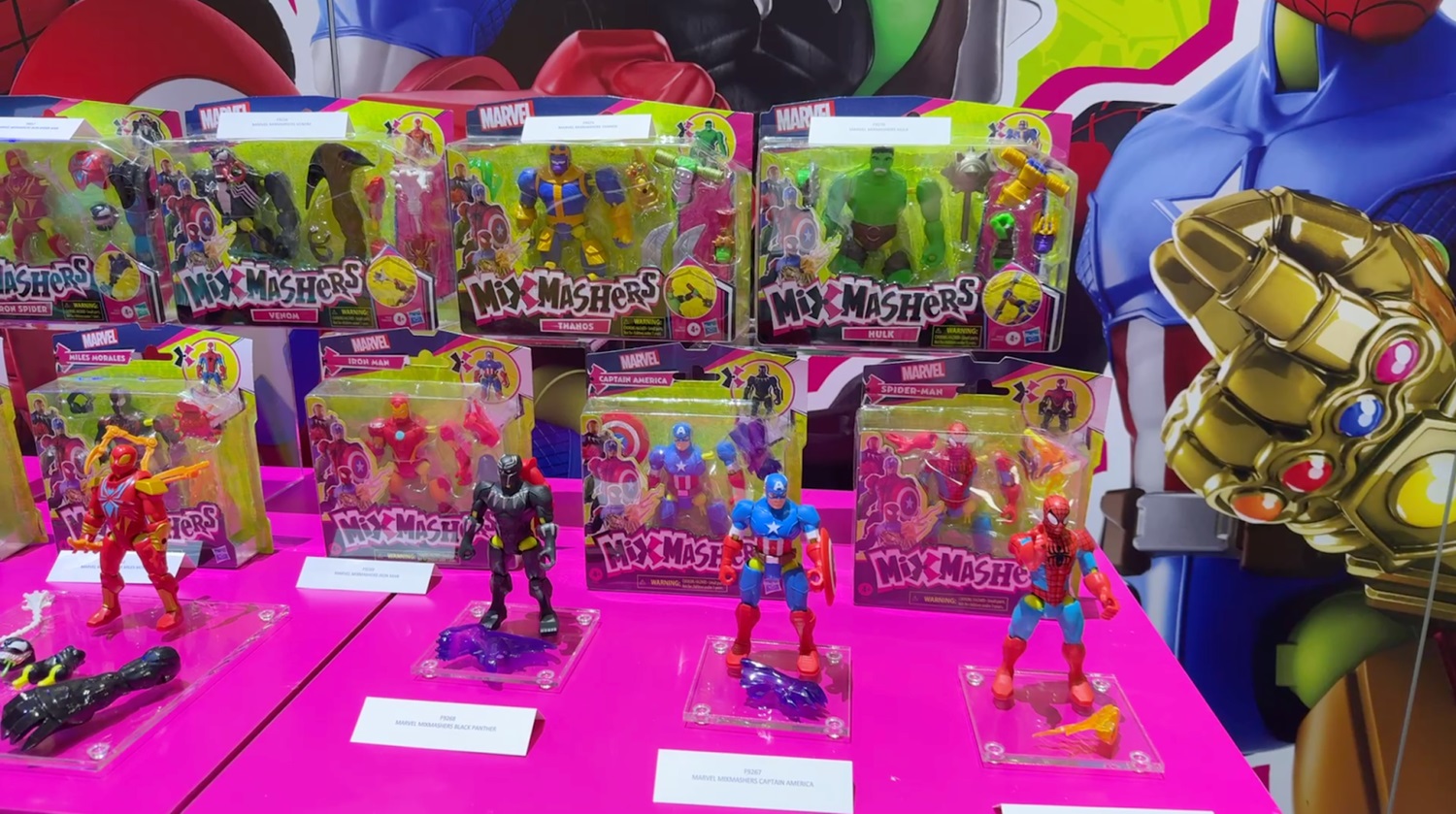A highlight of Hasbro’s 2025 Toy Fair lineup is the all-new MixMashers series, an innovative line of 5-inch action figures designed with 16 connection points, letting kids mix and match heads, limbs, accessories, and power parts across the entire collection. These chunky figures are built with universal connectors, making for durable and endlessly customizable play.
