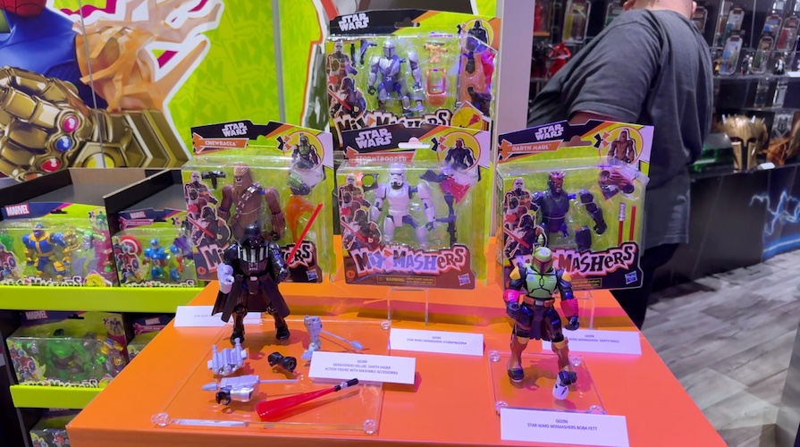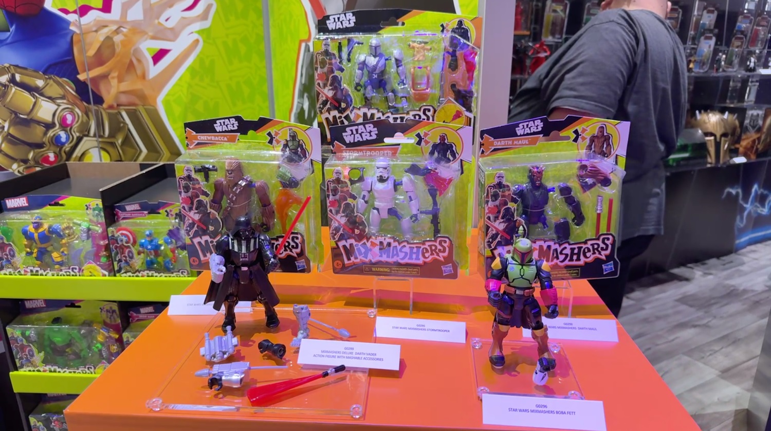 Standard MixMashers figures retail for $12.99 and include favorite characters from Marvel and Star Wars, such as Spider-Man, Miles Morales, Black Panther, Iron Man, Boba Fett, Chewbacca, Darth Maul, and Stormtroopers. Each figure comes with character-specific gear, like projectile accessories, armor pieces, or hybrid limbs inspired by other heroes and villains in the line.