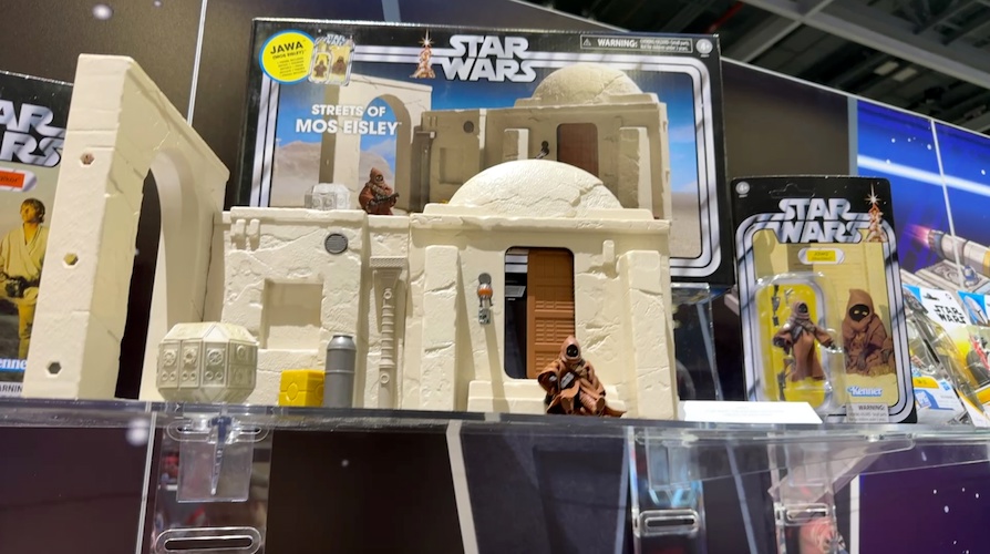 Playset collectors have the Streets of Mos Eisley display ($59.99), which comes with a Jawa and 11 accessories, offering an environment for Vintage Collection figures. All figures are priced at $16.99 to $24.99, with multi-figure sets and playsets ranging from $39.99 to $59.99.
