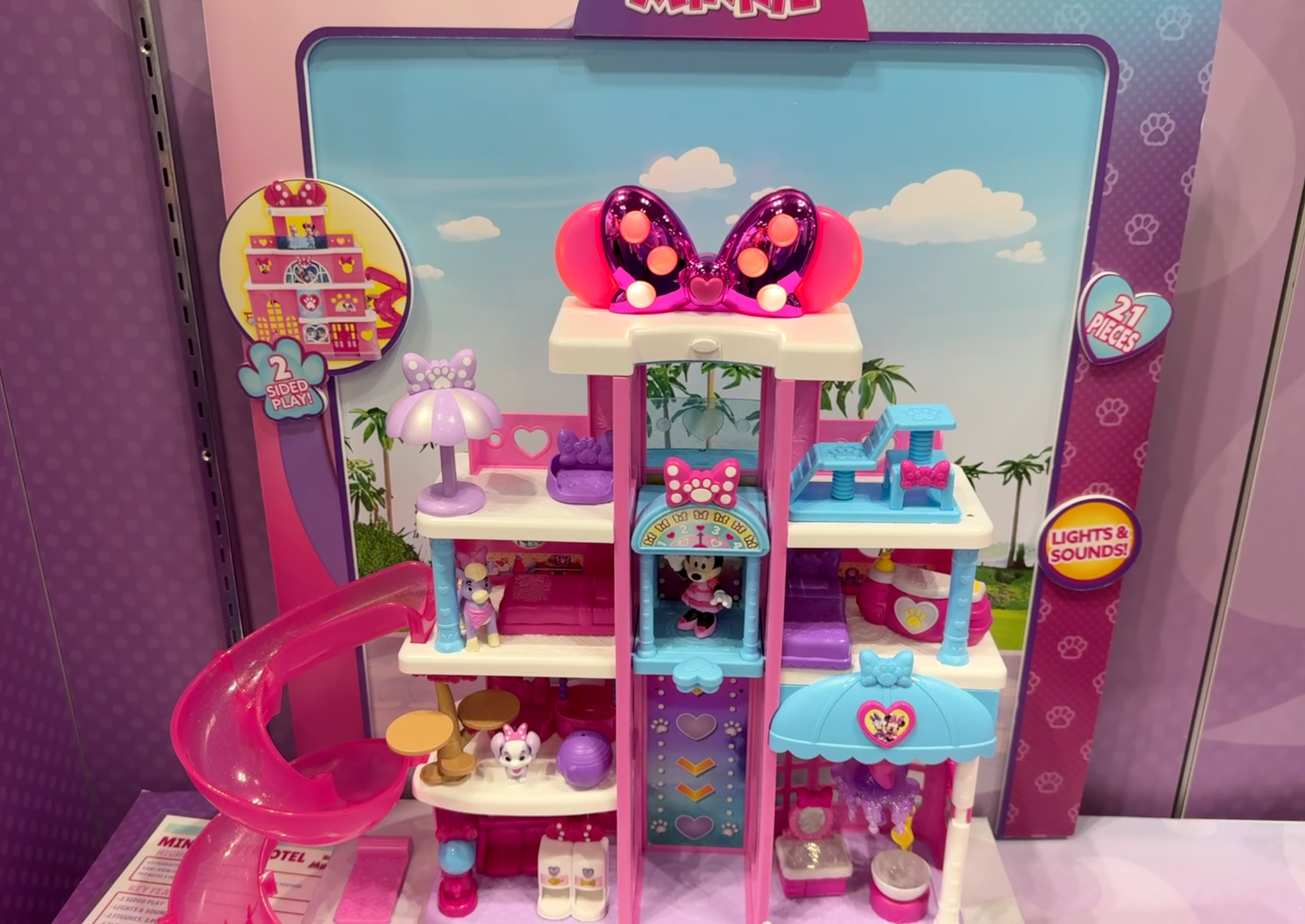 Disney Jr. Minnie Mouse Pet Hotel Playset offers a deluxe, four-story play experience inspired by Minnie’s Bow-Toons Pet Hotel, complete with rainbow lights, sounds, and Minnie phrases. Kids can explore guestrooms, dining spaces, a yoga studio, rooftop deck, playground, and spa while playing with poseable Minnie and Daisy figures plus three adorable pets. With a kid-powered elevator and built-in storage, this expansive set is priced at $64.99, recommended for ages 3+.