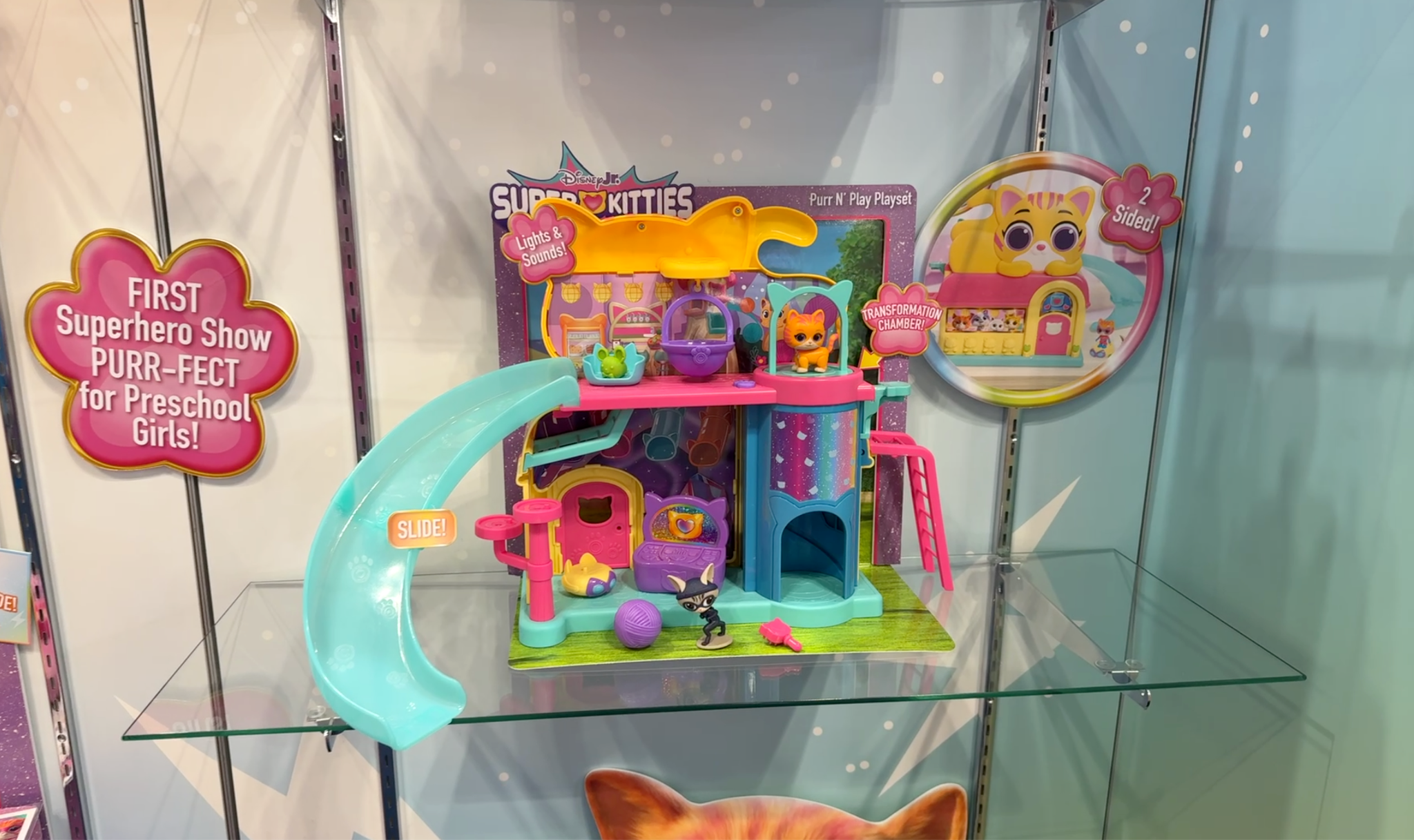 Disney Junior SuperKitties Purr ‘N’ Play Playset puts preschoolers right in the middle of Kittydale with a two-level playset packed with lights, phrases, music, and show-inspired sound effects. Unfolding to reveal 20 inches of play space, the set includes articulated Hero Ginny, Kitten Ginny, and Cat Burglar figures, plus accessories like the SuperKitty Kit, Mission Control monitor, and yarn ball. A standout feature is the transformation chamber, where kids can drop Kitten Ginny in and watch Hero Ginny emerge. Priced at $39.99, the playset is recommended for ages 3+.