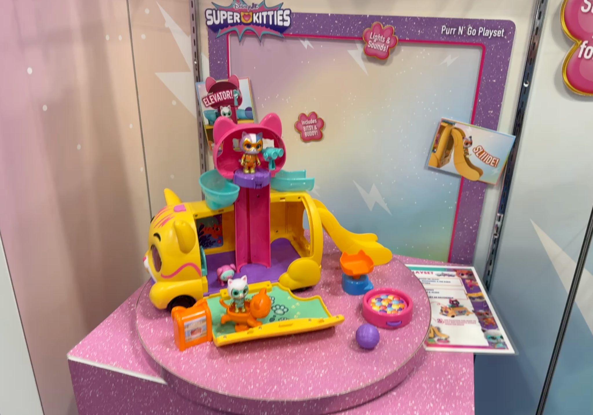 Disney Junior SuperKitties Purr ‘N’ Go Playset takes the adventure on the road with a colorful, cat-shaped vehicle featuring free-rolling wheels, a slide, elevator, lookout post, and interactive lights and sounds. The set includes articulated Bitsy and Buddy figures, robot pig pal Wiggles, and playful accessories like a ball pit, cat tower, and yarn ball for imaginative missions on the move. With built-in storage and rolling portability, the Purr ‘N’ Go Playset is priced at $39.97, designed for ages 3+.