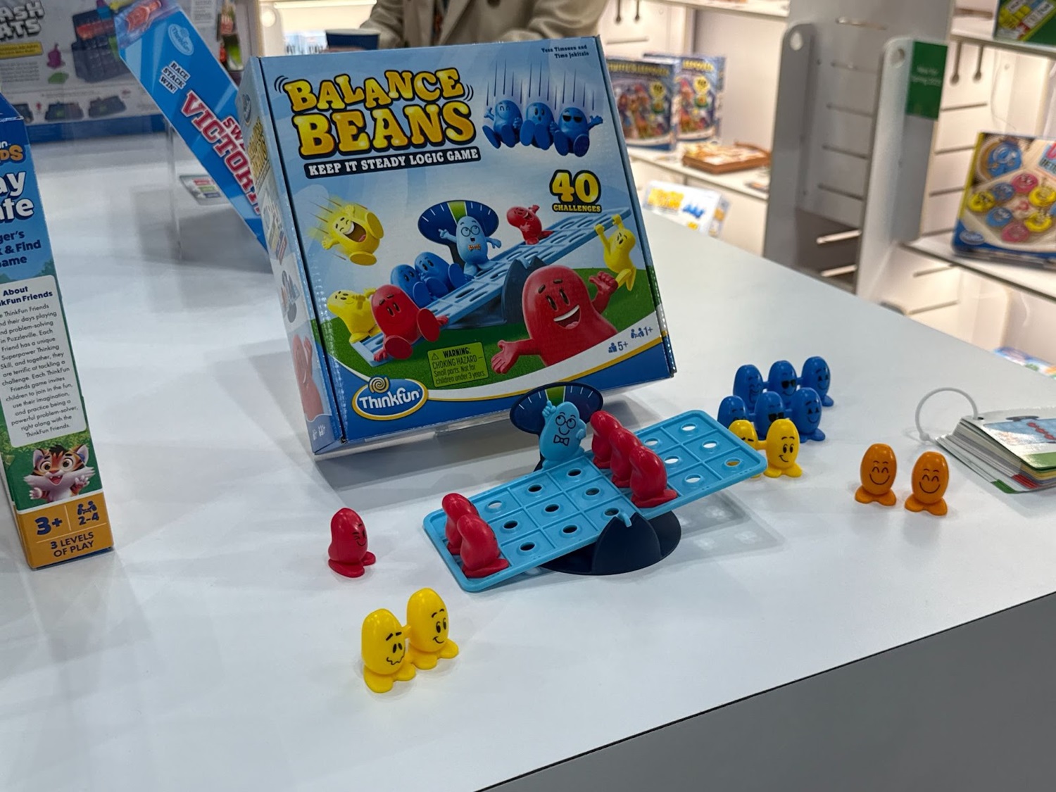 Balance Beans for ages 5 and up introduces algebraic math concepts. Cards pose challenges and kids use the required beans to get them to balance on the seesaw. Finding the balance also solves an equation!