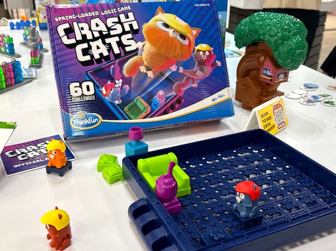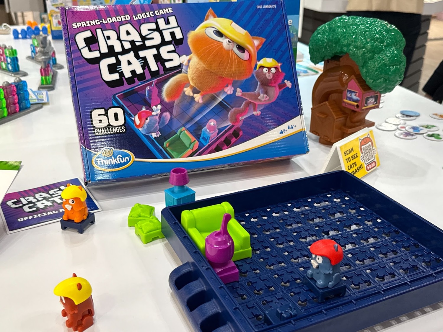 Another single-player game for ages 8 and up is Crash Cats, a kinetic obstacle course that sends cats flying! Thankfully, they’re all wearing a helmet. Set up obstacles courses, set the cats on their sliding base, and tilt the board to move them around until a spring-loaded trigger is activated, sending them flying!