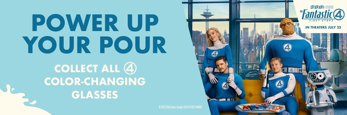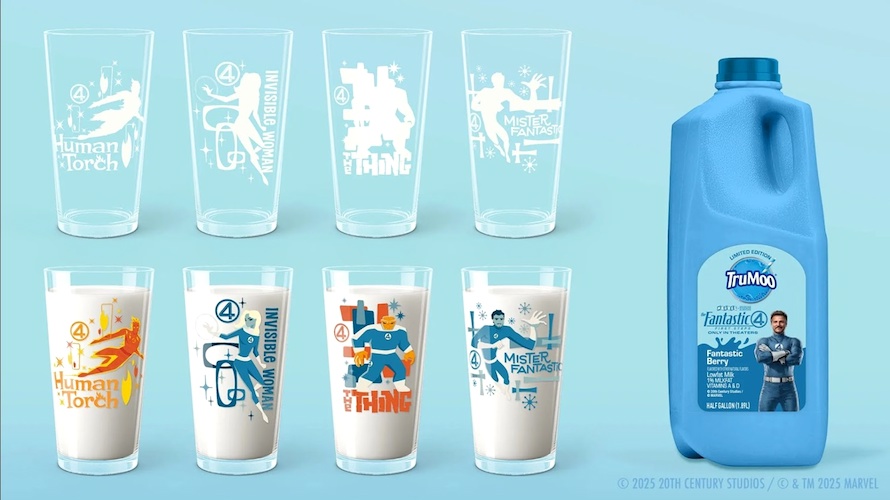 - TruMoo: “Power Up Your Pour! To celebrate the theatrical release of Marvel Studios’ ‘The Fantastic Four: First Steps’, in theaters July 25, Dairy Farmers of America is releasing exclusive ‘Power Up Your Pour’ collectible glasses that harness fantastic color-changing technology to make characters appear every time a cold glass of milk is poured. Each glass features a different hero from the Fantastic Four."