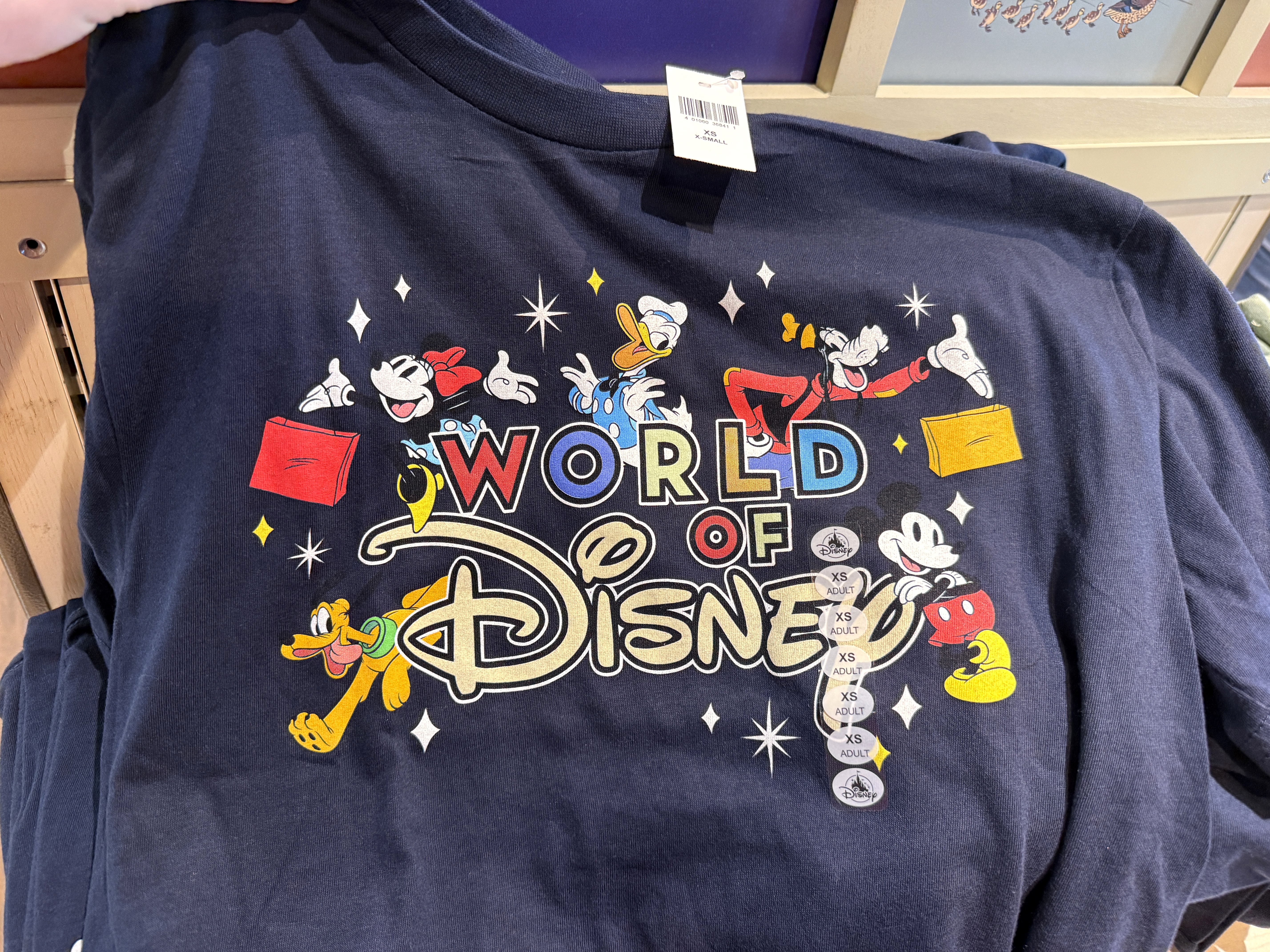 Yes, that's right. Now available at Disney Springs' flagship World of Disney store is a T-Shirt of the store itself! The navy blue shirt features the World of Disney logo, surrounded by Mickey, Minnie, Pluto, Donald and Goofy. Appropriately, Minnie and Goofy are also holding shopping bags.