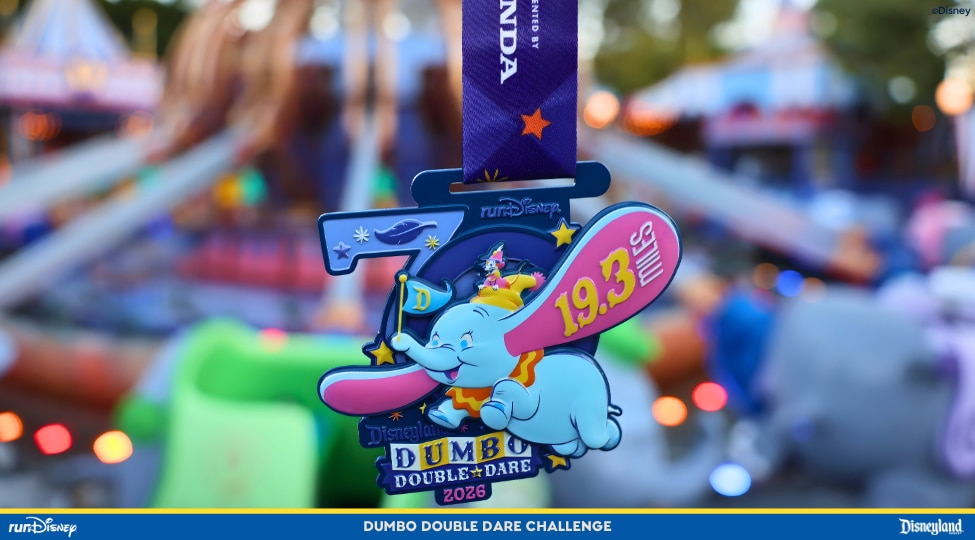 No surprise, given the name of this particular run, but Dumbo flies into adventure on the Dumbo Double Dare Challenge medal.