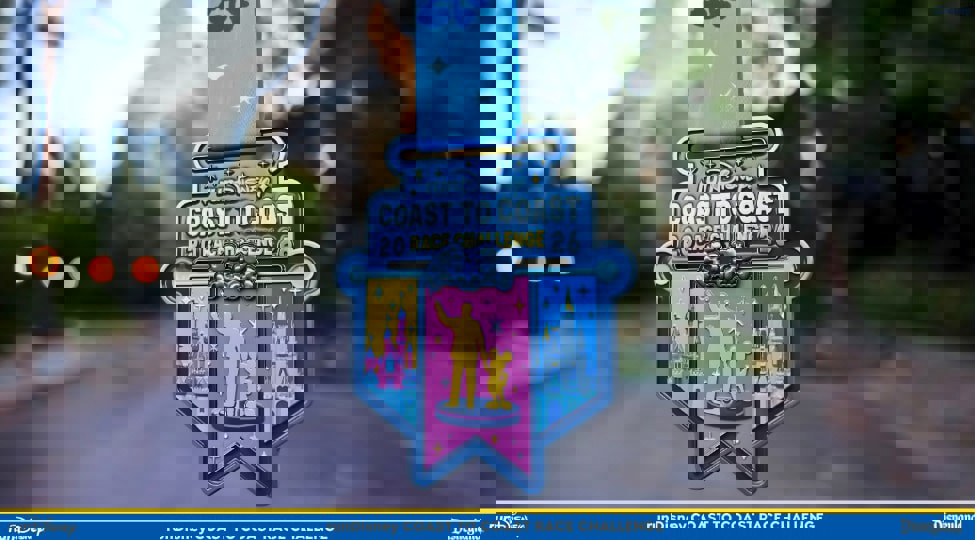 Disney Parks -- and the Walt and Mickey statue -- get the spotlight on the runDisney Coast to Coast Race Challenge medal.