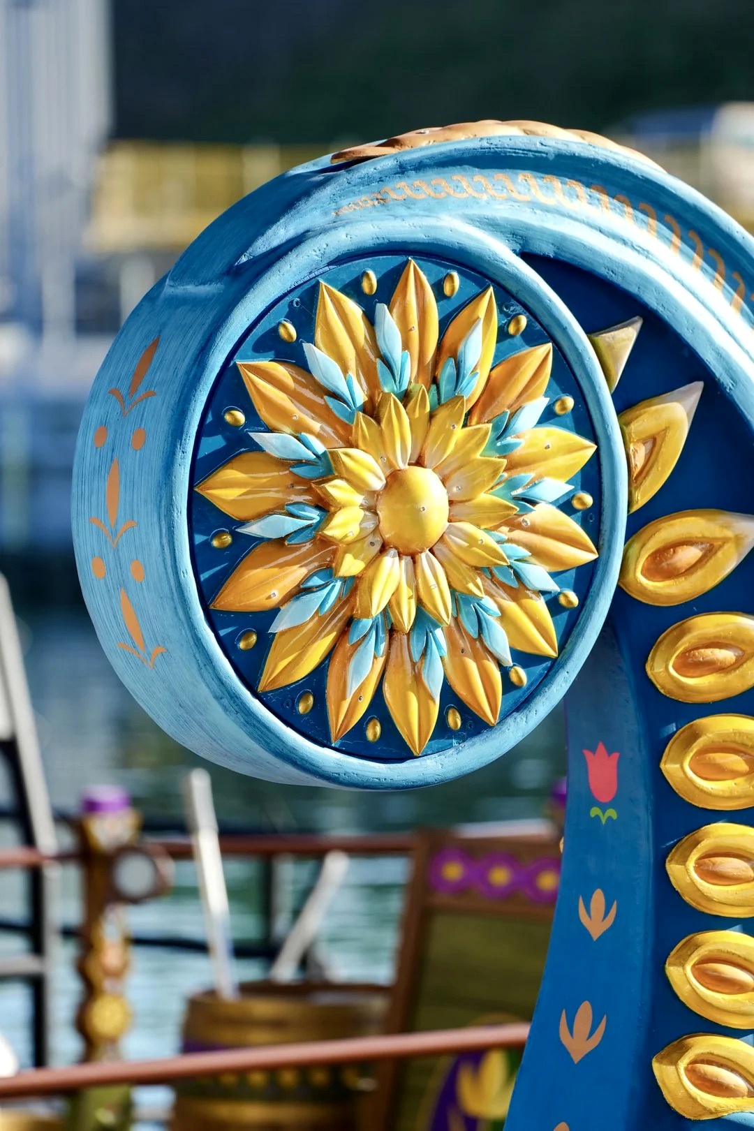 - Each boat has its own silhouette and aesthetic themed around different Frozen characters – for example, Kristoff’s boat features Arendelle’s official colors and emblem: the crocus, a symbol of renewal. Its most striking feature, though, is the bow, whose shape evokes an iconic figure of Arendelle.