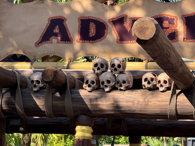 - Now, the sign is back, seeing no major changes, aside from a general refreshment. Guests can still see the tribal headwear and skulls as they cross into the land of adventure.