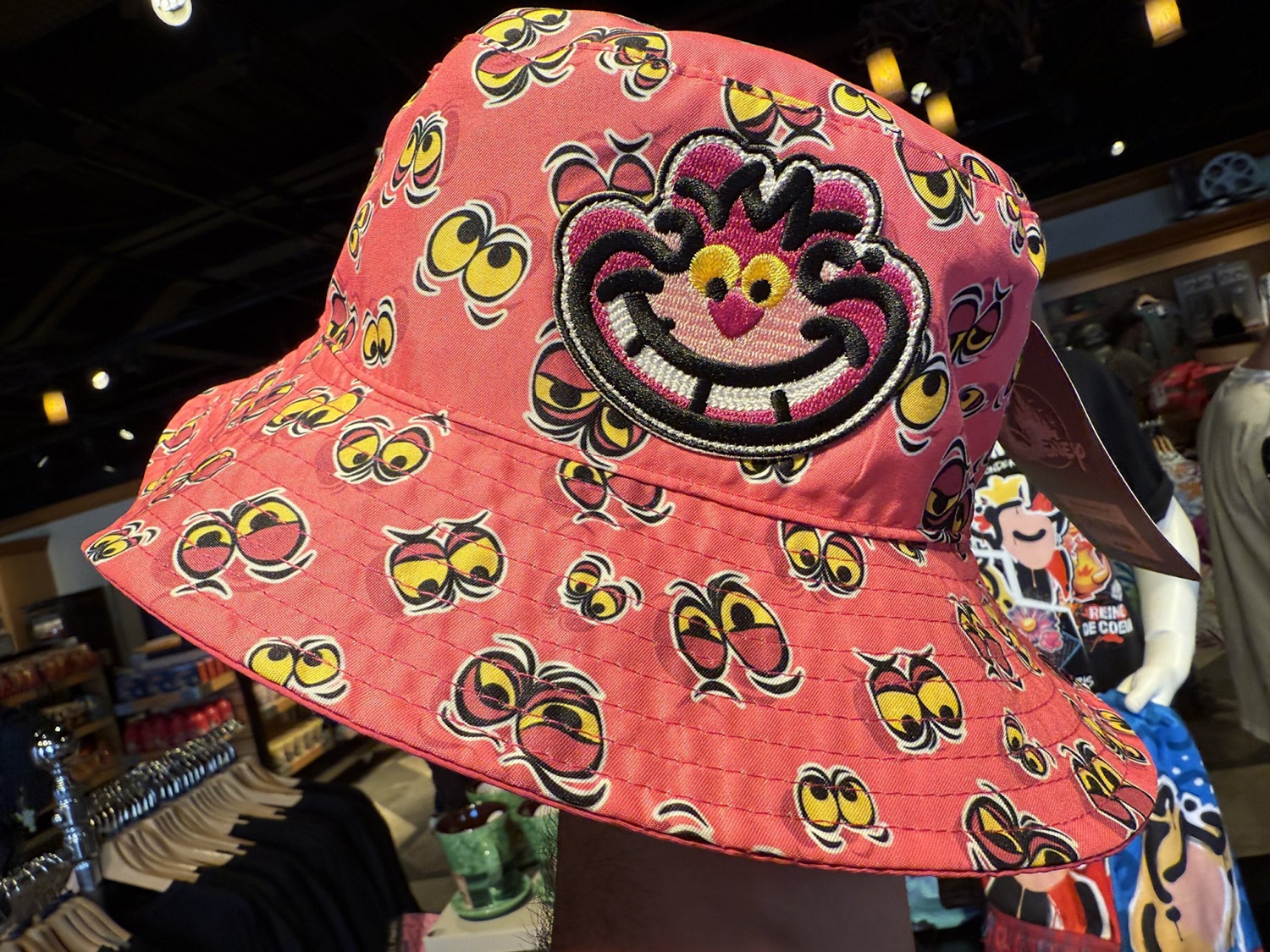 - Topping off the new items, a new Cheshire Cat-inspired bucket hat features a bold pink all-over print design with an embroidered patch of the character on the front.