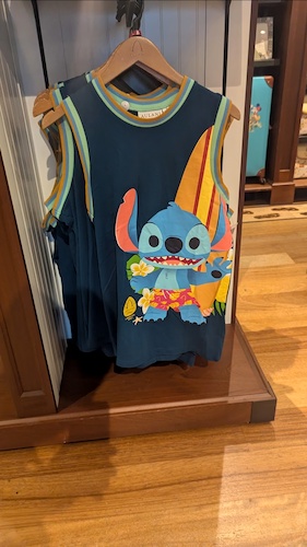 Of course the standout apparel as the requisite Spirit Jersey option, this one featuring the resort name along with a stylized version of Stitch, appropriately decked out for the location. There is also a cabana-style button down shirt that also features the character with the Aulani logo.