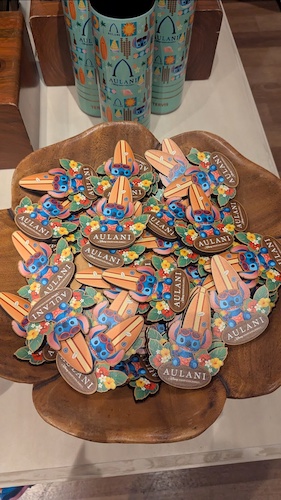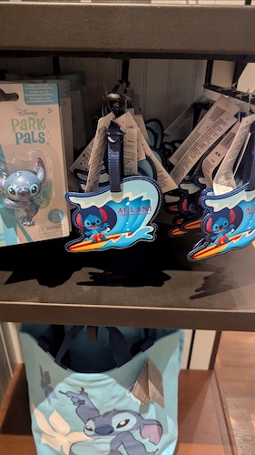 The design motif of a stylized Stitch in beach garb also carries over to a number of items and accessories, including a magnet, luggage tags, water bottles, pins, and more at the location.