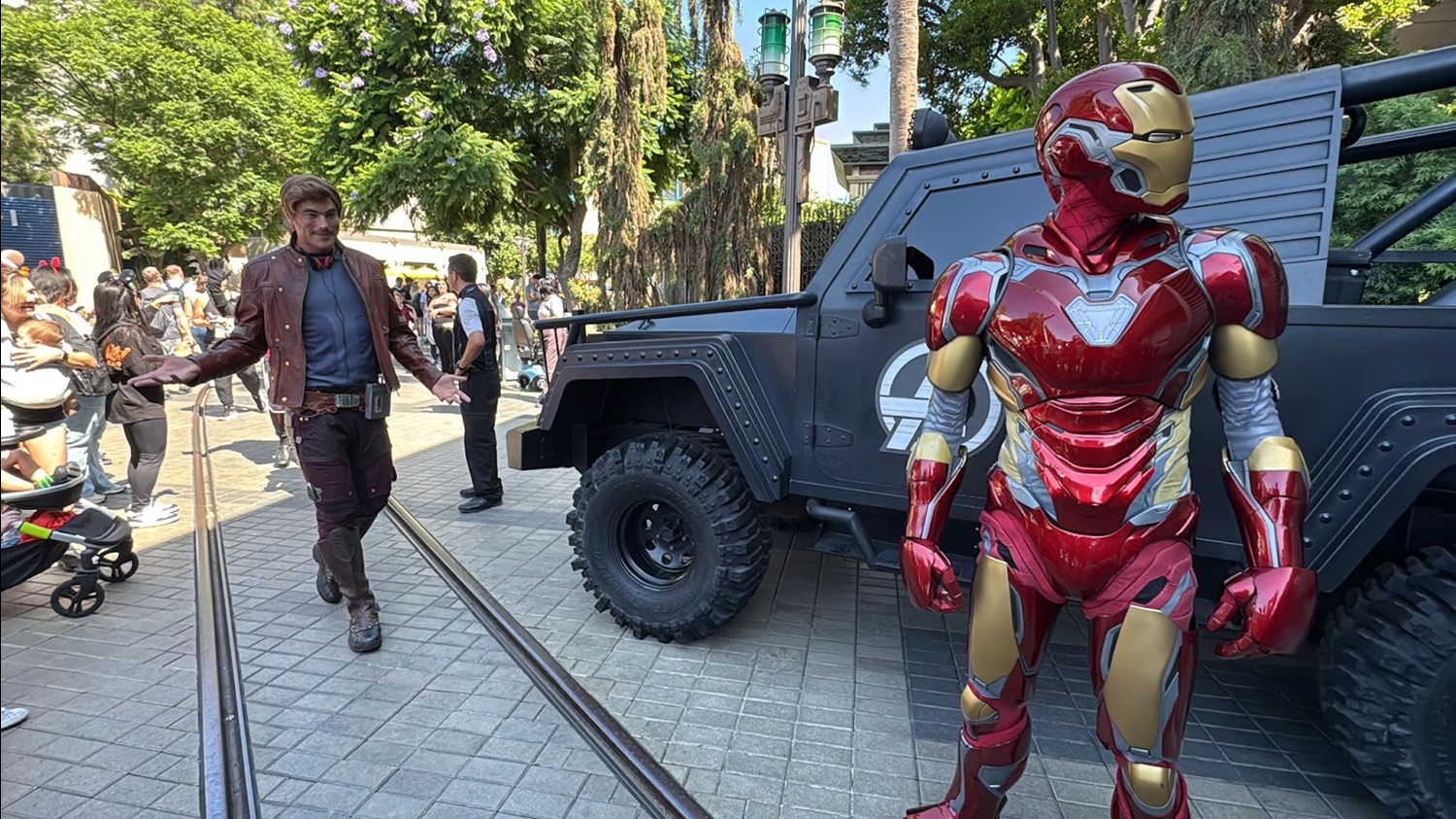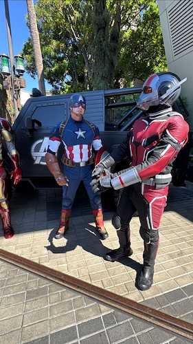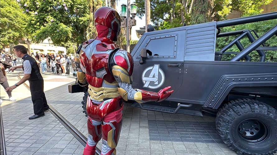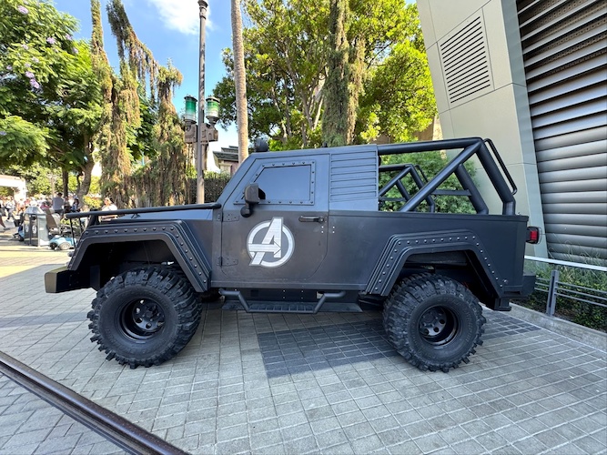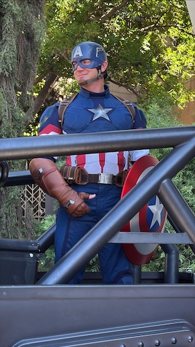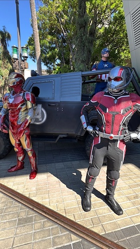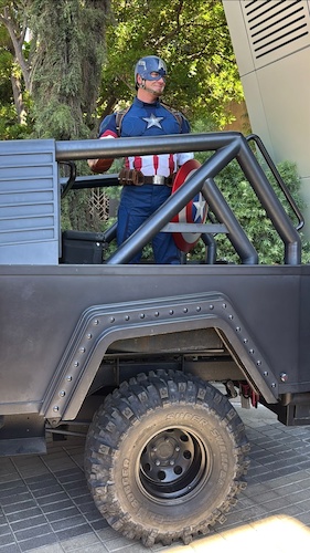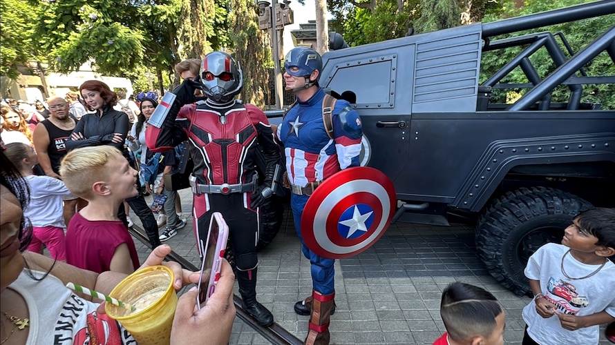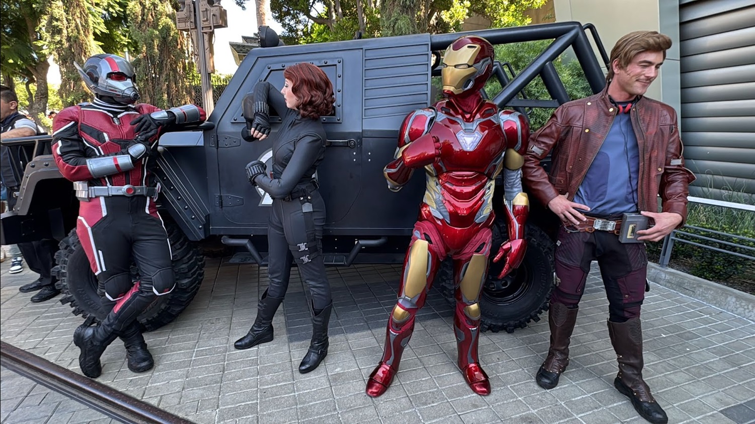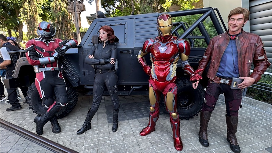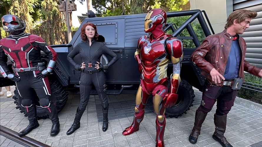 A new superhero character moment is currently taking place at regular intervals at Avengers Campus in Disneyland Resort’s Disney California Adventure theme park. Different combinations of Marvel heroes (depending on who is around at the time, I’m guessing) will gather around the Avengers’ jeep vehicle, pose for a group shot, and then interact with guests in the immediate area.