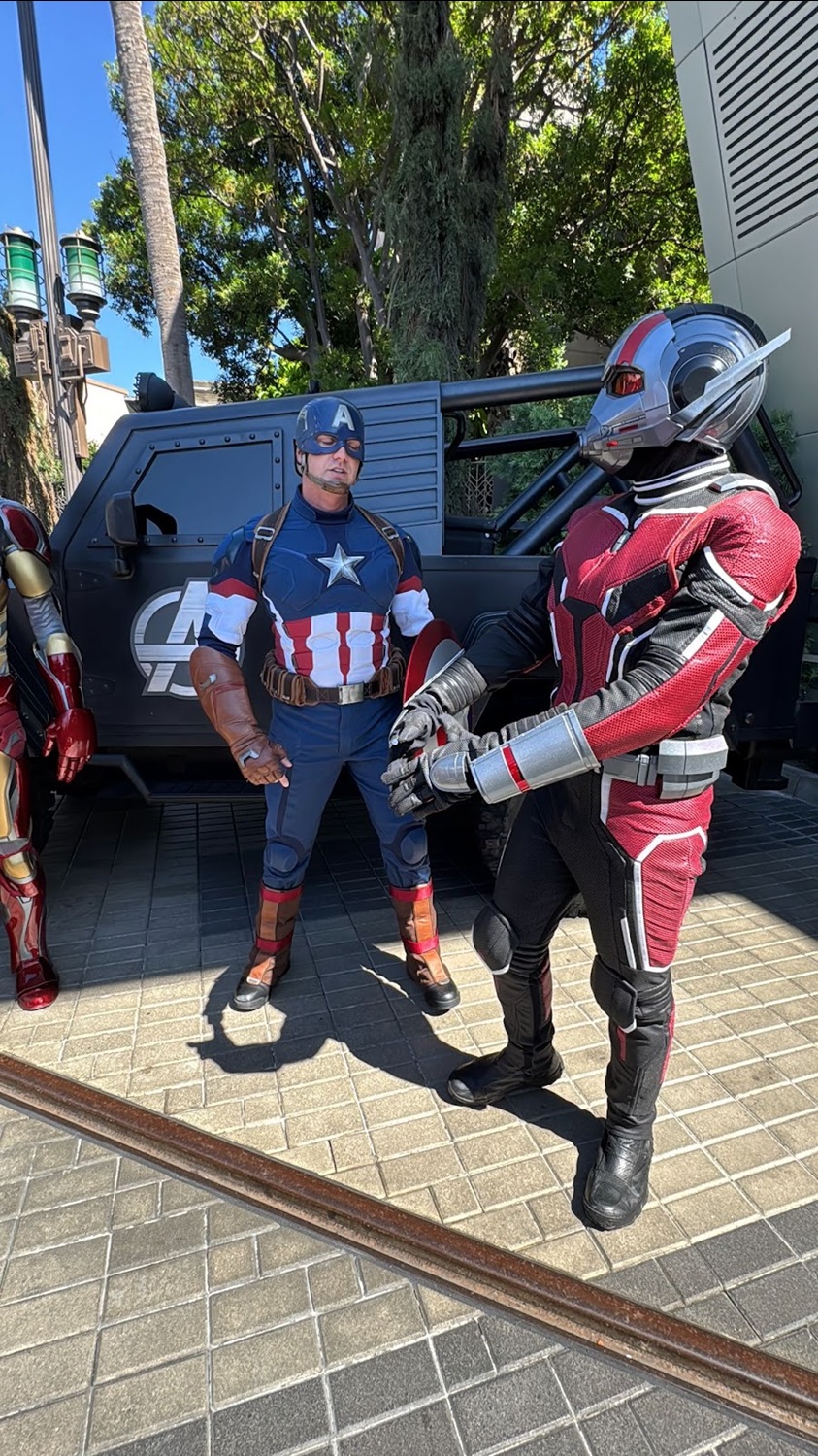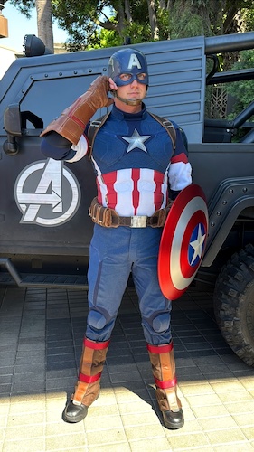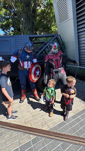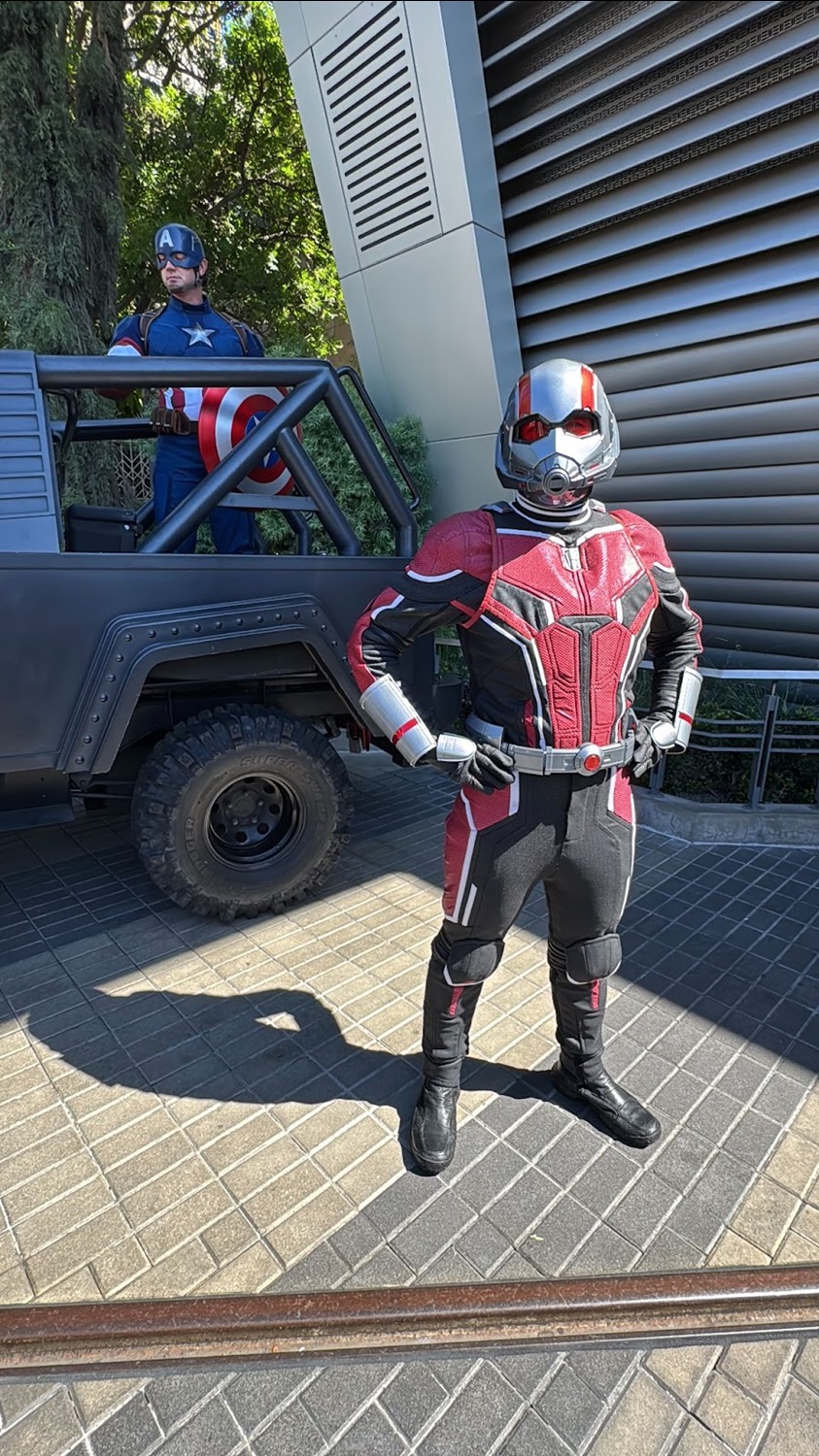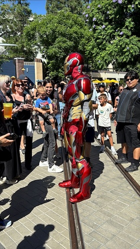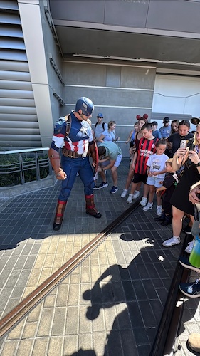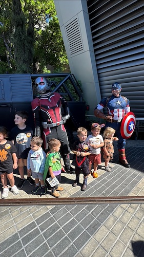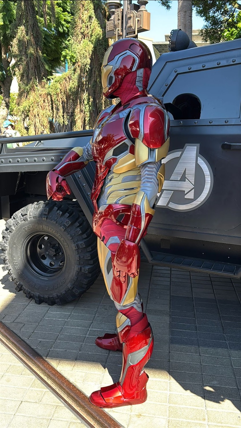 A new superhero character moment is currently taking place at regular intervals at Avengers Campus in Disneyland Resort’s Disney California Adventure theme park. Different combinations of Marvel heroes (depending on who is around at the time, I’m guessing) will gather around the Avengers’ jeep vehicle, pose for a group shot, and then interact with guests in the immediate area.
