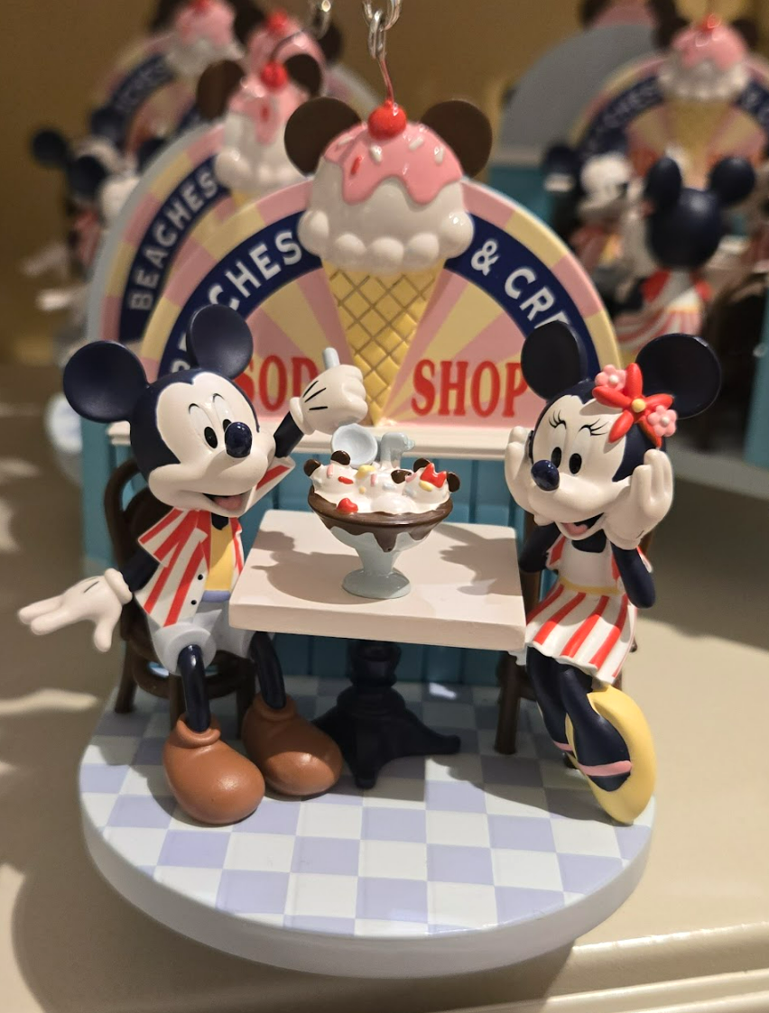 A sculpted ornament depicting Mickey and Minnie Mouse sharing a romantic moment over a "Kitchen Sink" sundae at a Beaches & Cream table, complete with the restaurant's iconic pastel backdrop. $26.99