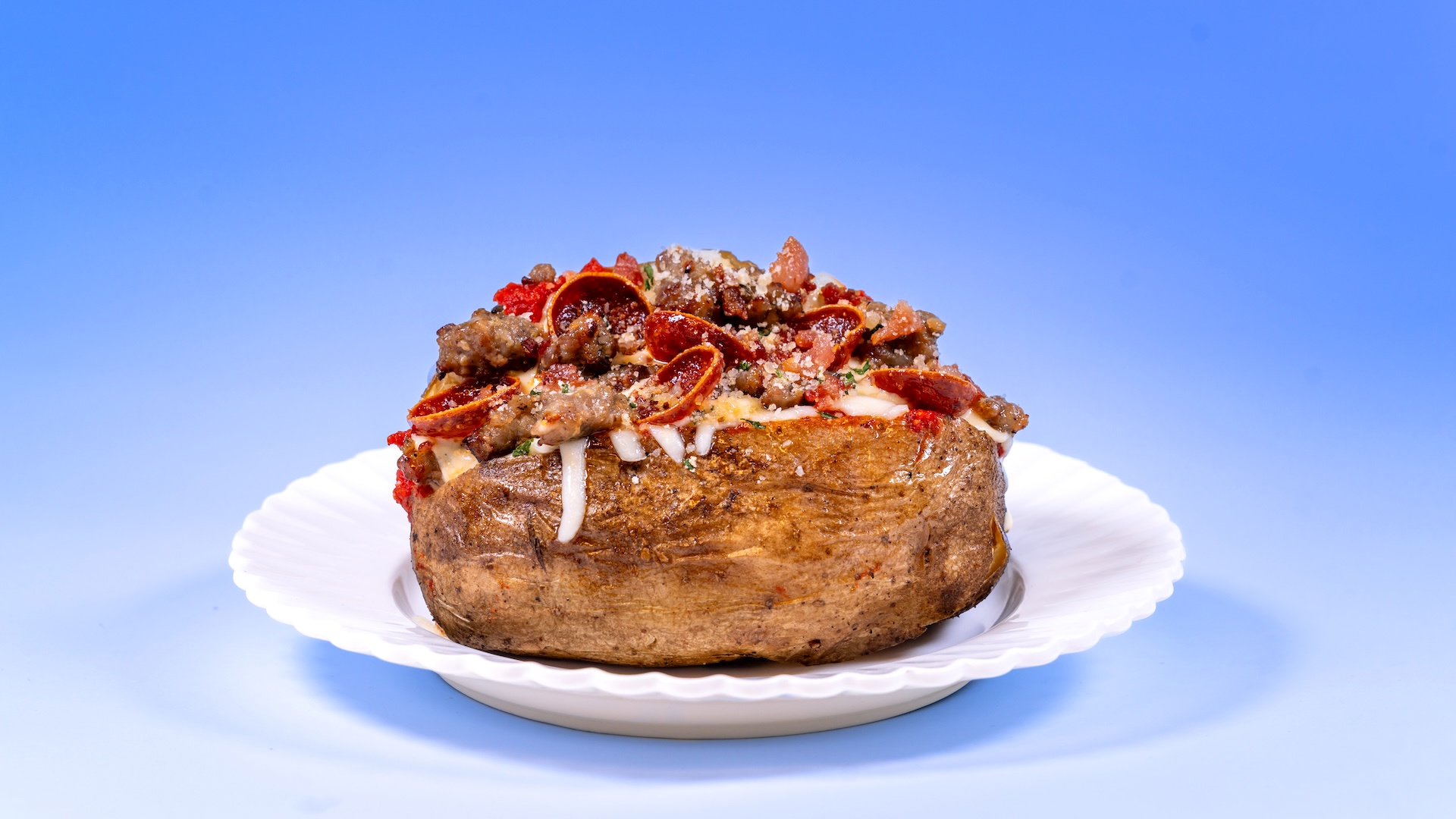 - Pizza Girls Baked Potato: Pepperoni, sausage, bacon bits, marinara, mozzarella, alfredo sauce, and parmesan herb topper (New)