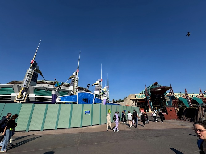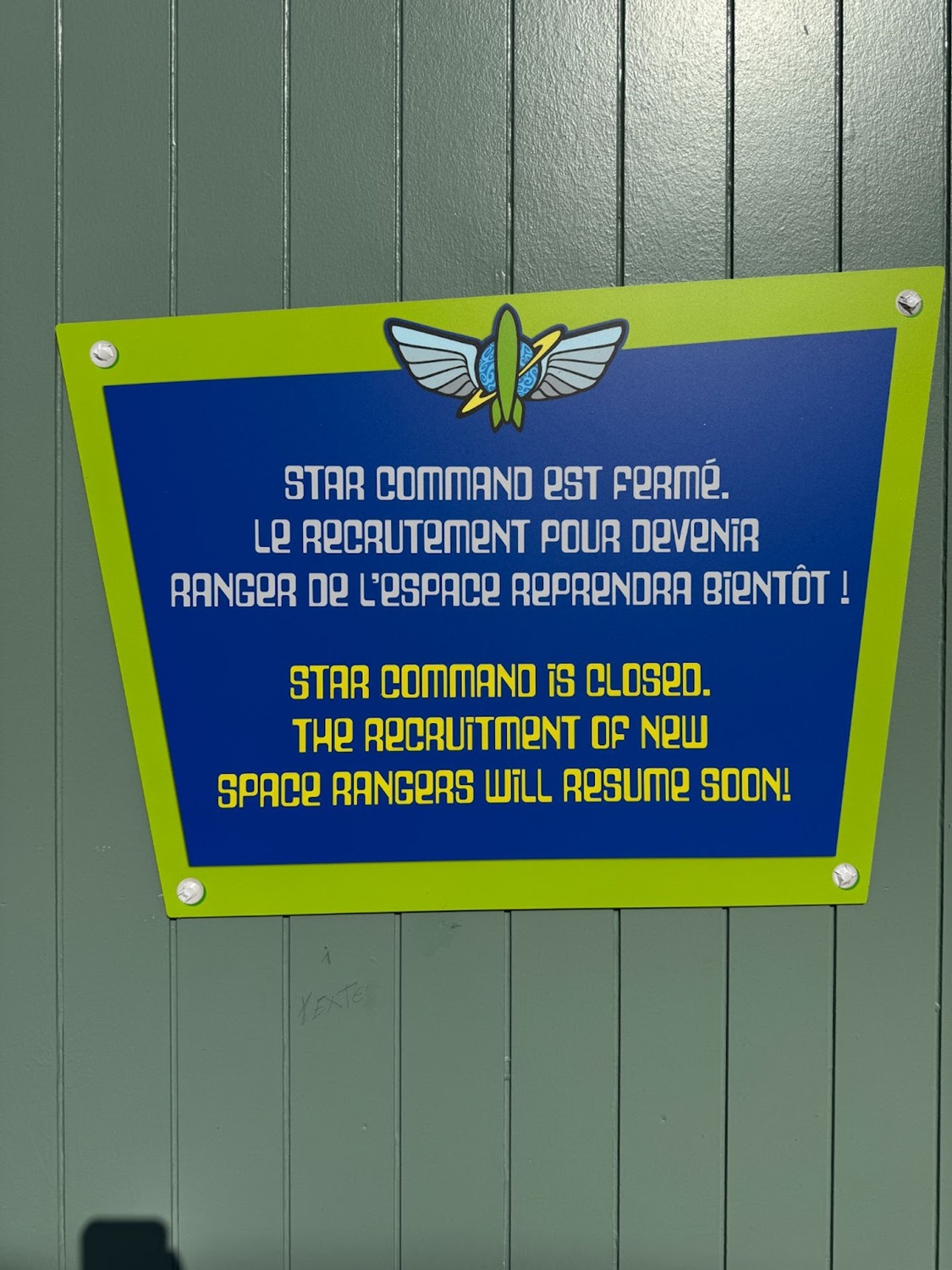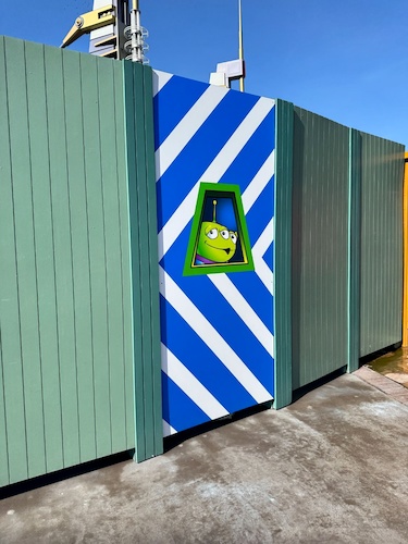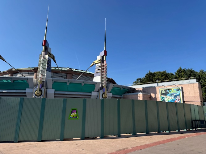 The construction walls around the attraction have artwork of the Little Green Men and a sign stating that “Recruitment of new Space Rangers will resume soon!"