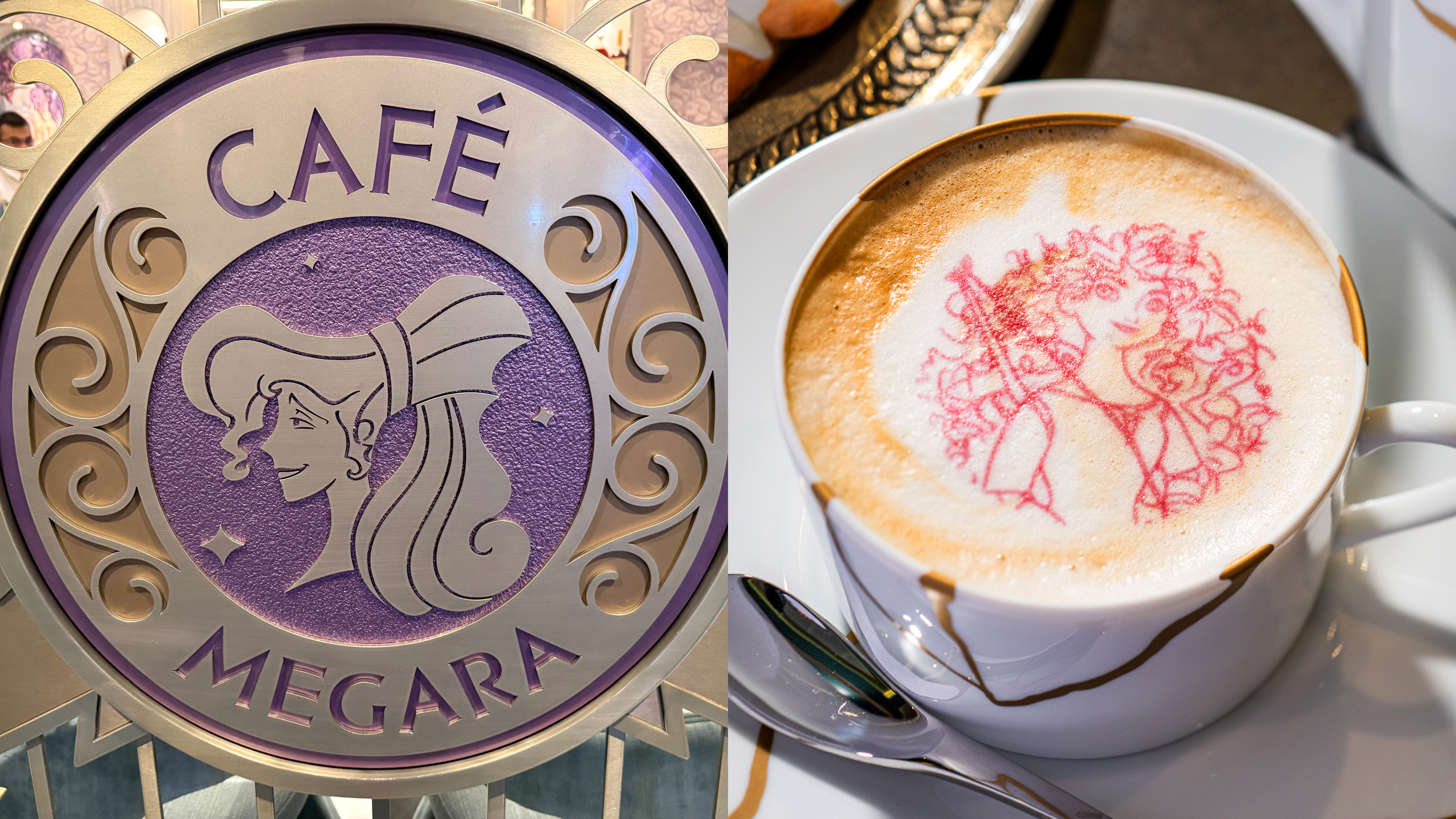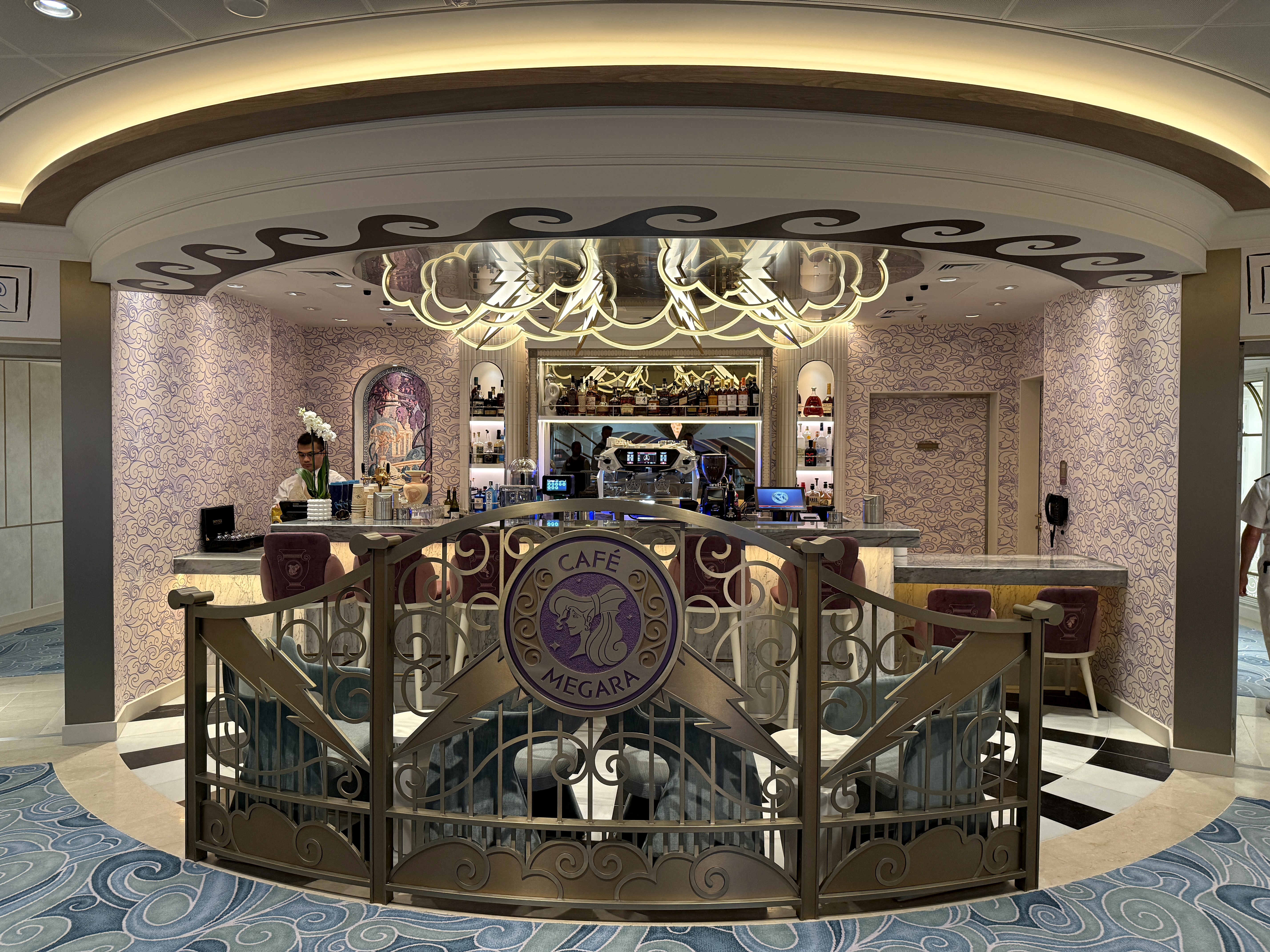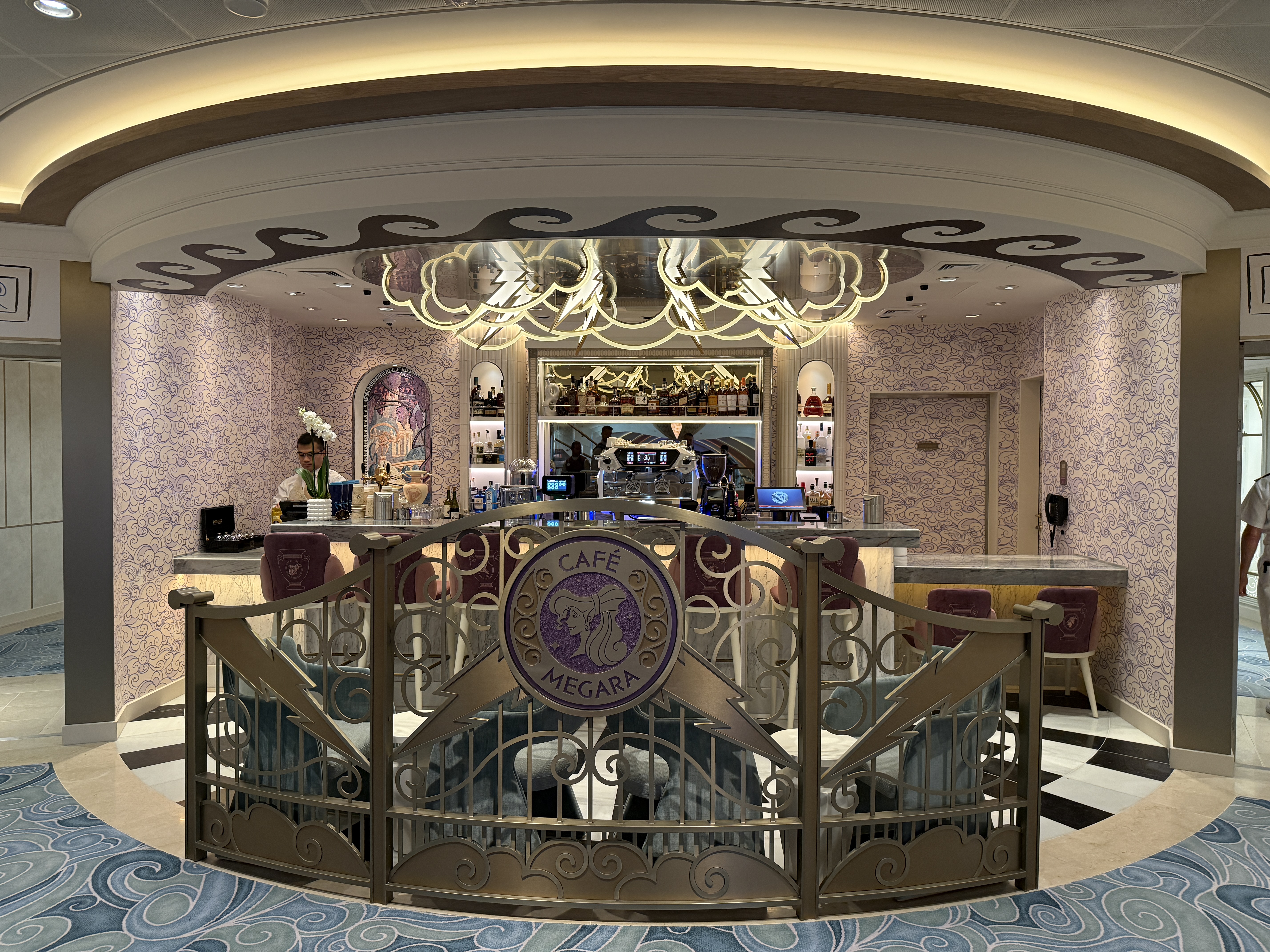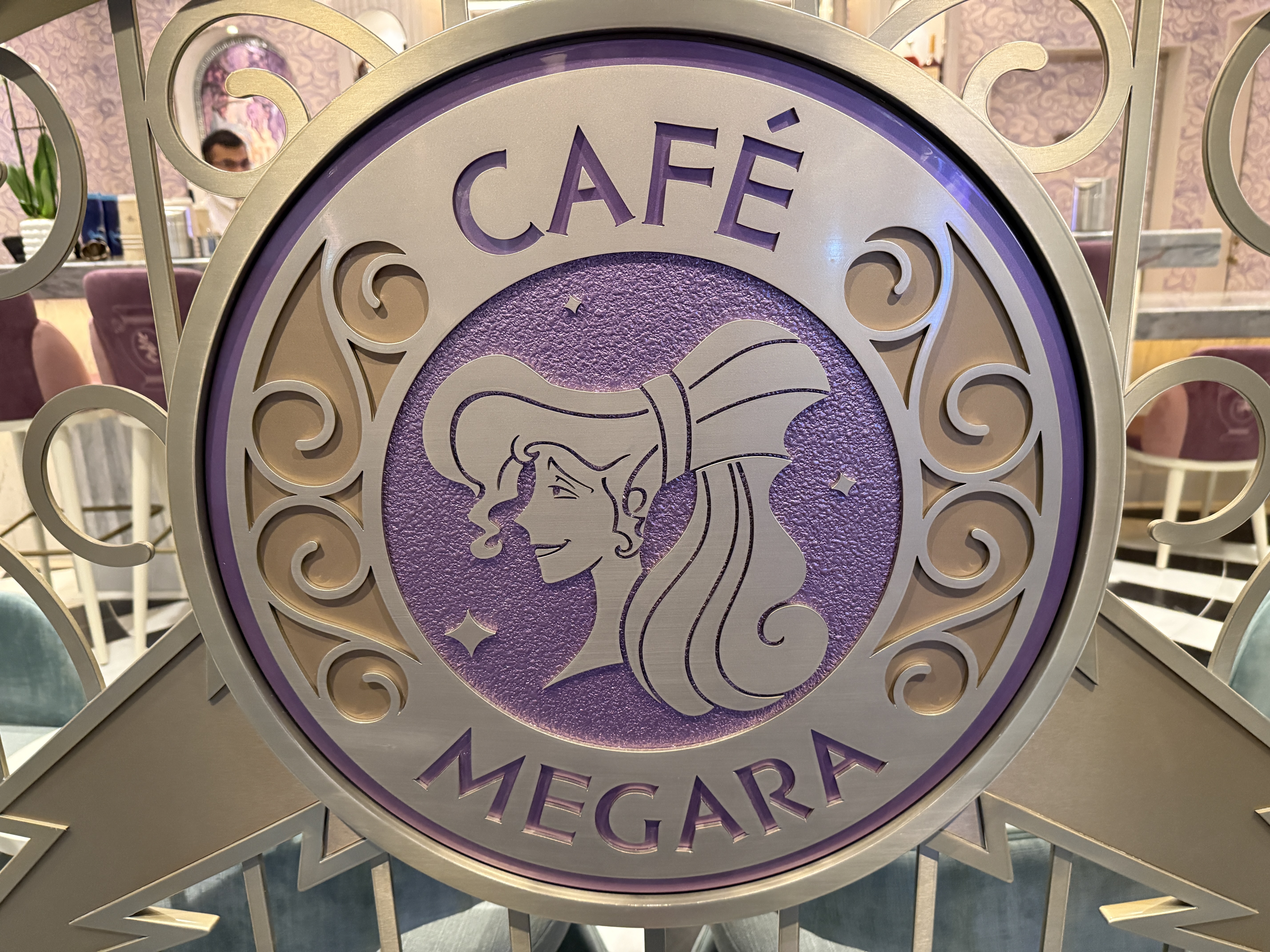 The first is Cafe Megara, themed to the girl who can't say she's in love from Hercules. Located on Deck 4, this cafe features Greek-inspired design elements straight out the film.