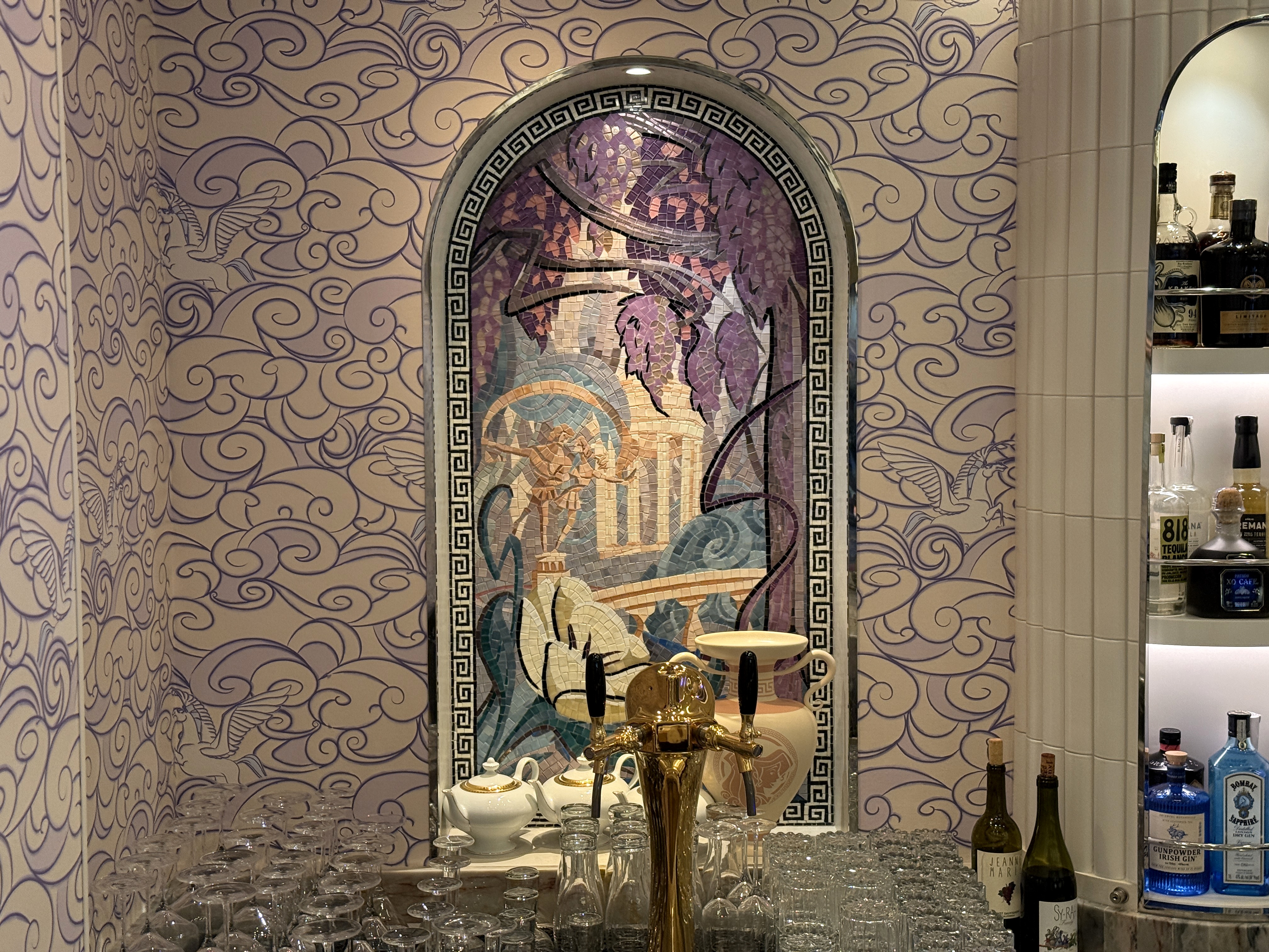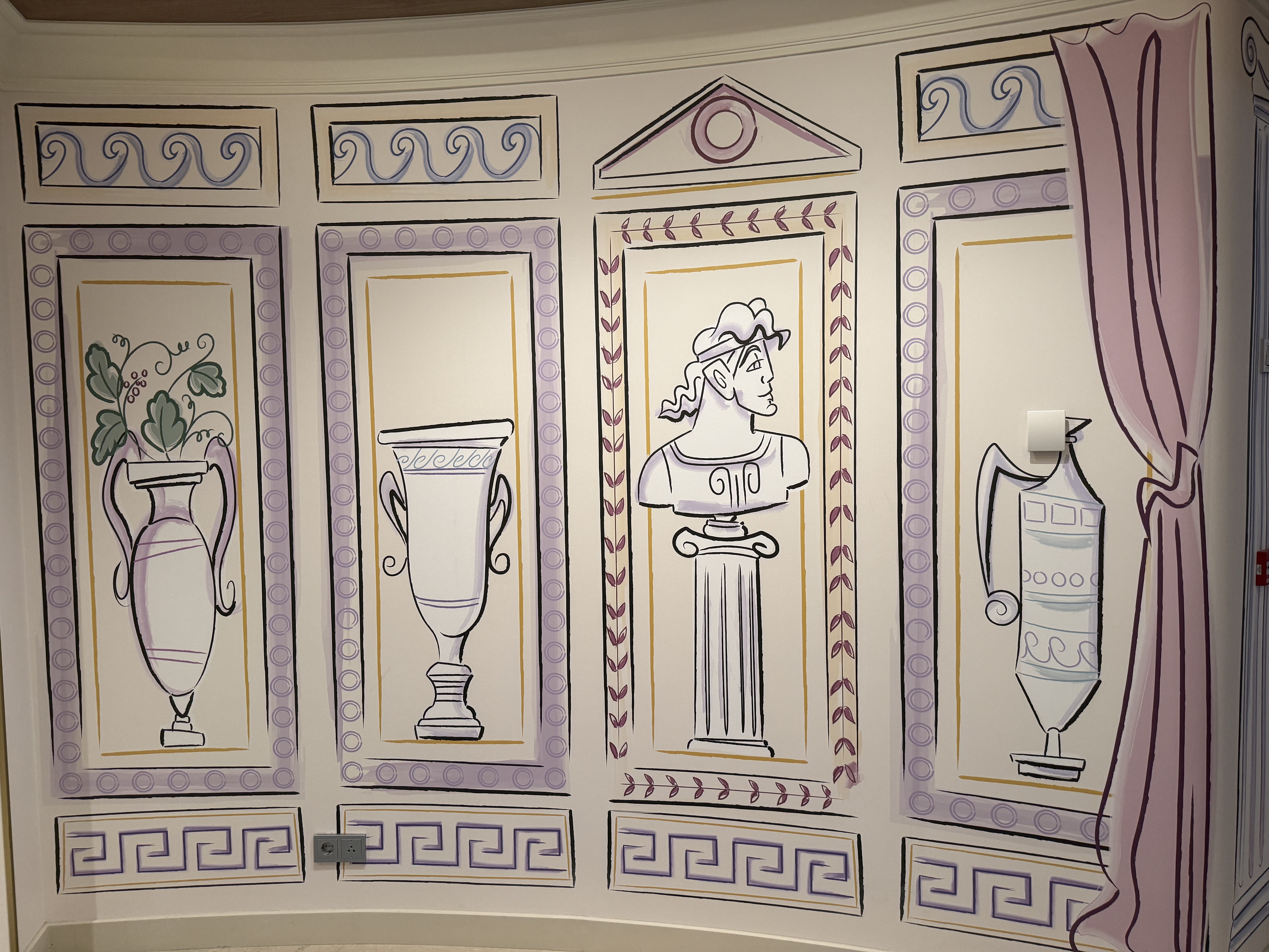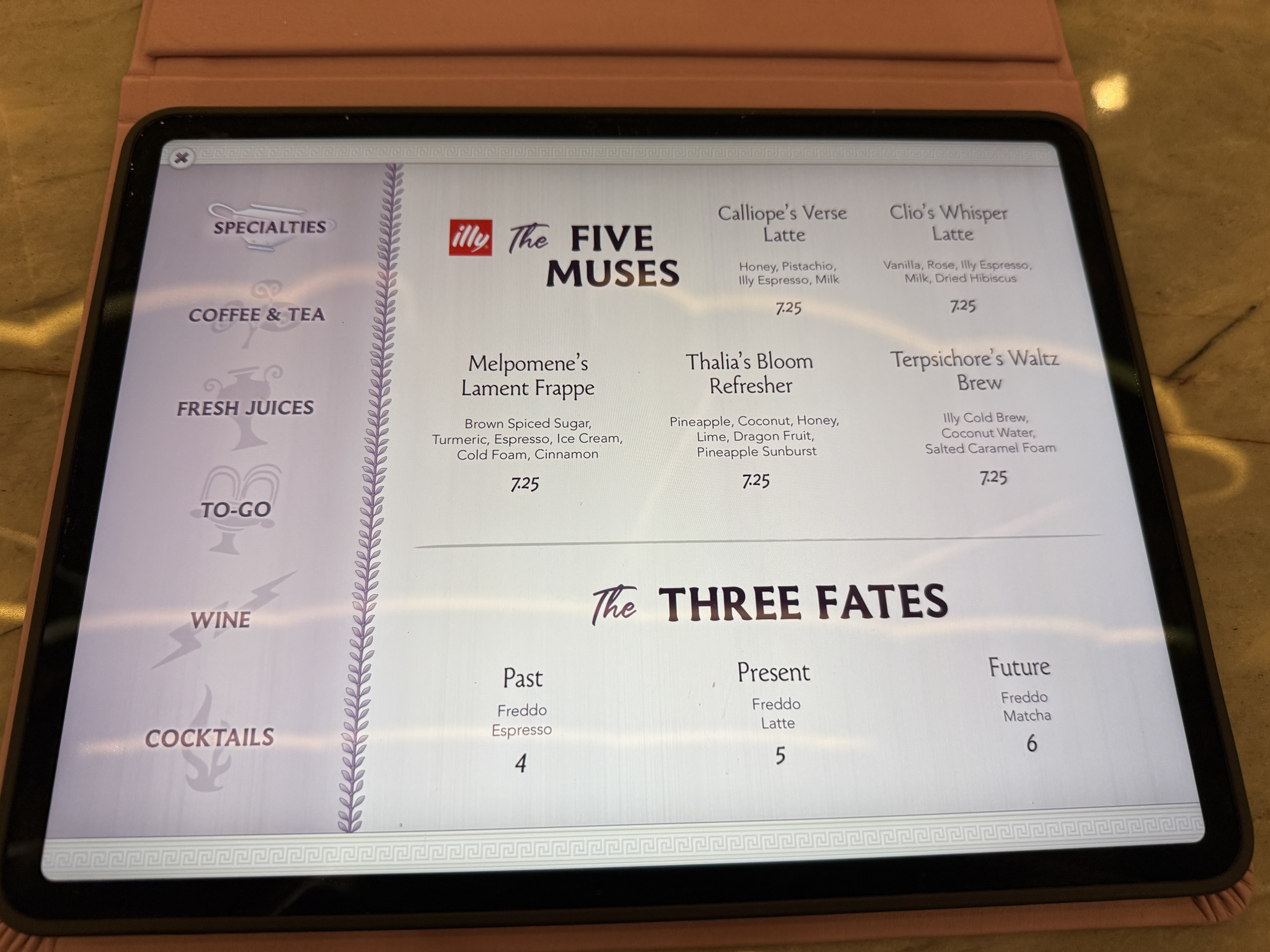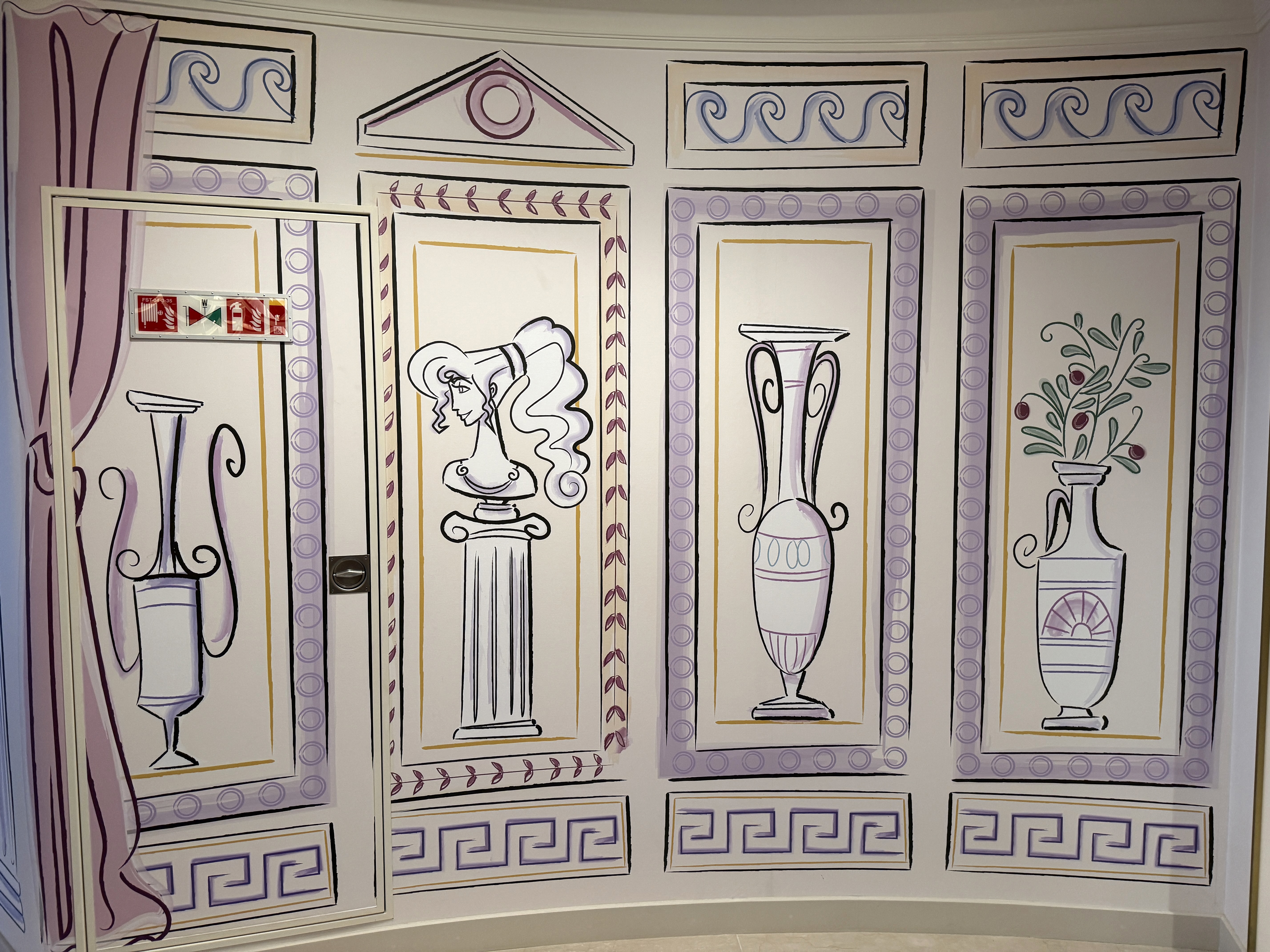 The first is Cafe Megara, themed to the girl who can't say she's in love from Hercules. Located on Deck 4, this cafe features Greek-inspired design elements straight out the film.