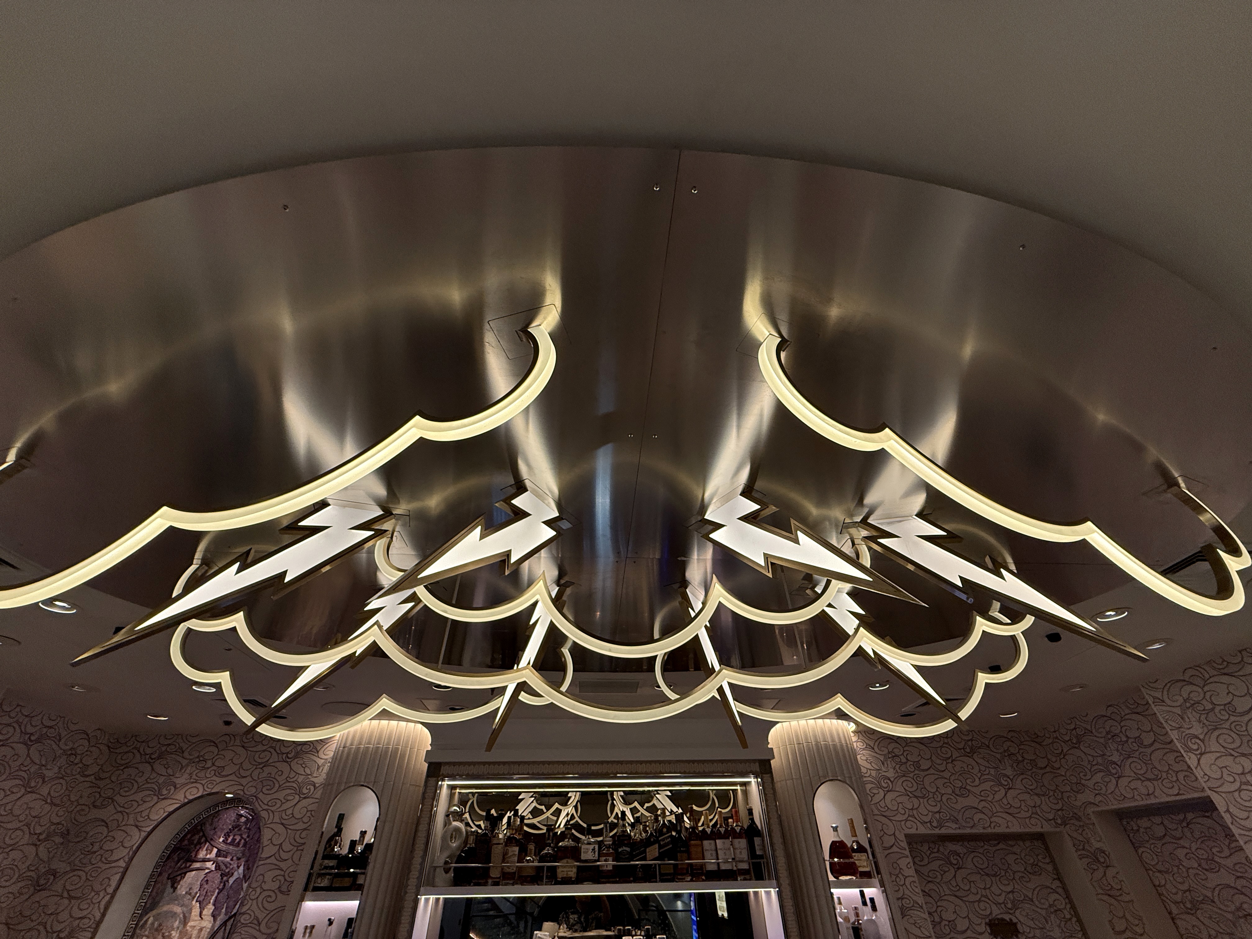 This beautiful tile artwork sits to the side, while lightning bolt-shaped lights can be found overhead.