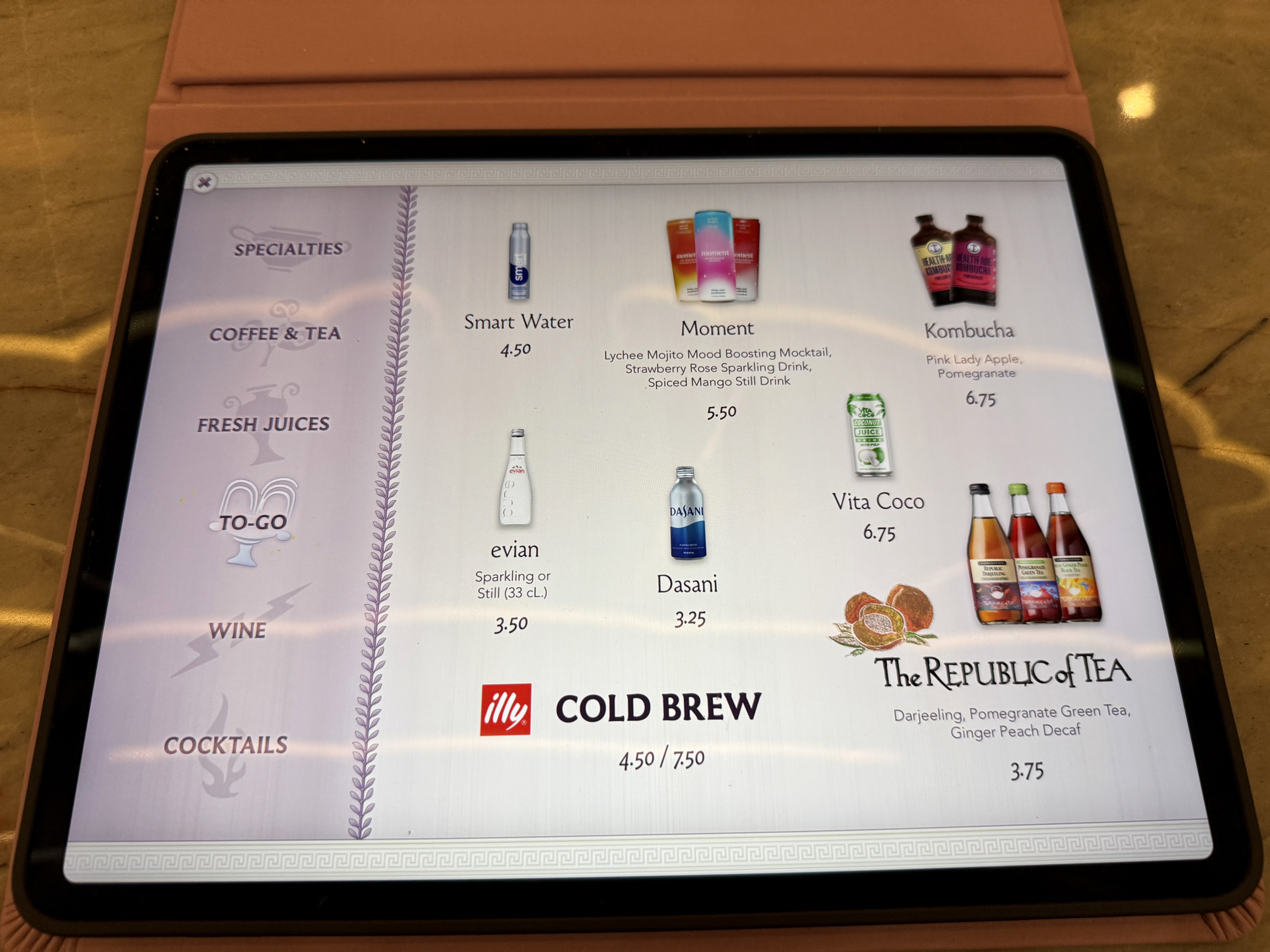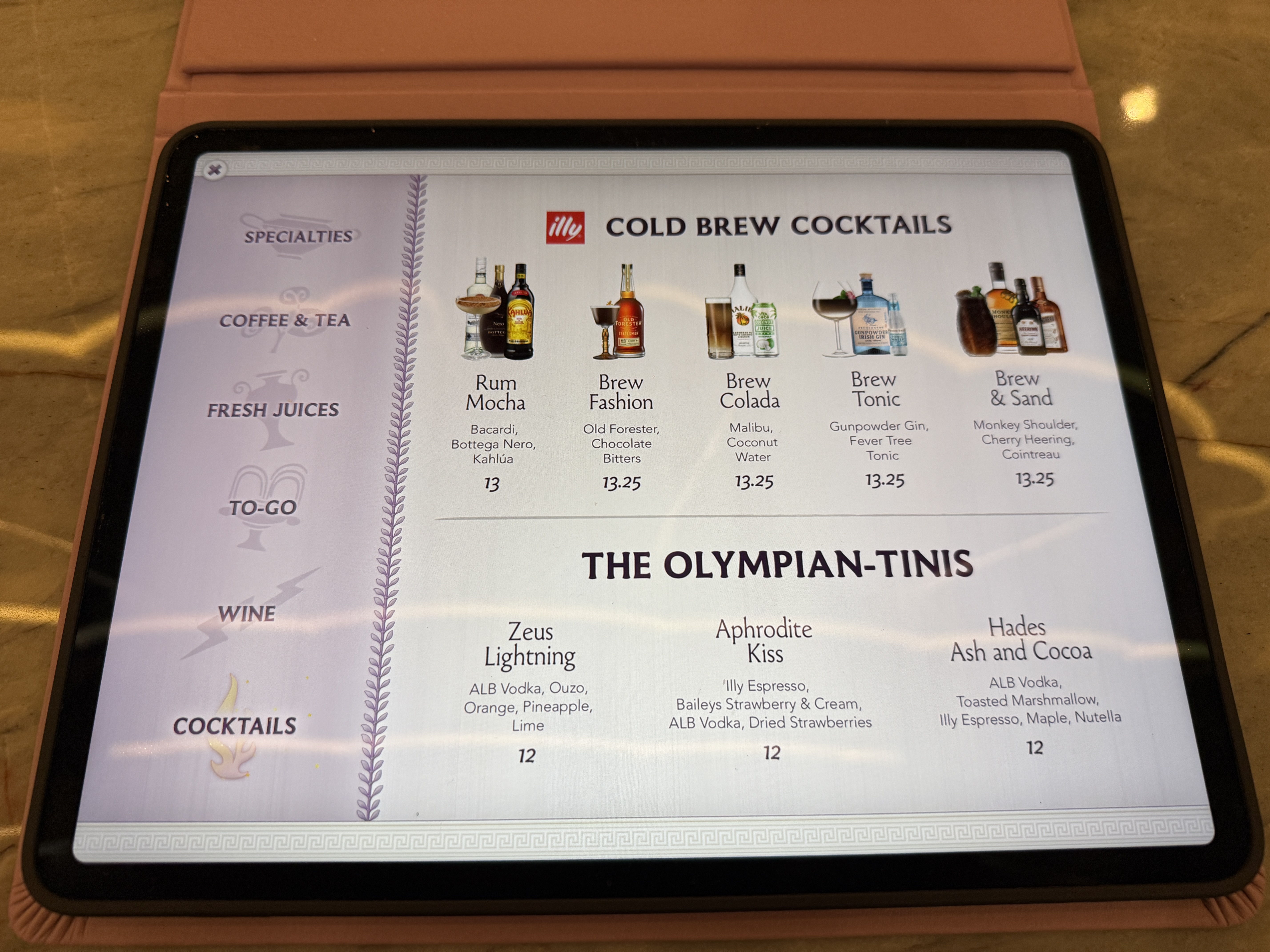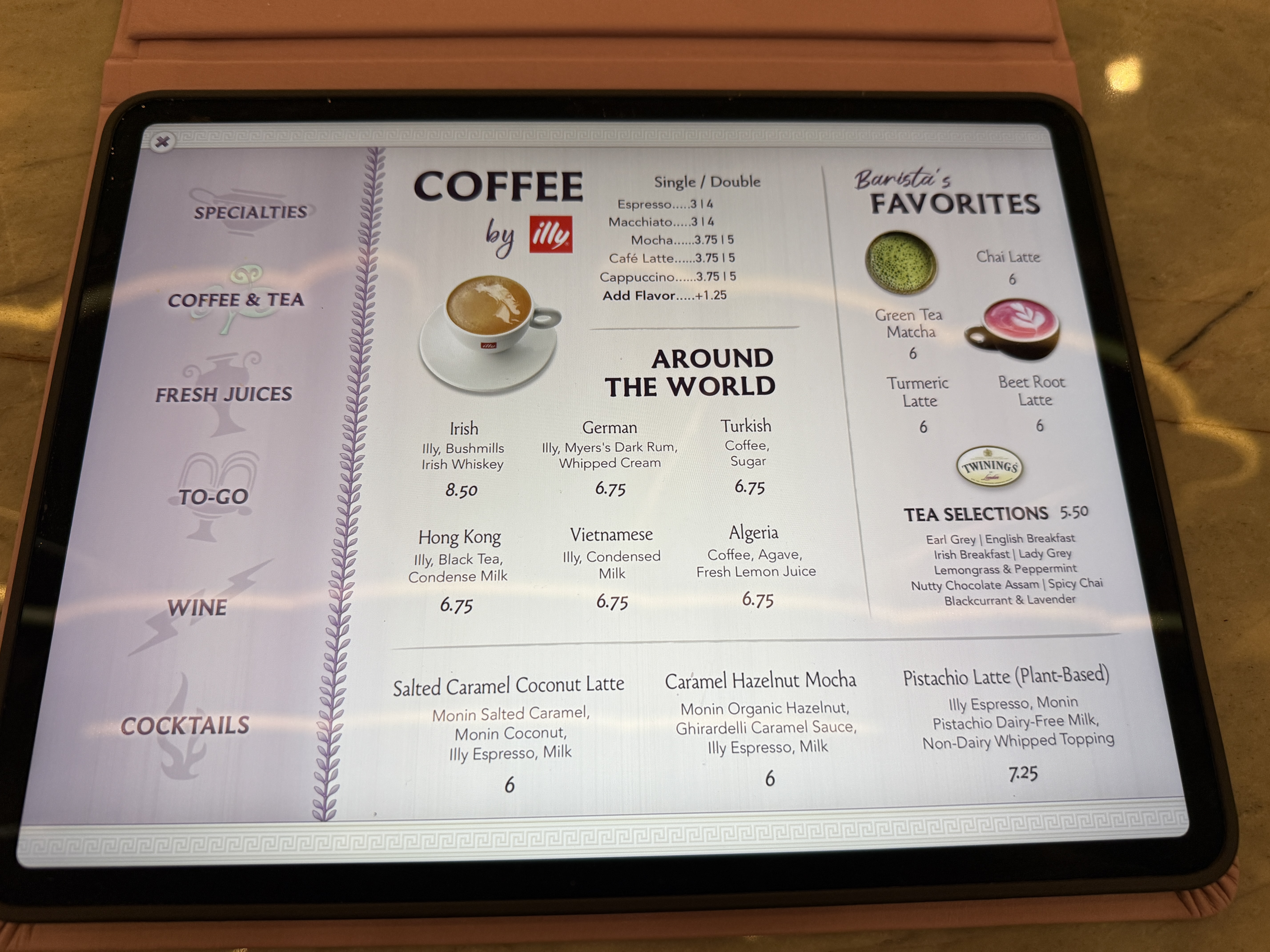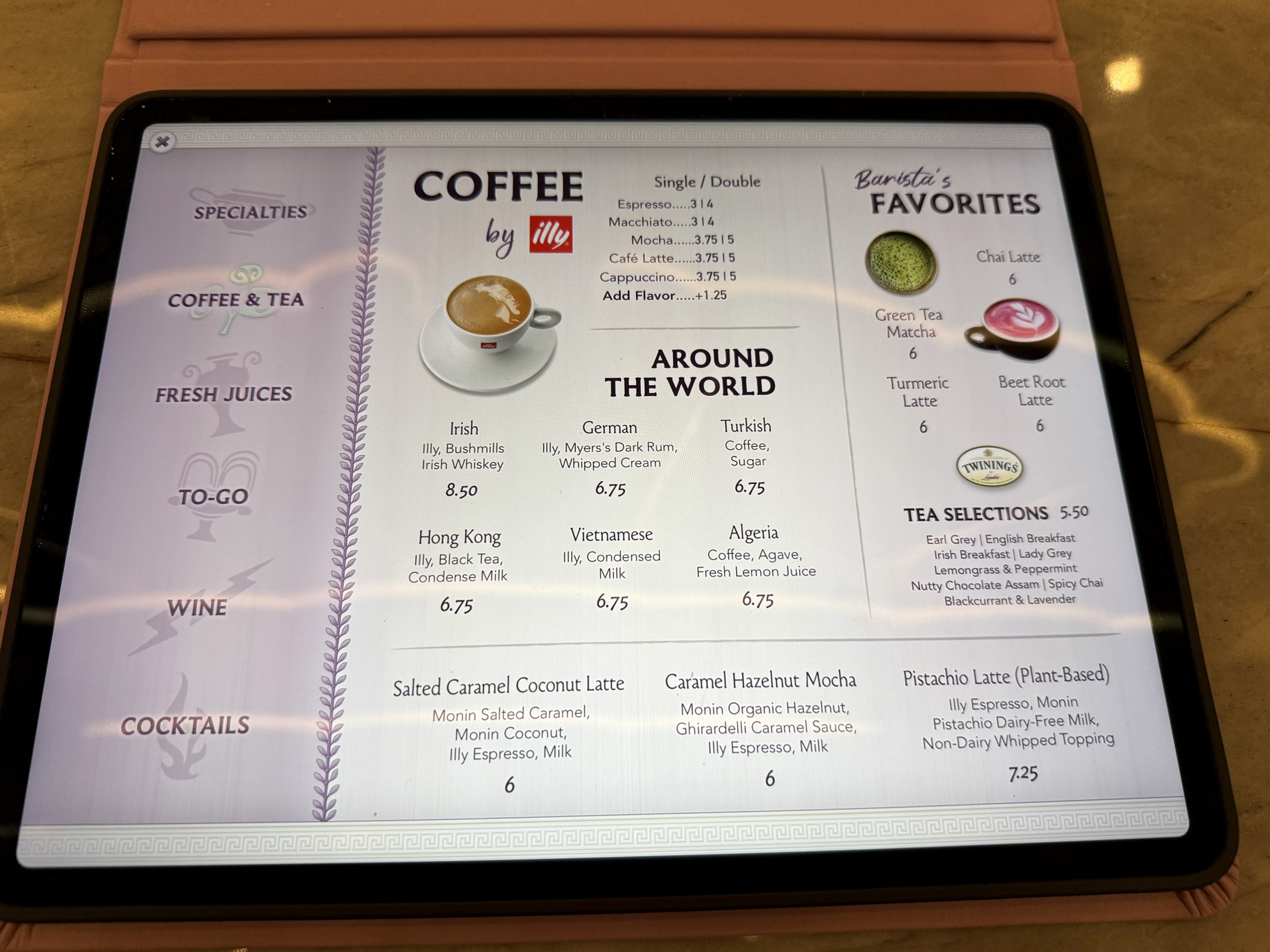 Guests can pick purchase speciality coffee, alcoholic beverages, juice shots, and other beverages from Cafe Megara. Here's a look at the menu.