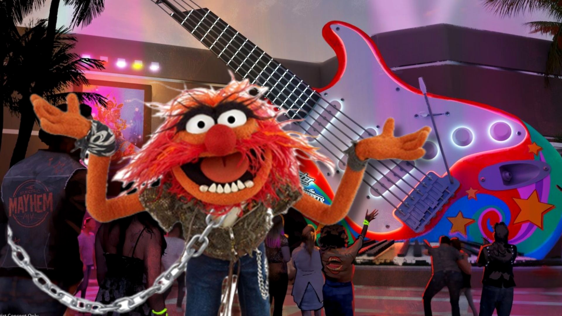 - In a video posted an hour later, Animal appears to be outside of the attraction in front of the iconic guitar facade being handed a note that really excites the Muppet.