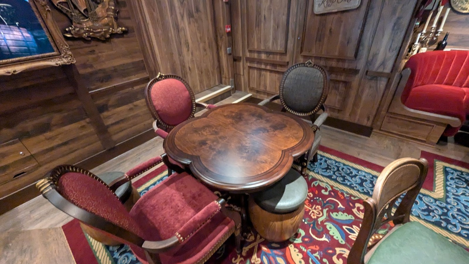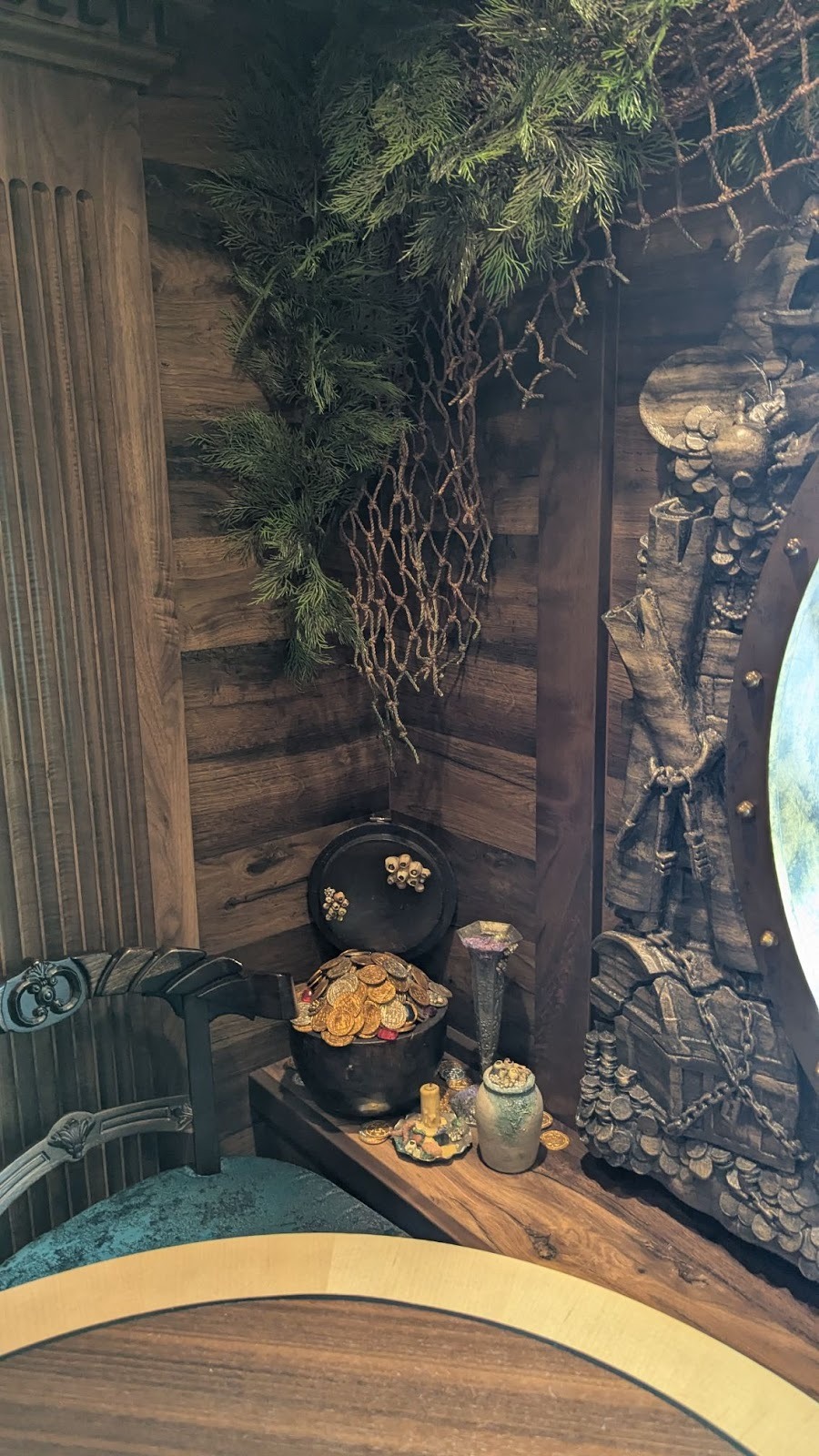 - A bar front constructed from stacked treasure chests, nodding to the treasure rooms in the films and attractions.