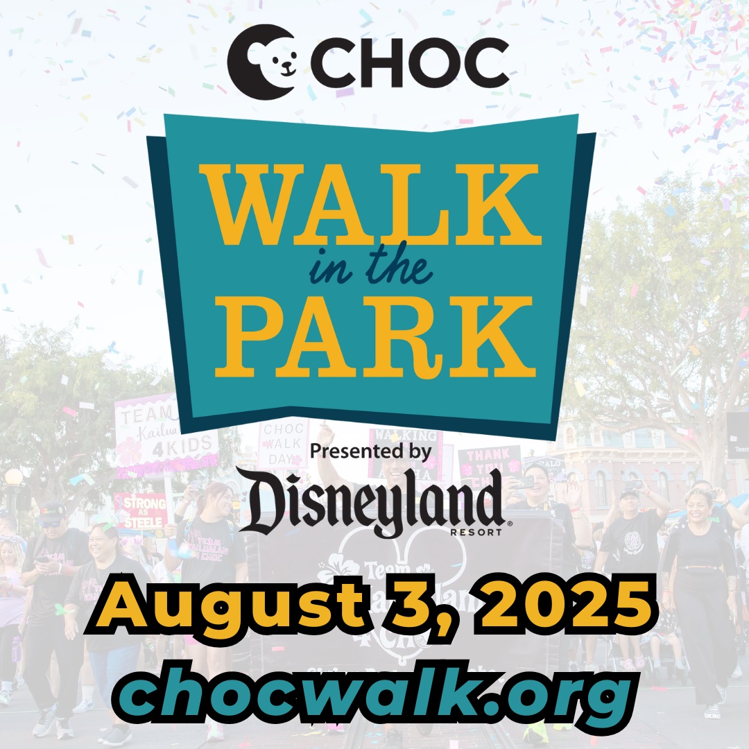 CHOC Walk In the Park 2025 will take place on the morning of Sunday, August 3rd at Disneyland Resort. For additional information, to register your own team for the walk, or simply help meet the fundraising goal, be sure to visit the official CHOC Walk website.
