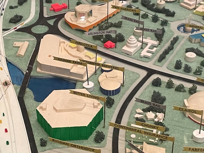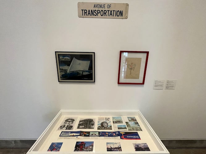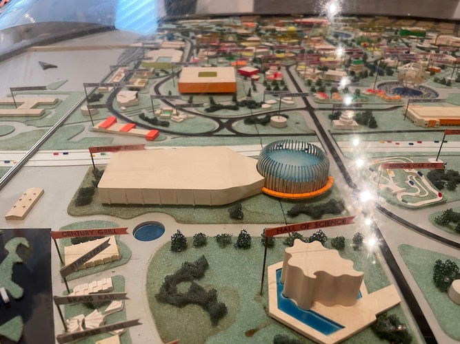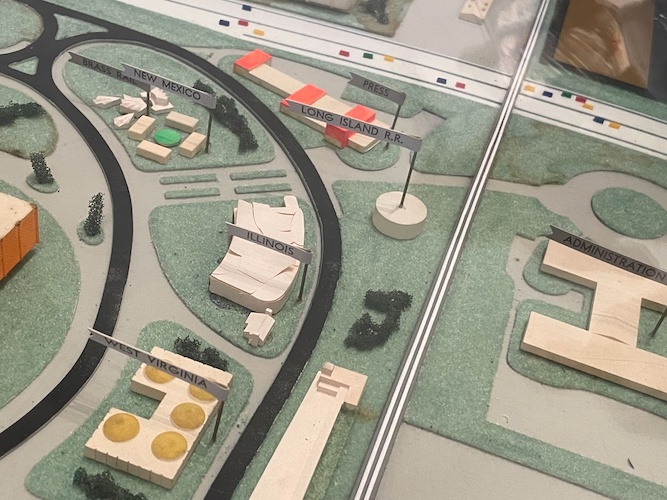 Elsewhere in the exhibit were historical photographs and maps, alongside a remarkable model of the fairgrounds during the celebration. (I made sure to look at other pavilions Disney worked on, including Pepsi (it’s a small world) and Illinois (Great Moments with Mr. Lincoln).