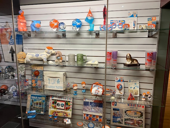 On the second floor of the museum, rows of cases showed off numerous souvenirs that visitors could take home from the fair, along with models, cups, signs, and pins.