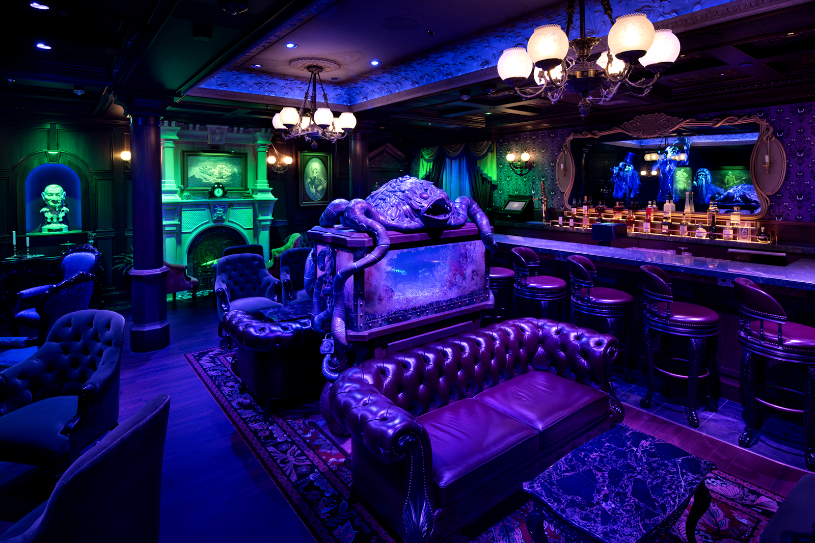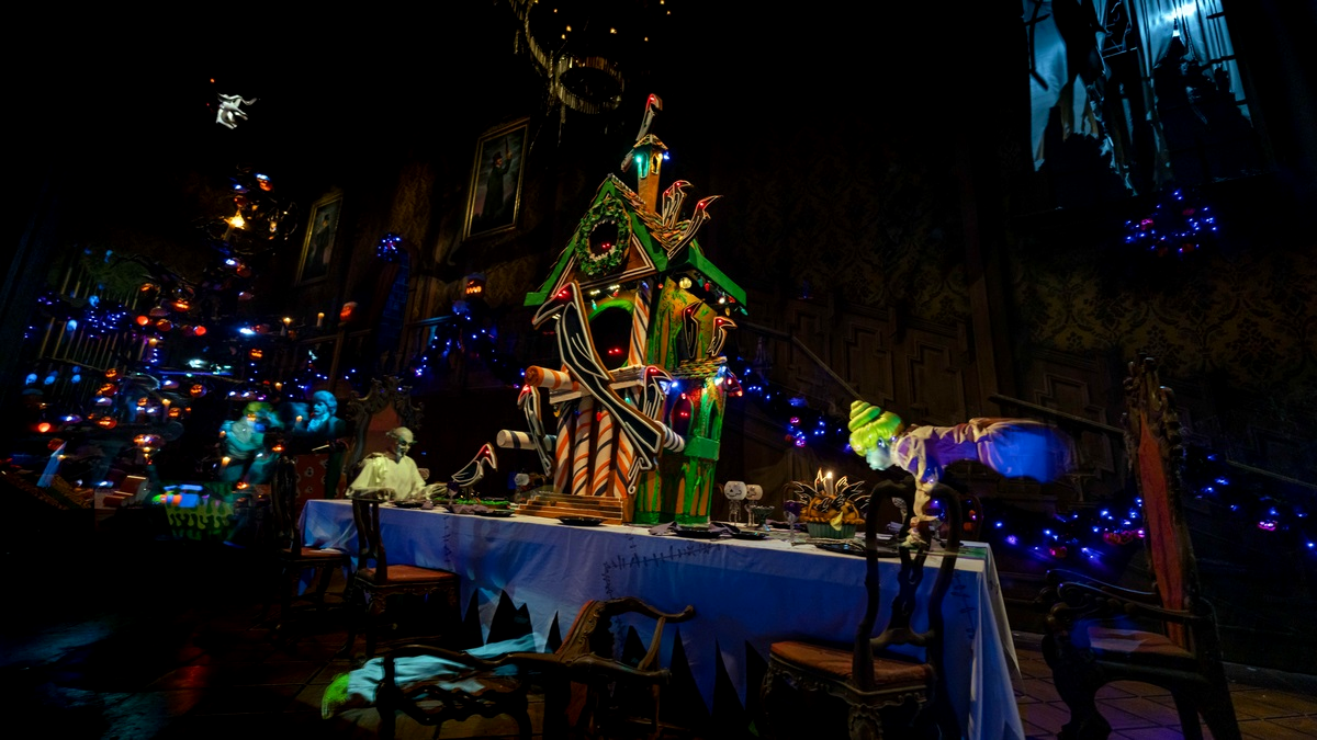 Along with these special moments, we head back into the Mansion to see more of its annual transformation. Another stop: the ballroom. One of the most iconic scenes of the attraction, this room gets a bit of special love each year. Not only are additional effects using the Pepper’s Ghost technique added for the overlay - including Zero putting the star on the tree and the Terror Train rolling around beneath it - but also the fan-favorite annual gingerbread house. Each year this real culinary creation takes center stage on the table in the ballroom. This year, it’s covered in a murder of crows. Just like every other year, it is made from real gingerbread, real fondant, real everything. Each year this masterpiece is different, and has crowds come annually just to see the annual iteration.