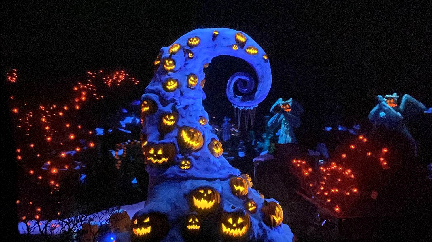 As they explained, 95% of the set pieces - like the Pumpkin Mountain, and Pumpkin Snow Angels - are all stored in the building year round. Later on in the special stream, we learned that a lot of this storage takes place in the attractions rig loft. You might be surprised to learn that that storage and area is practically in plain view of guests who ride the attraction. Kind of. One cast member explained that yes, it’s there all the time, but to guests passing through the graveyard scene, it appears as a forested area just over the hill. To get all the sizable decor out, chain motors are set up in the rig loft, stretching out across the graveyard scene, and everything is brought down for installation for the attraction’s annual new look.