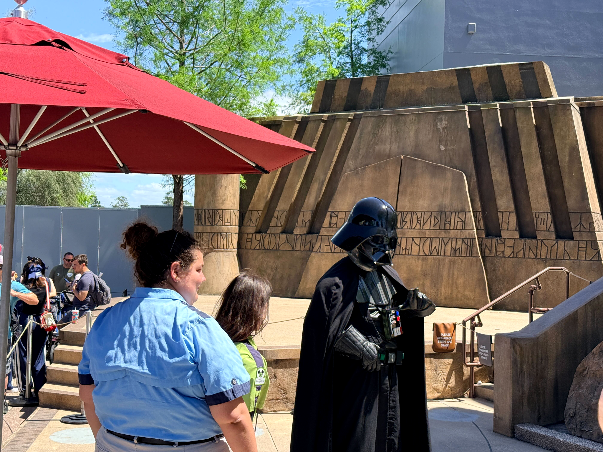 - Initially, Darth Vader met guests in the attraction’s outdoor extended queue.