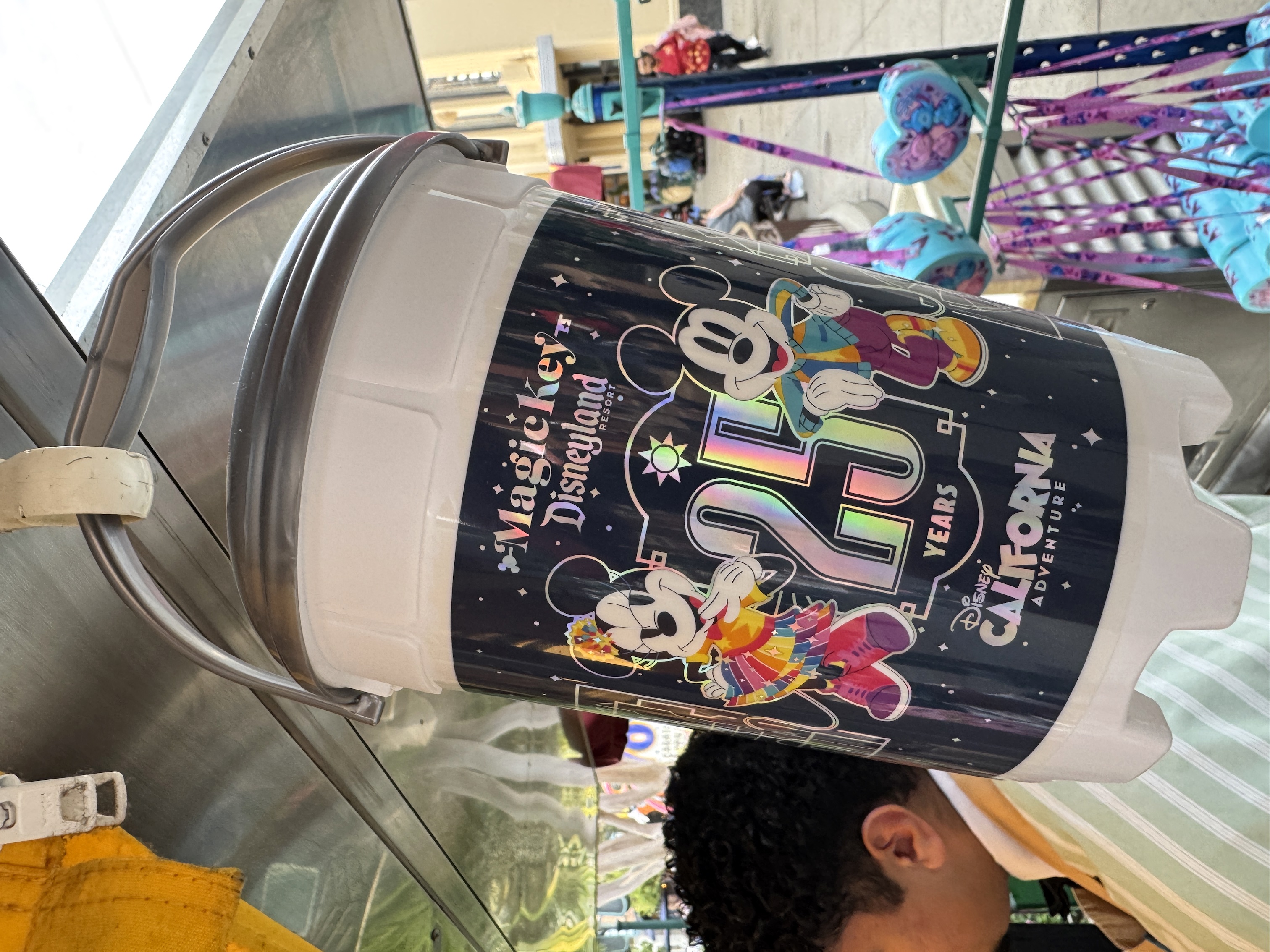 - The bucket features Mickey and Minnie in their newly created anniversary costumes on the front, alongside the DCA 25th logo.