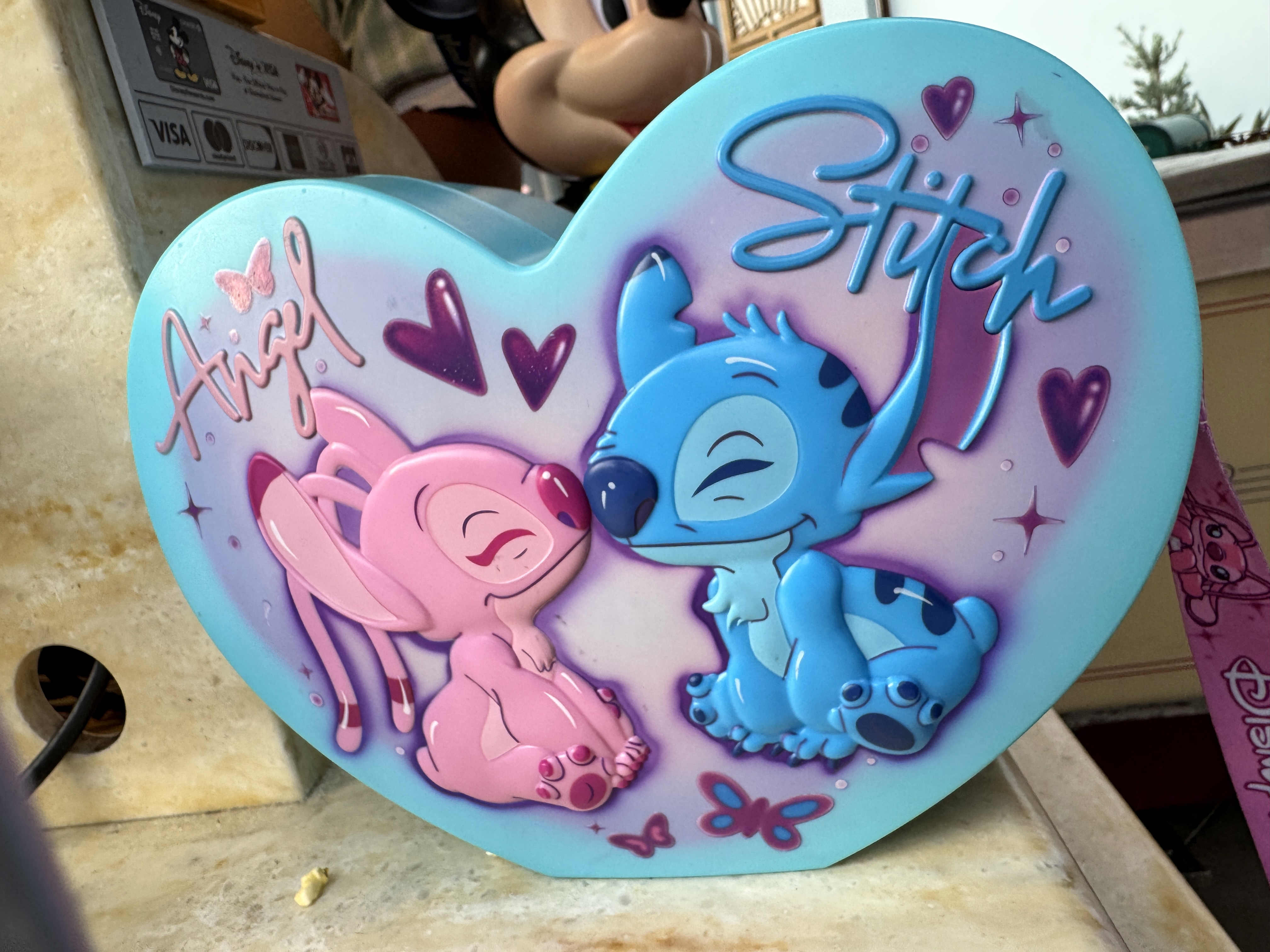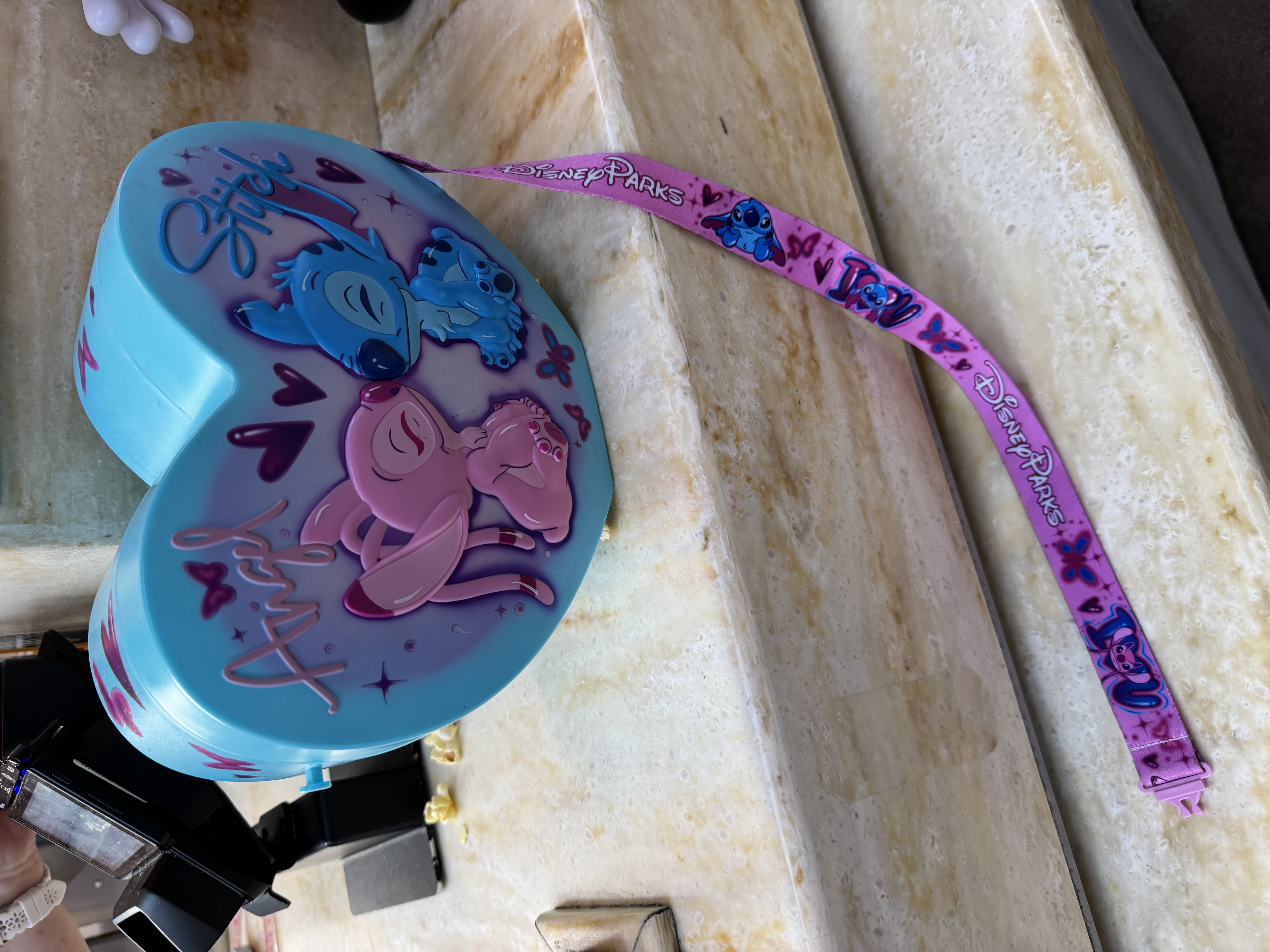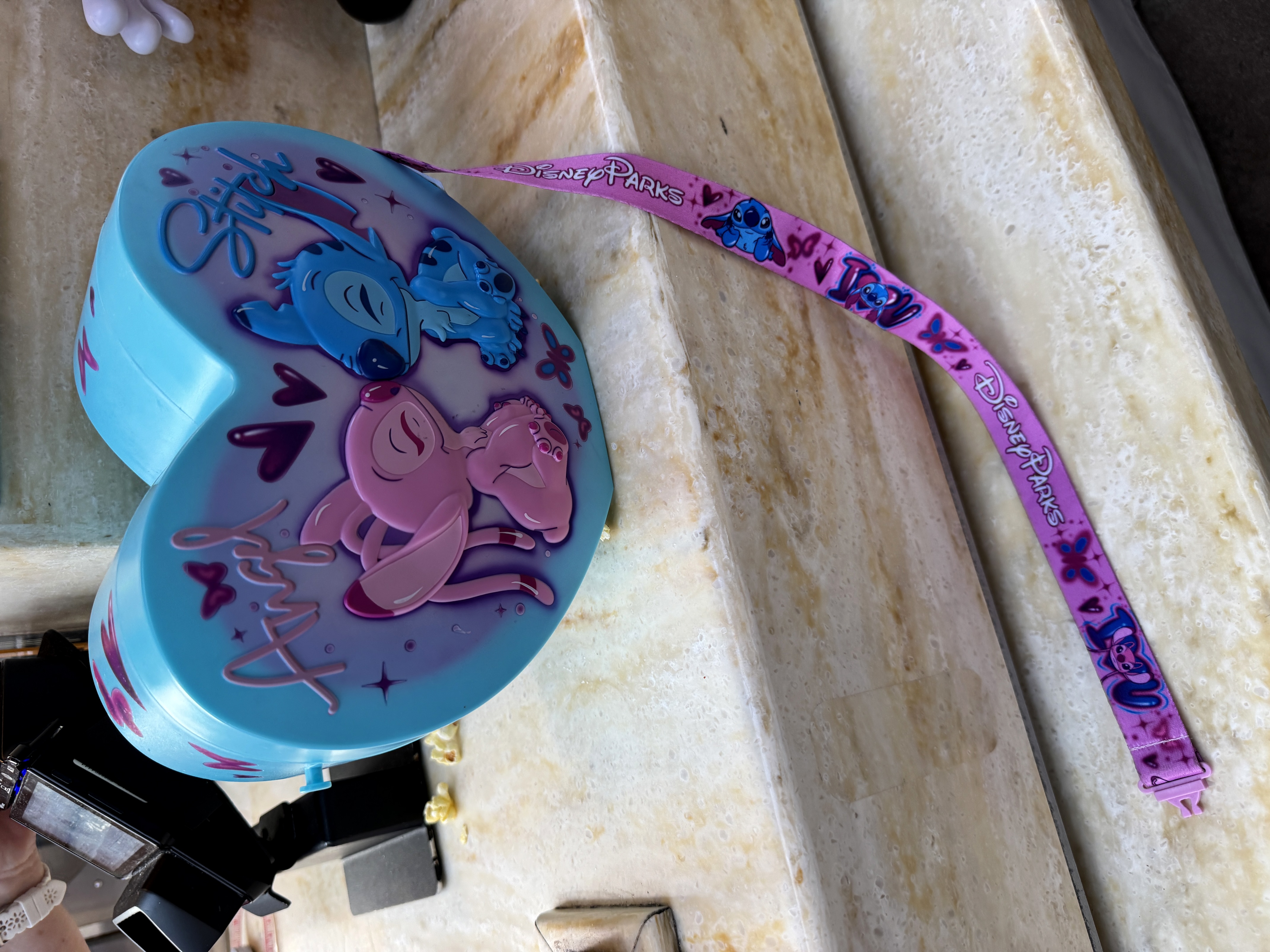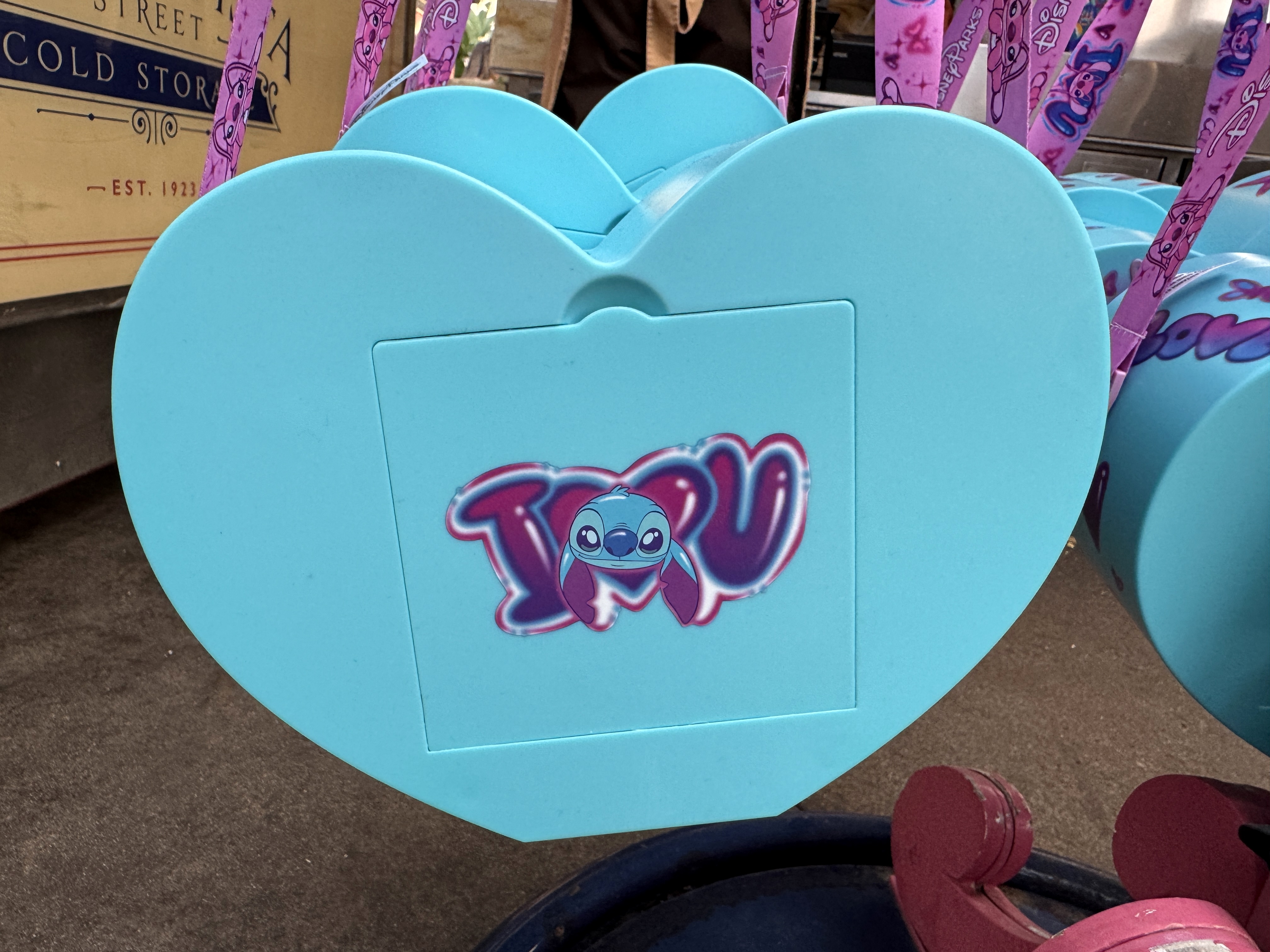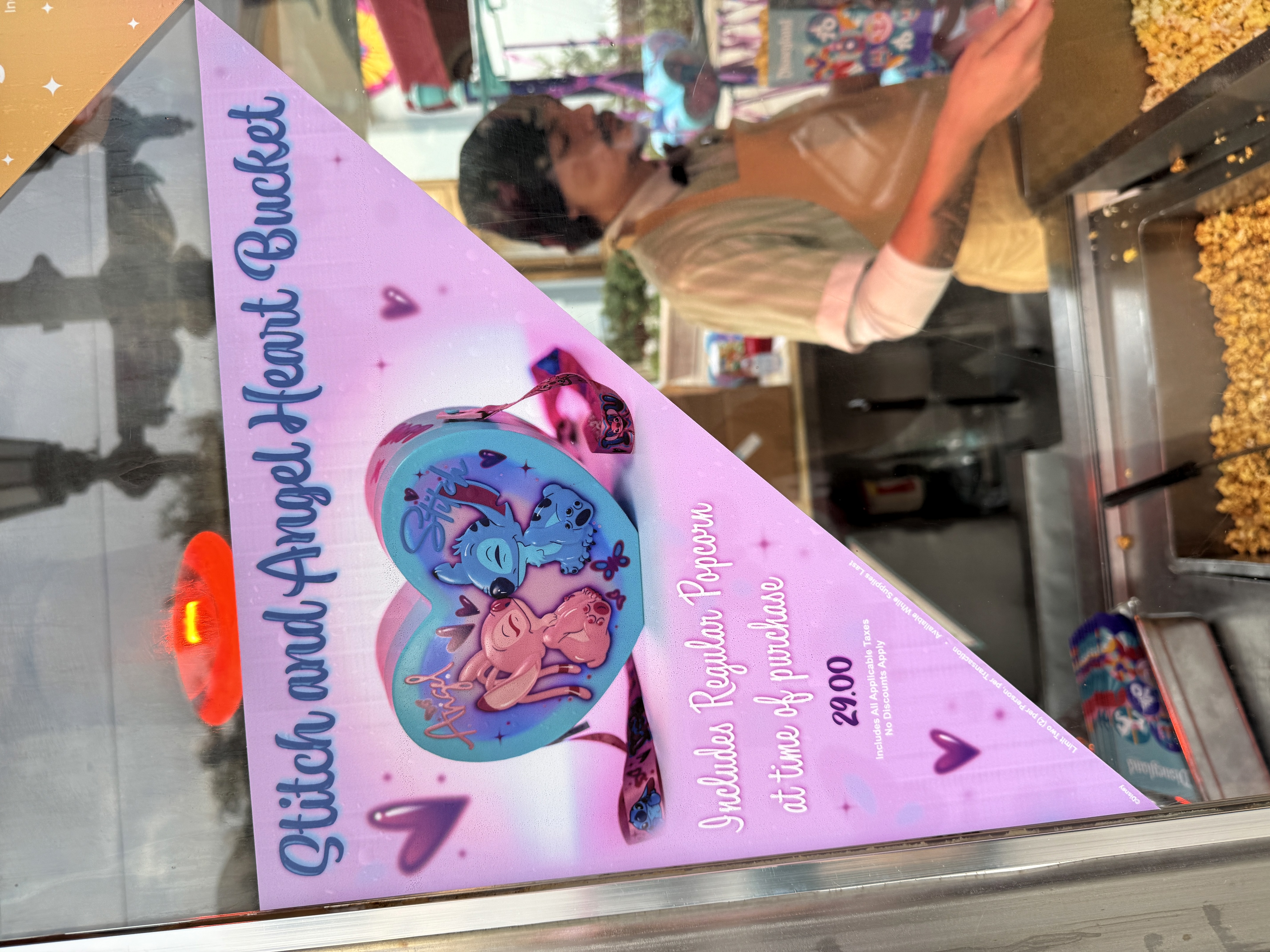 - The second new popcorn bucket is perfect for both fans of Lilo & Stitch and lovebirds, as Stitch and Angel feature prominently on this heart-shaped bucket.