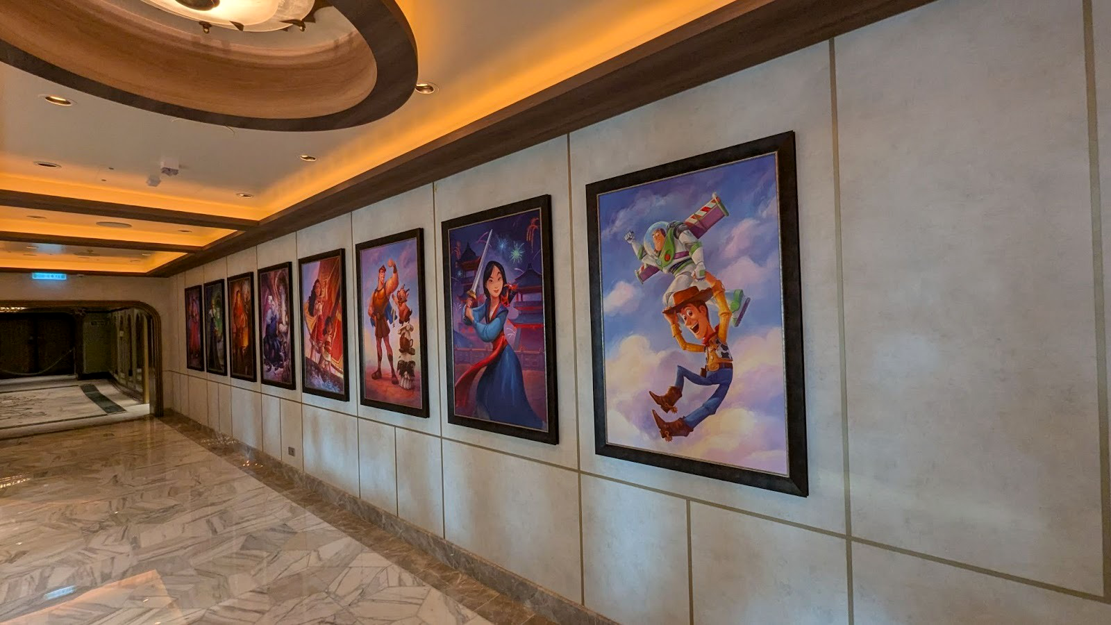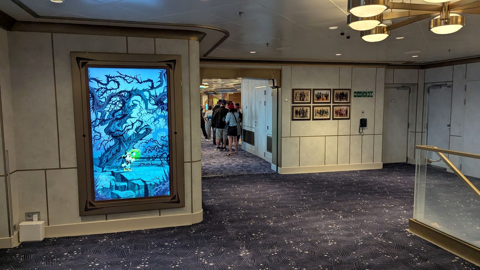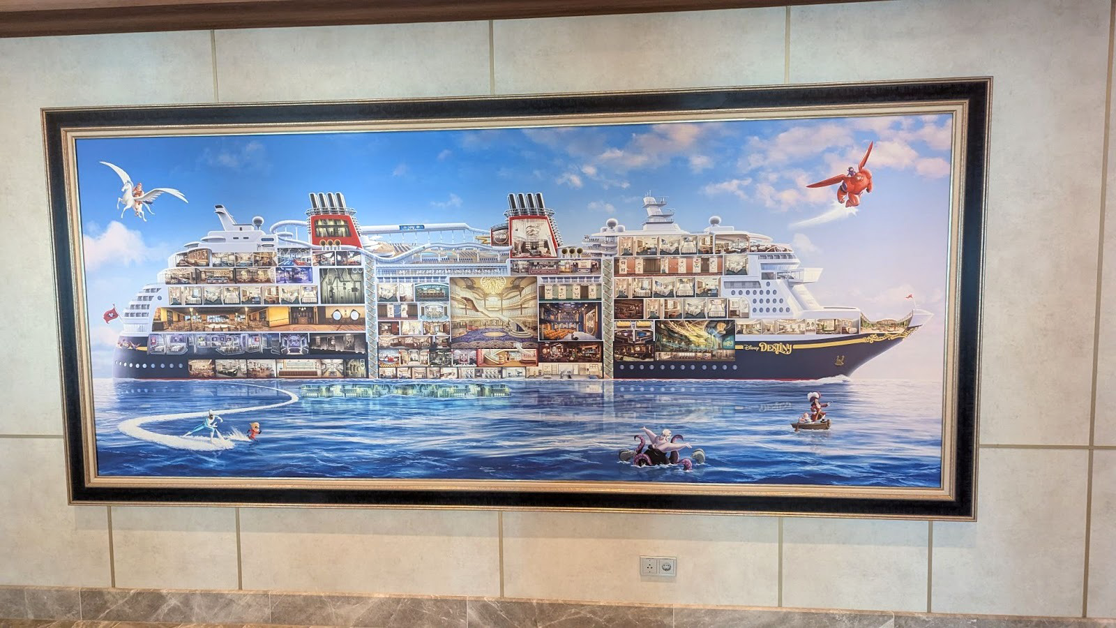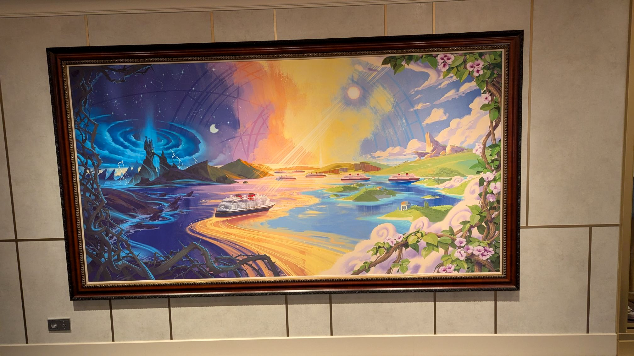 Down the hall, a stunning image of several Disney Cruise Line ships between a world of heroes and a dark world of villains is also prominently displayed.