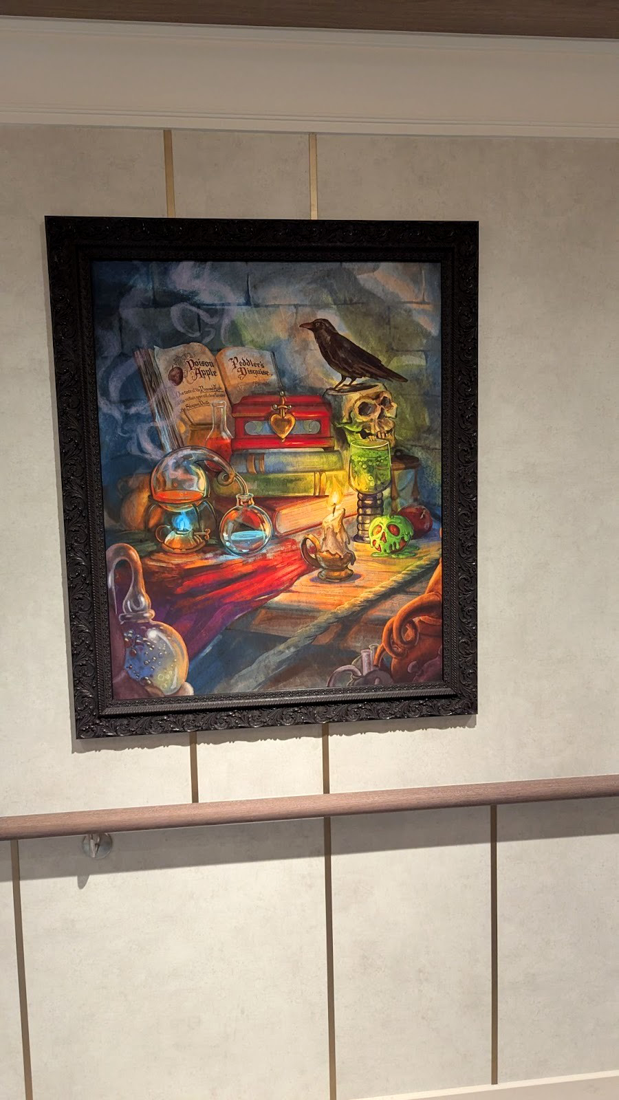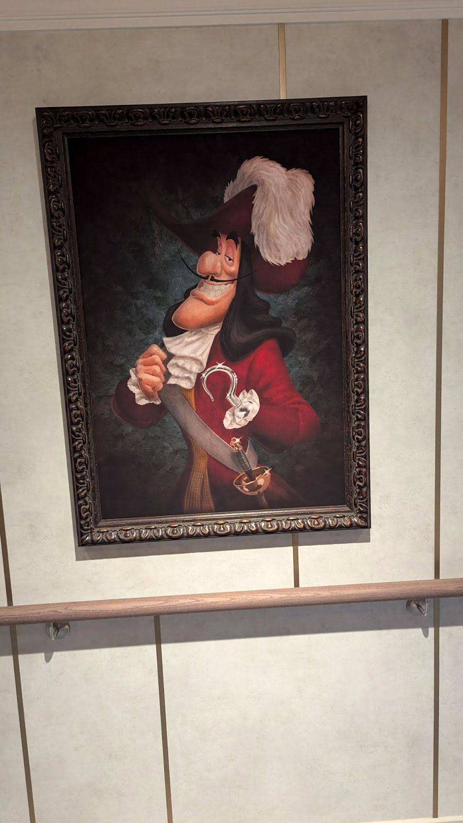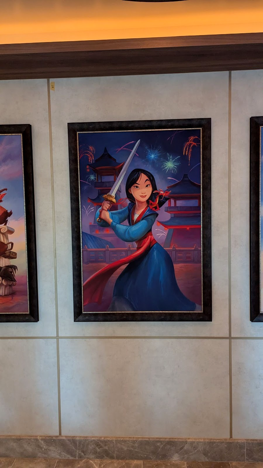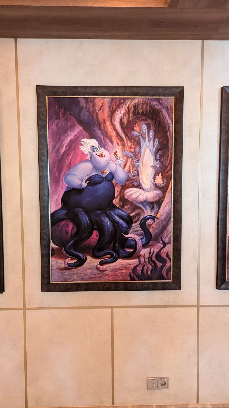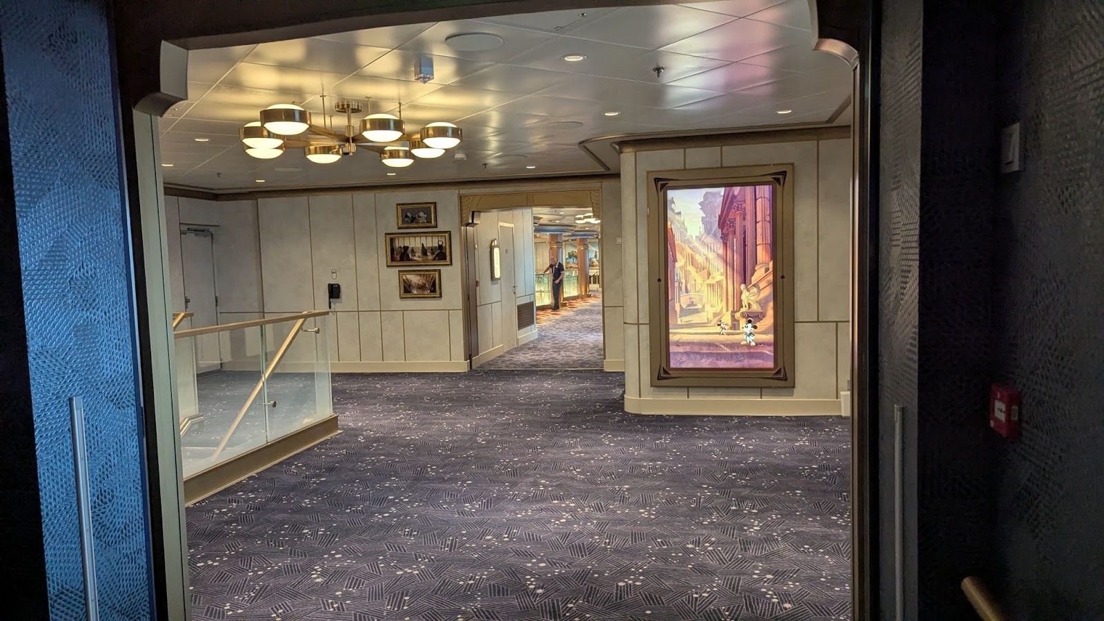 Down the hall, a stunning image of several Disney Cruise Line ships between a world of heroes and a dark world of villains is also prominently displayed.