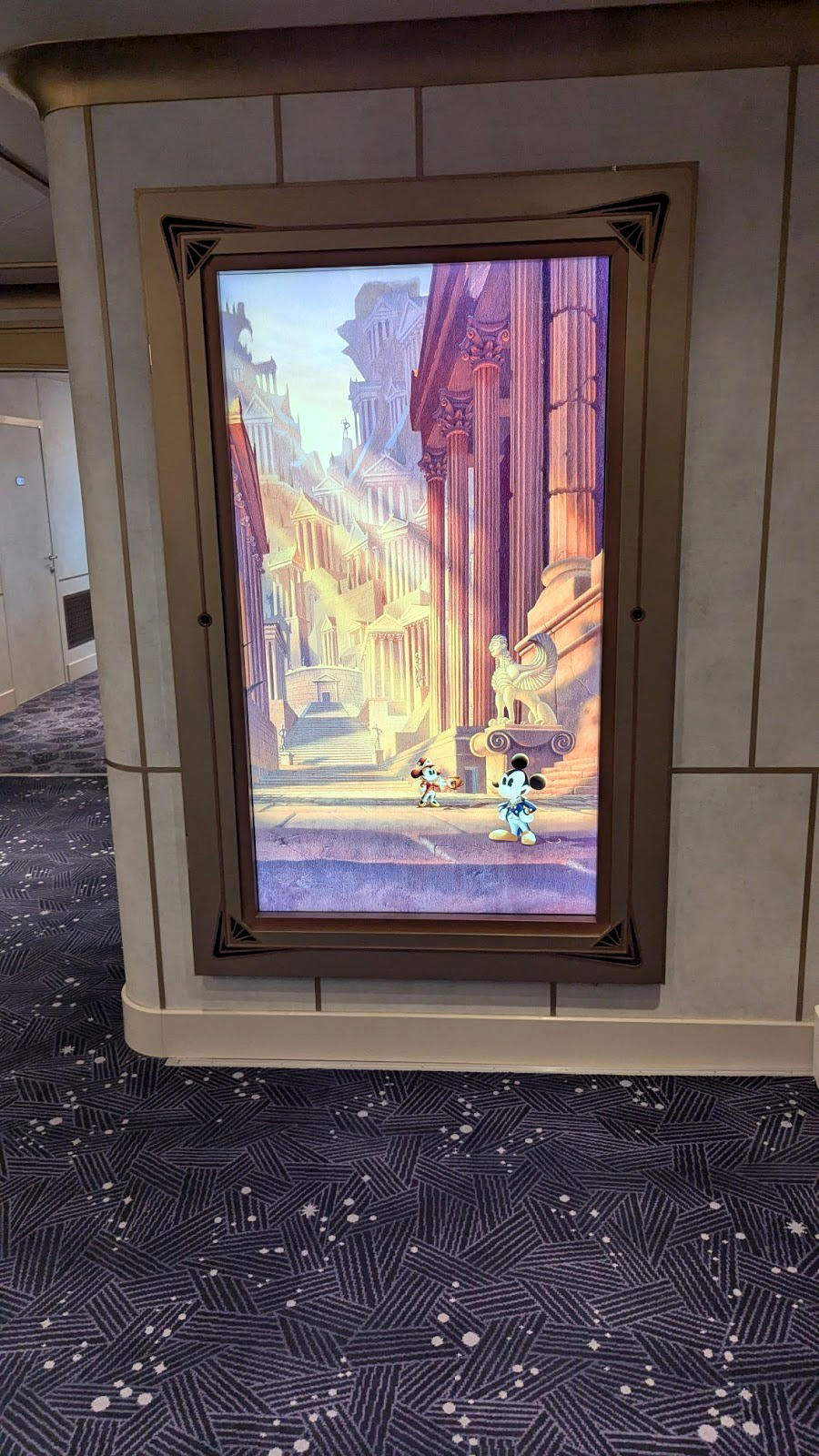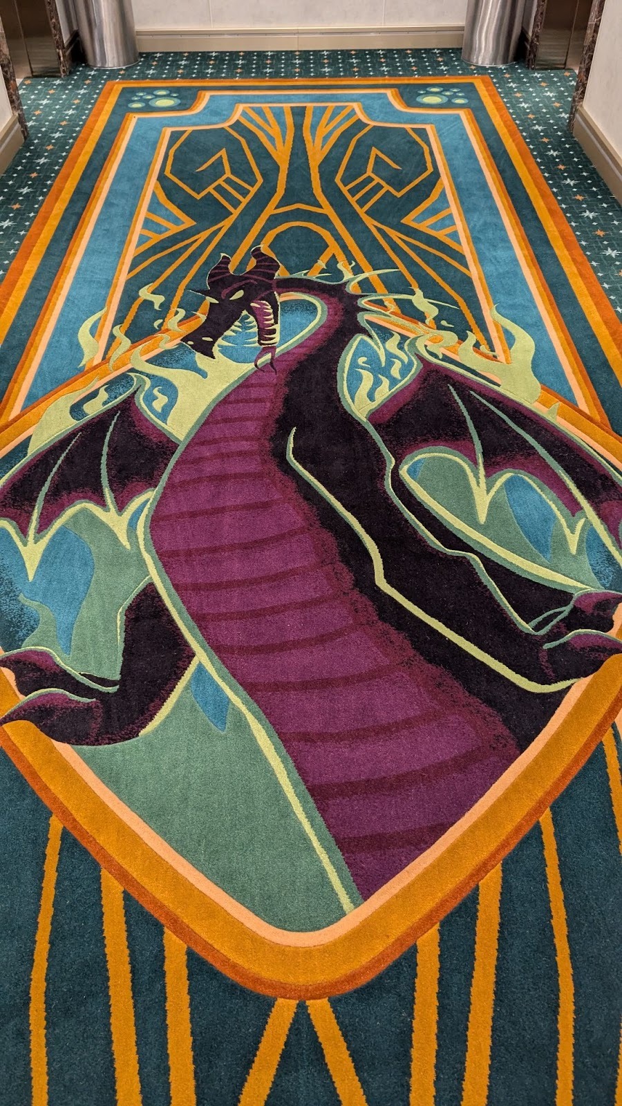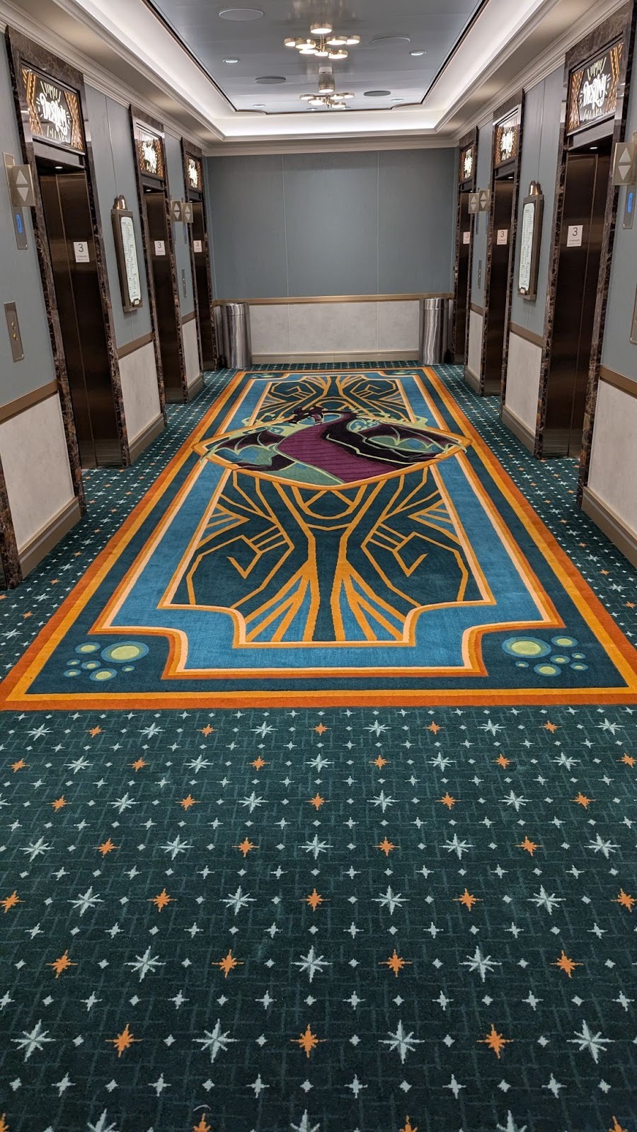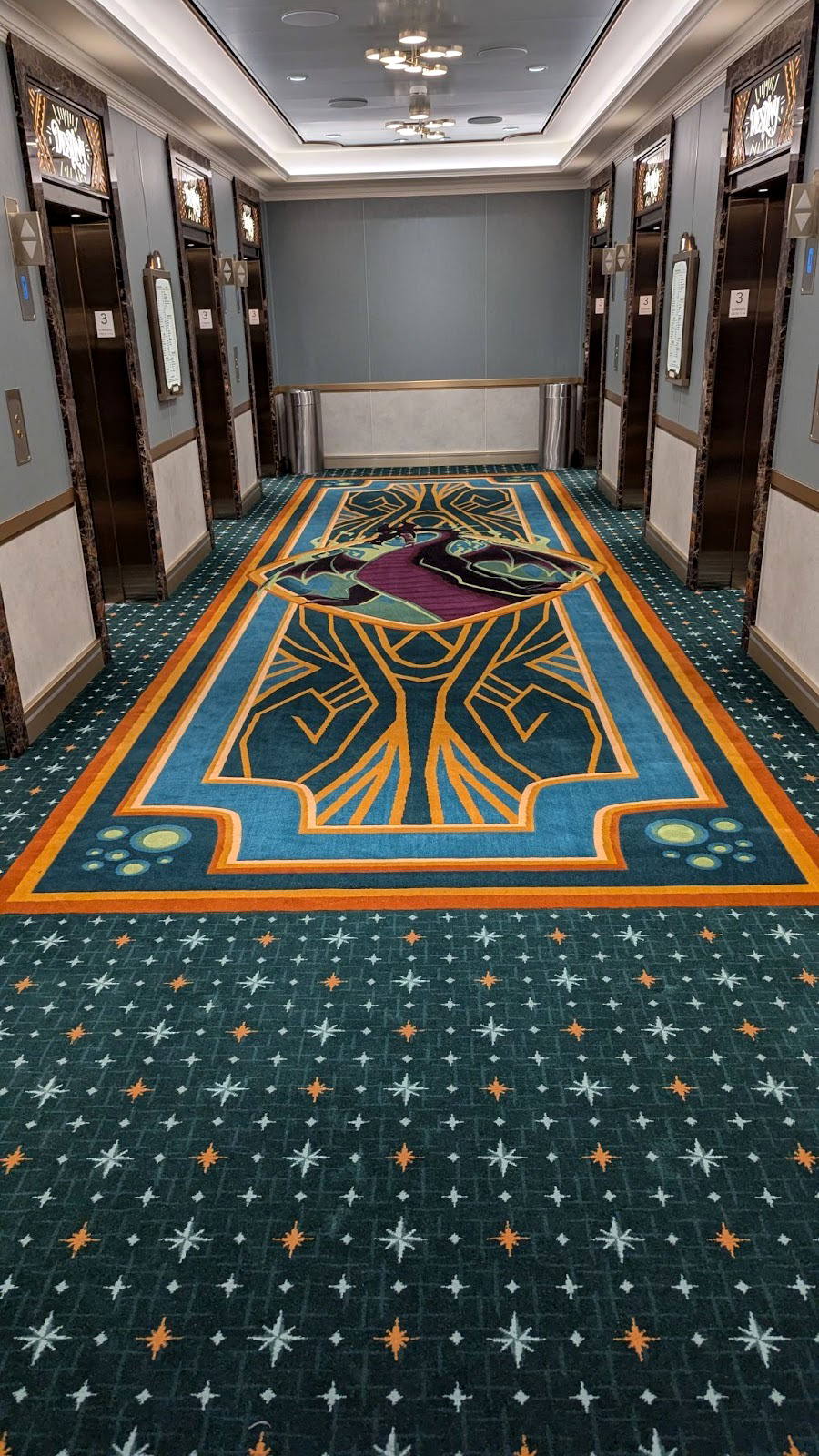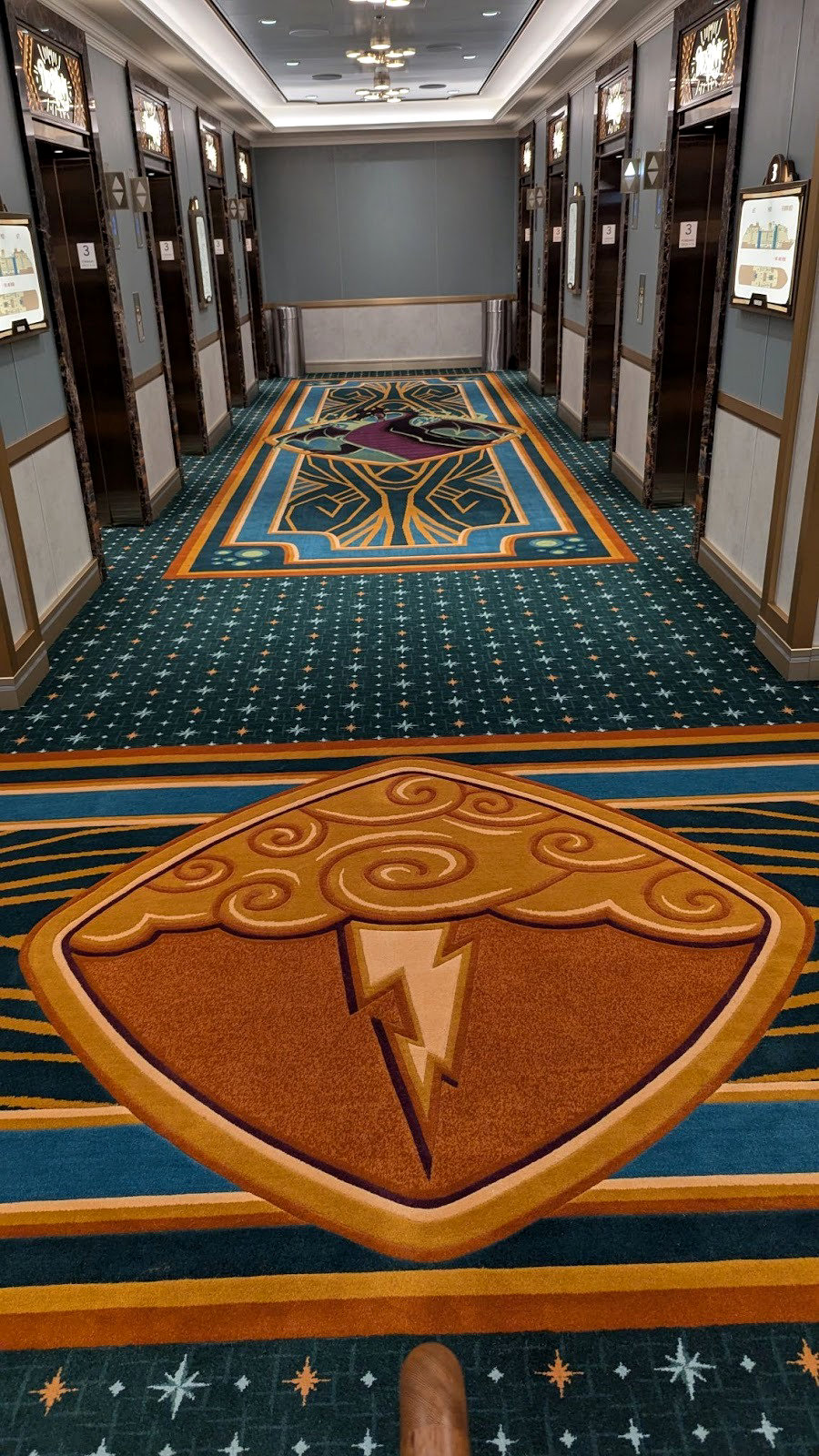 Majestic carpet can be found at the landing leading up to some of Deck 4’s elevators, one featuring the symbol of the Gods as seen in Hercules, leading up (for some reason) to Maleficent from Sleeping Beauty.