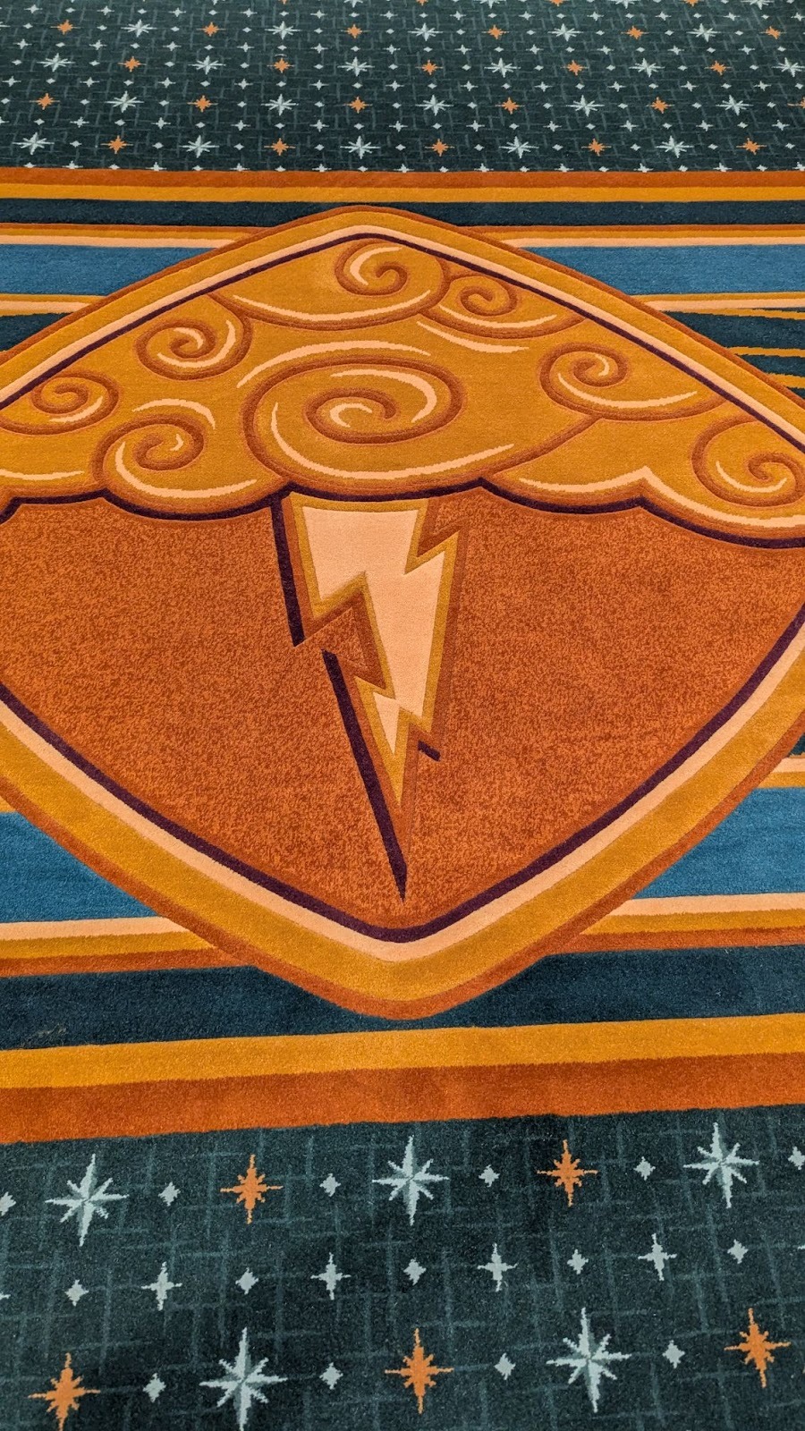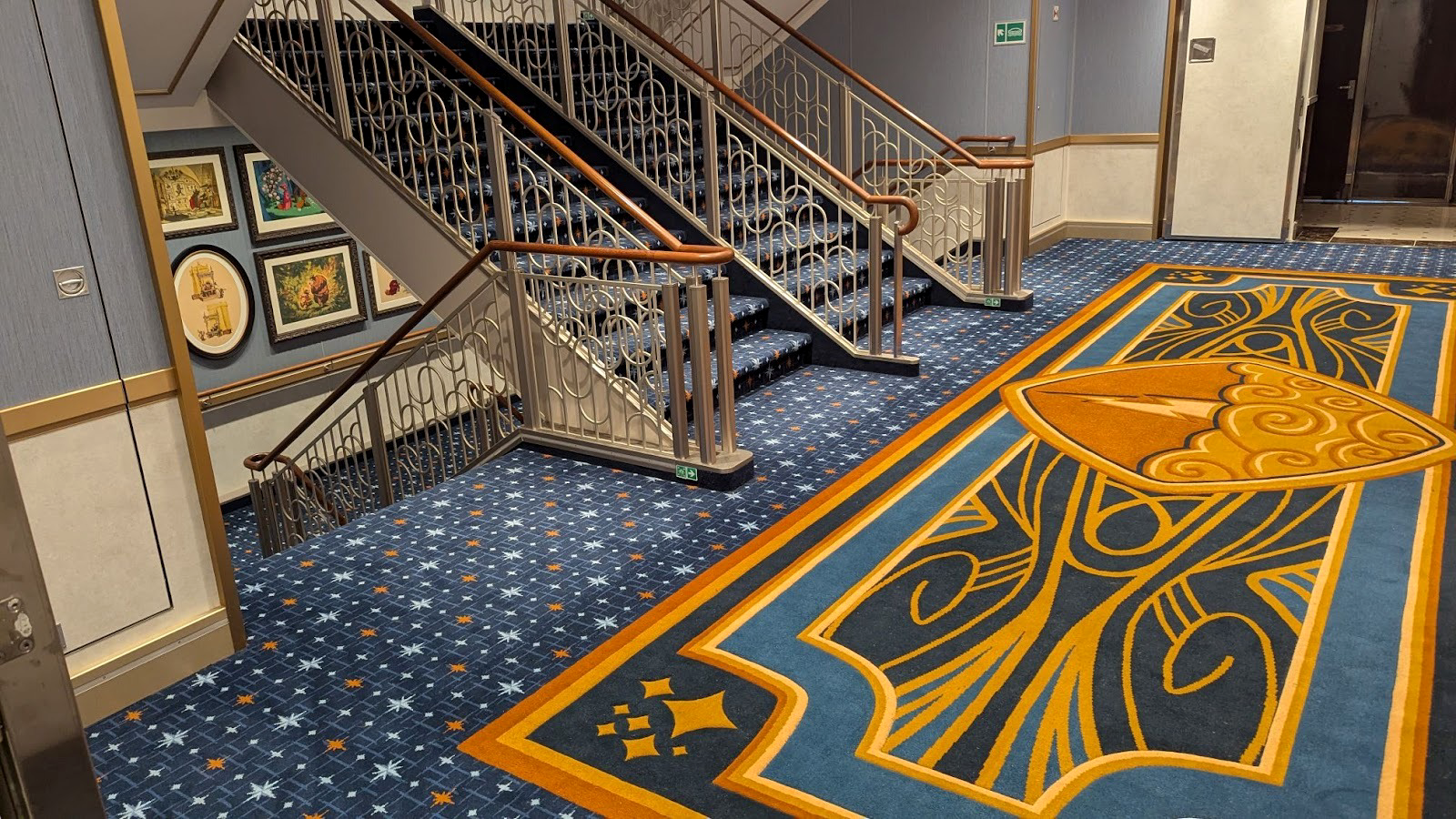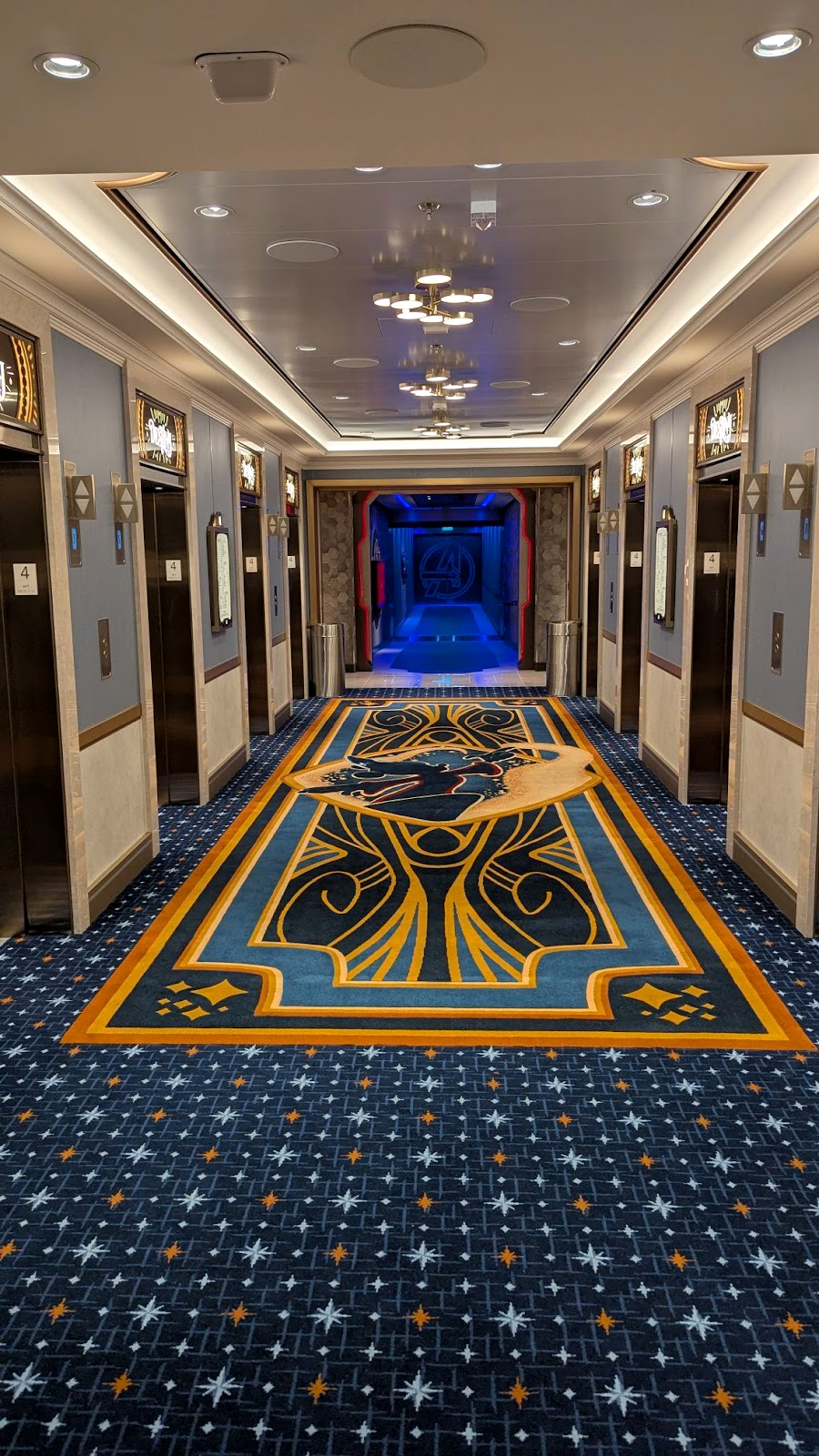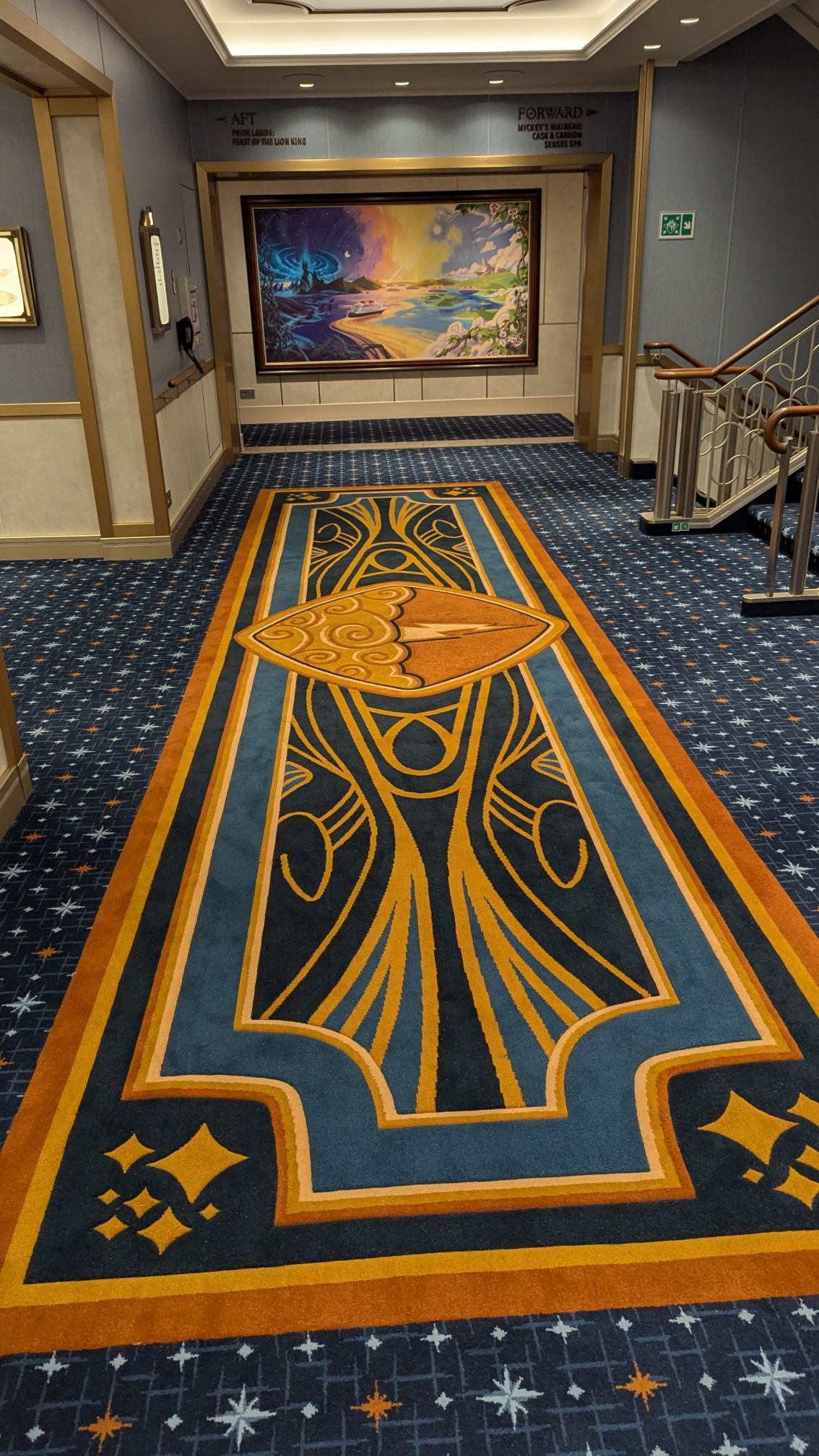 Majestic carpet can be found at the landing leading up to some of Deck 4’s elevators, one featuring the symbol of the Gods as seen in Hercules, leading up (for some reason) to Maleficent from Sleeping Beauty.