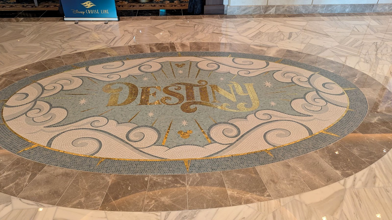 Also where, we can also find the large depiction of the Disney Destiny in its stylized cross-sectional form, serving as a map (of sorts) to where the venues are on the ship.