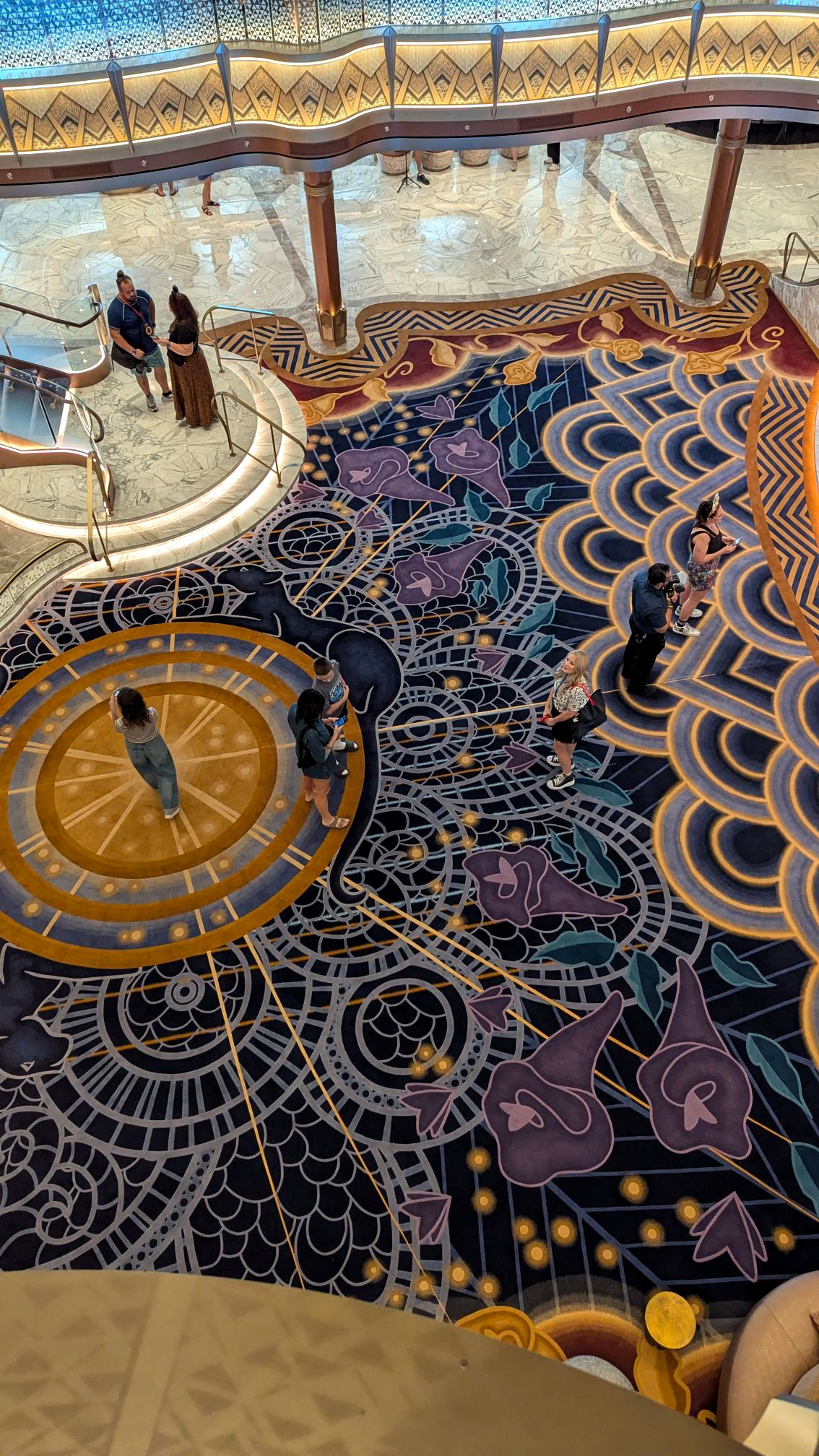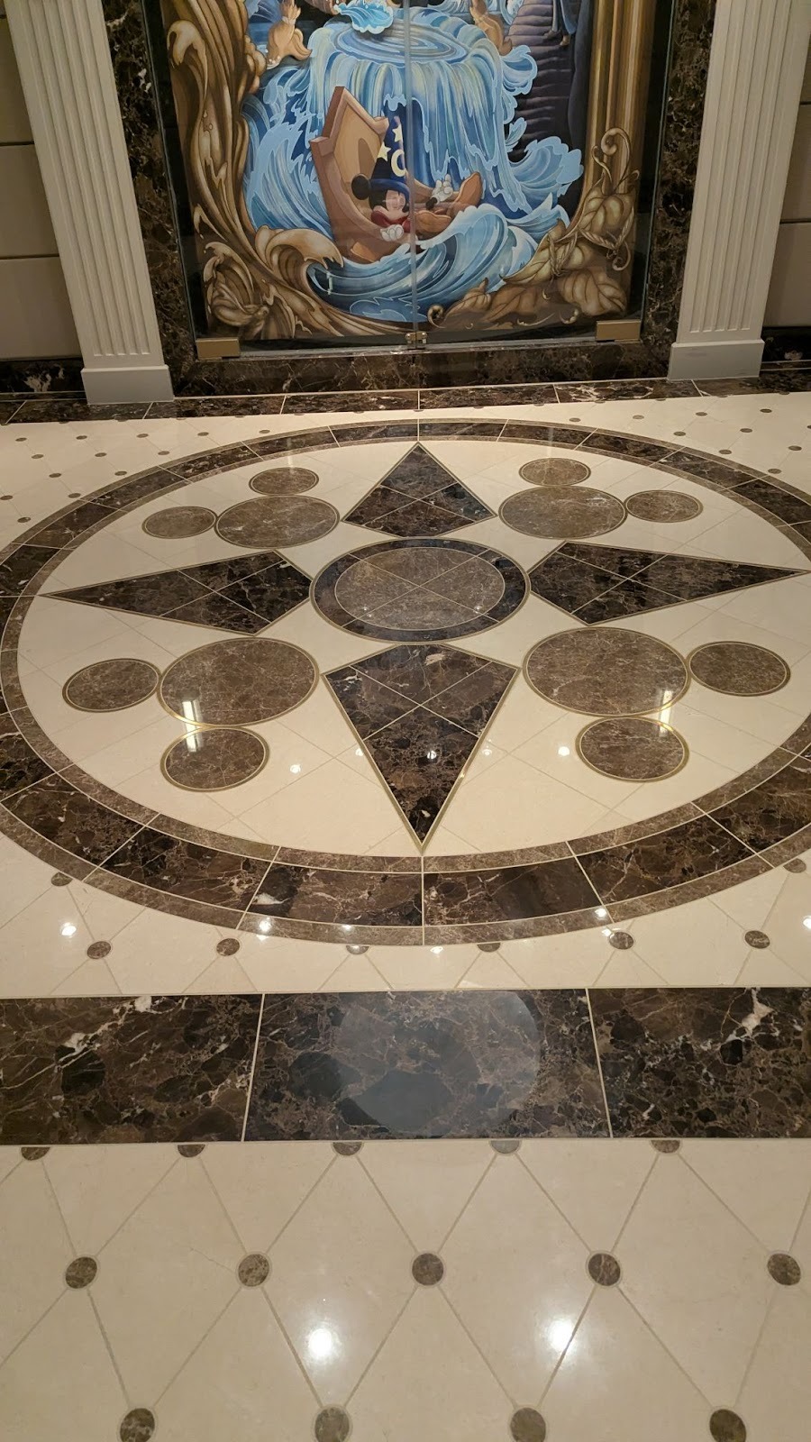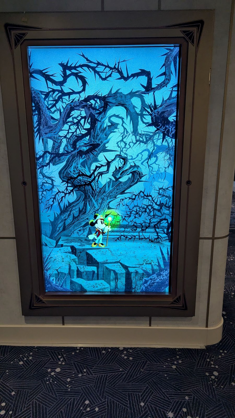 Heading aft toward the Worlds of Marvel restaurant, we’ll also find another stunning carpet in the elevator lobby, this one featuring Sorcerer Mickey.