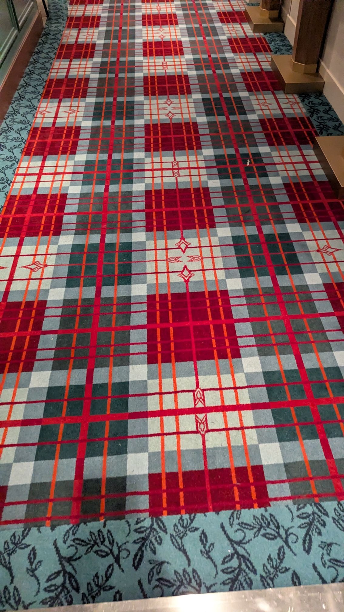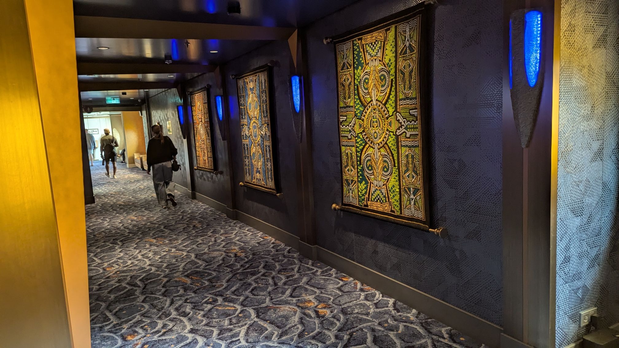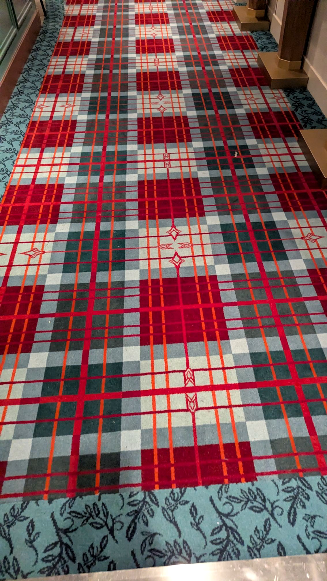 Heading aft toward the Worlds of Marvel restaurant, we’ll also find another stunning carpet in the elevator lobby, this one featuring Sorcerer Mickey.