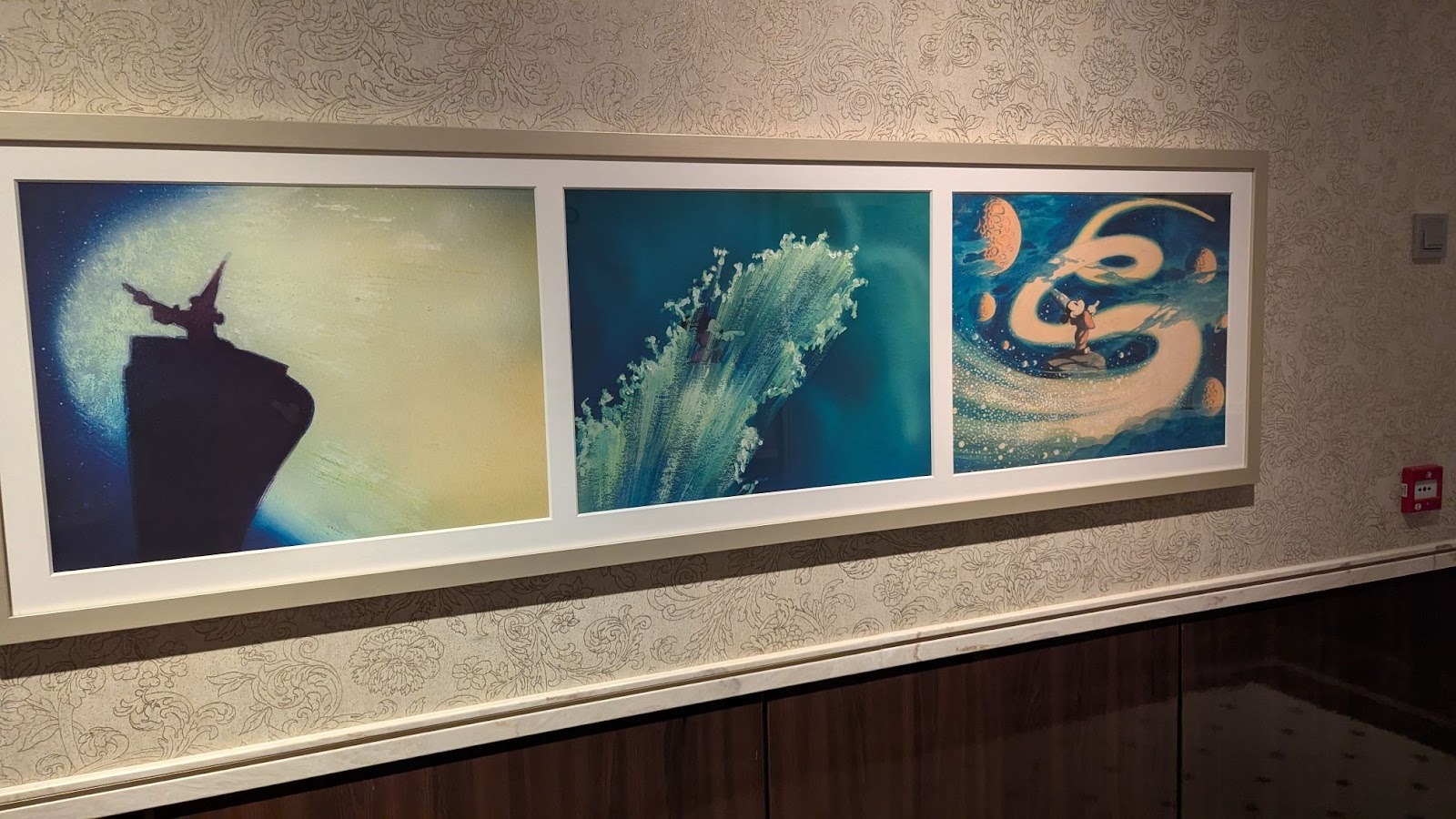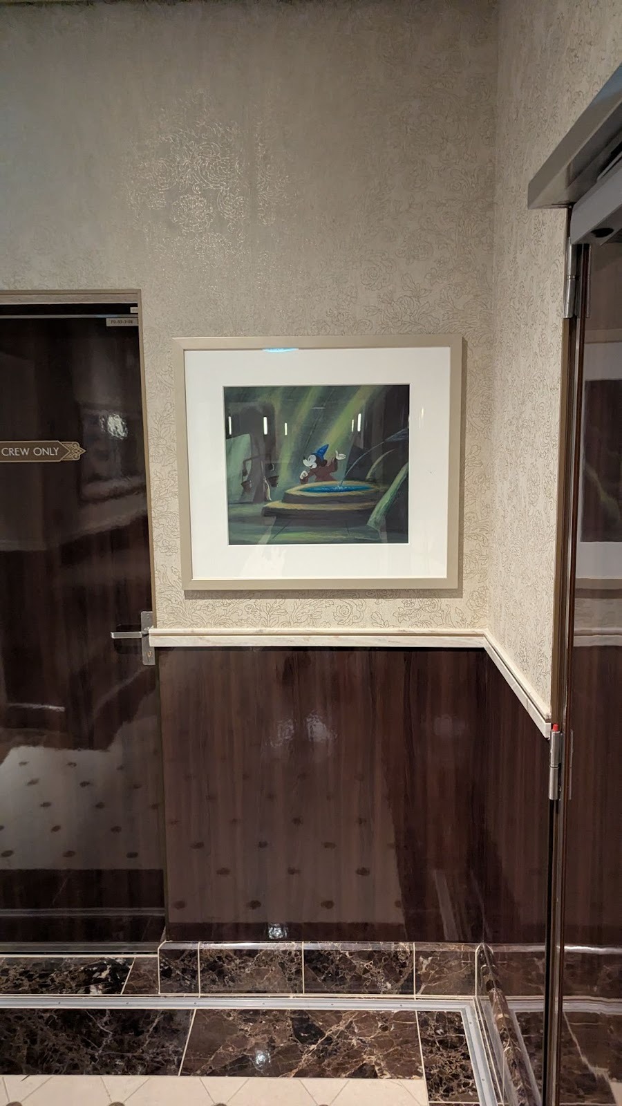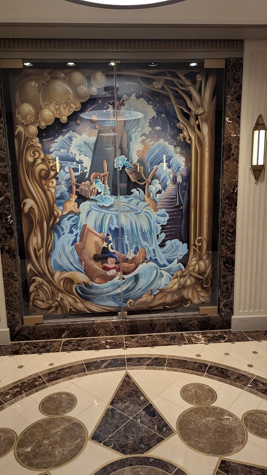 Elsewhere, Fantasia art leads up to a beautifully animated depiction of Sorcerer Mickey, a great successor to a similar animated mural featuring Steamboat Willie that was found aboard the Disney Treasure. You can find this one in the same spot, just past the elevator lobby between the halves of 1923.