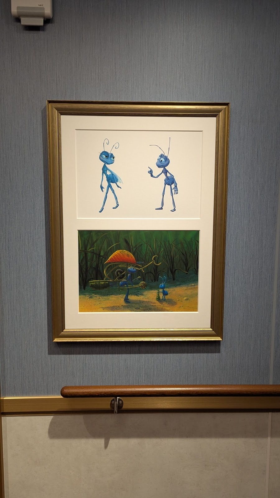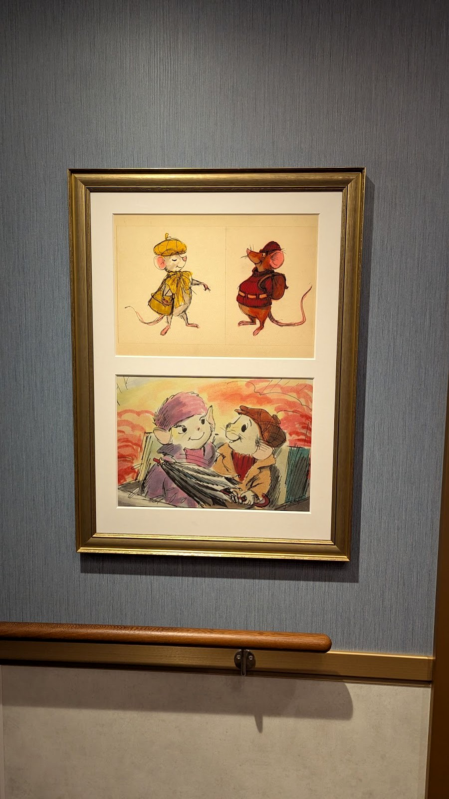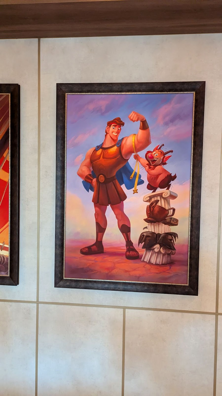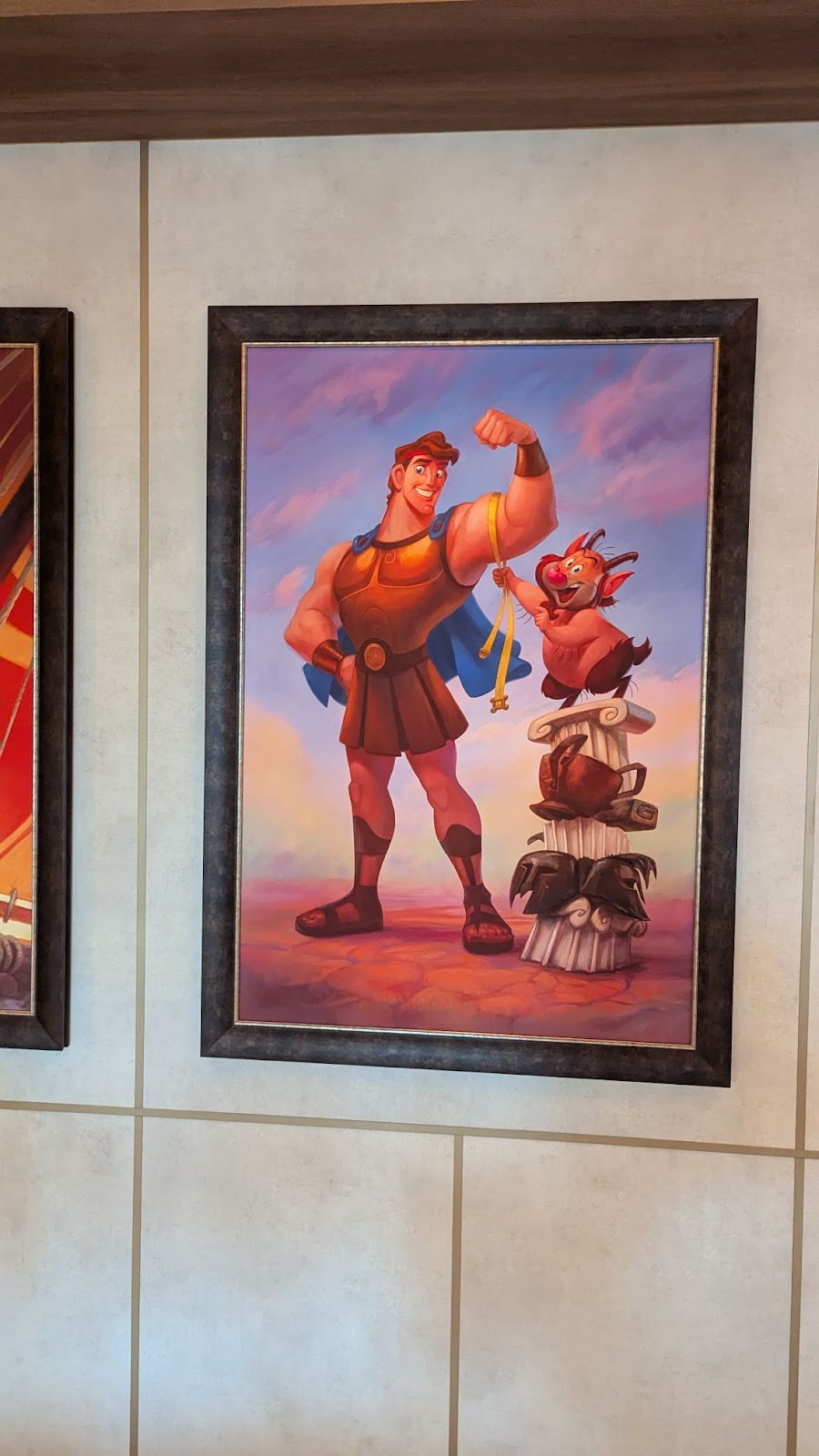 Near some of the elevators on Deck 4, namely on the walls surrounding the Hercules symbol of the Gods carpet, you’ll find art from A Bug’s Life and The Rescuers.