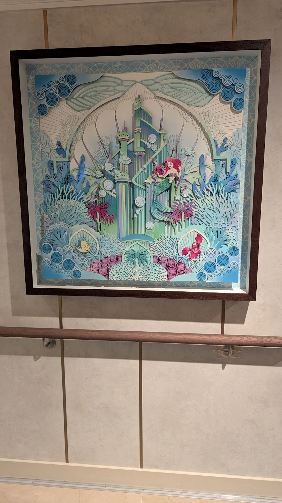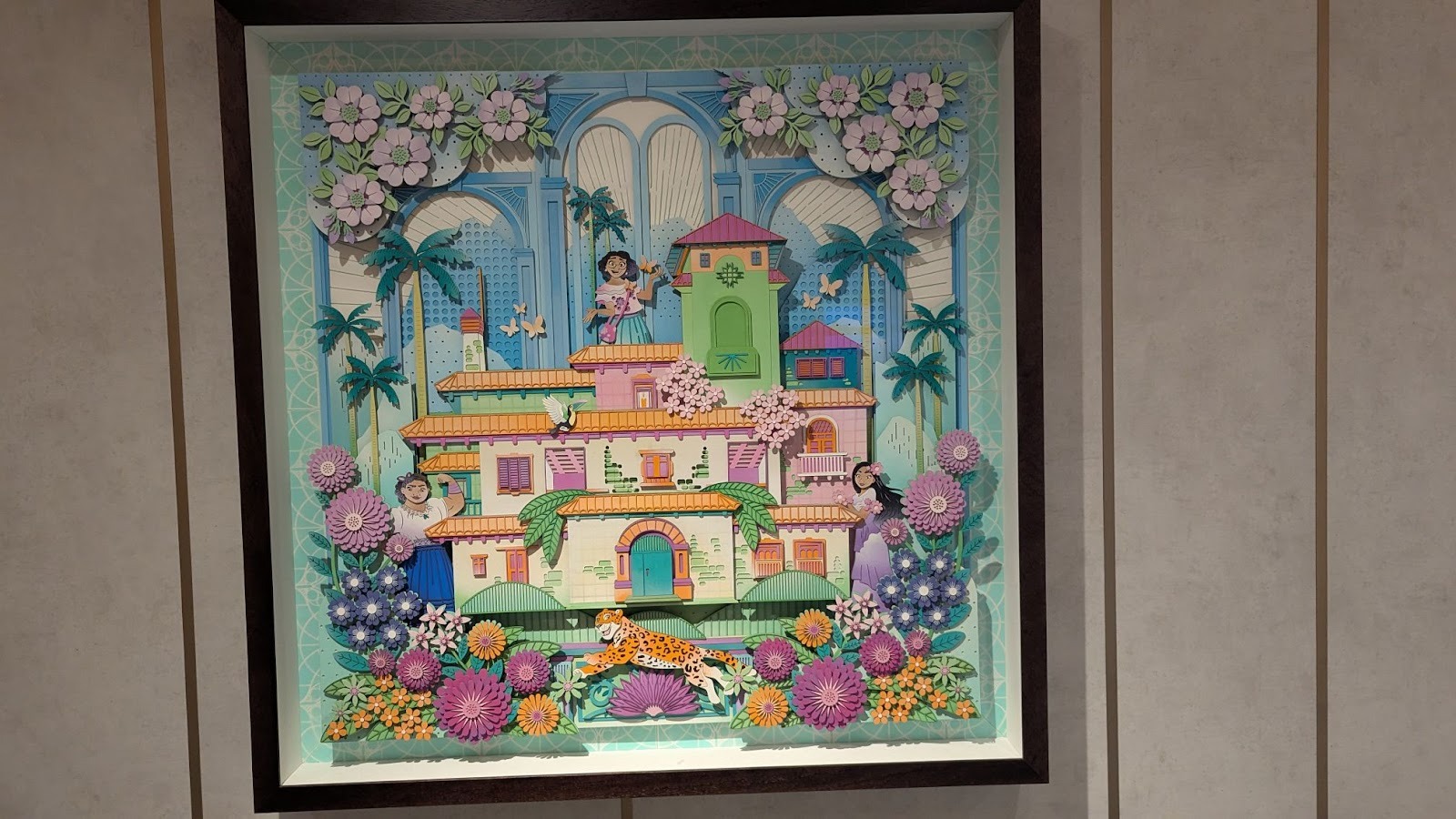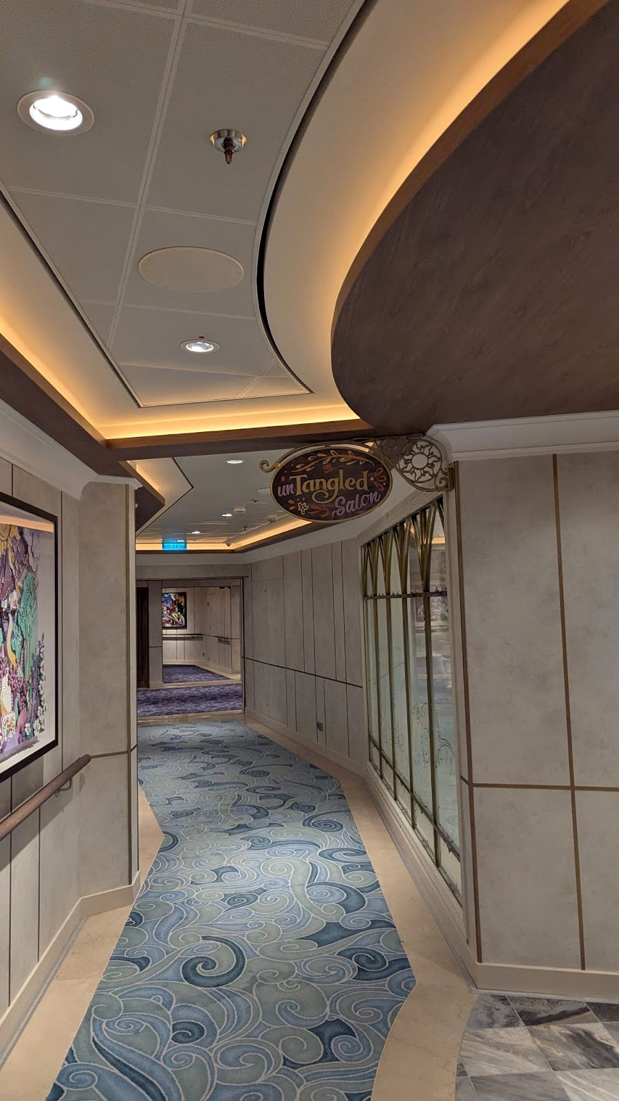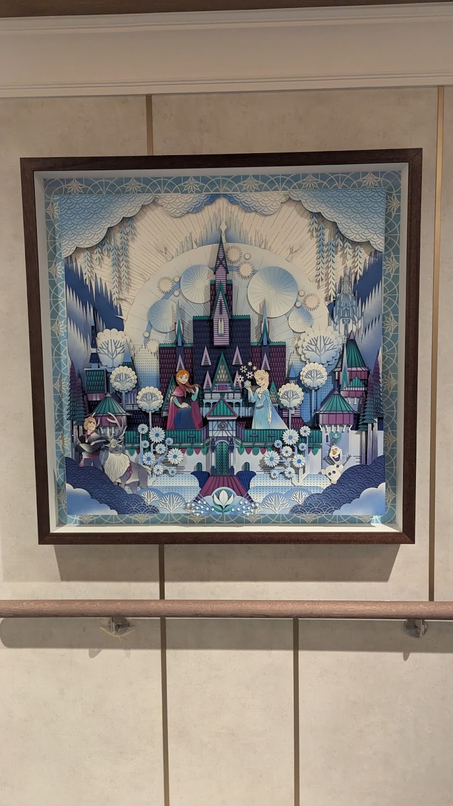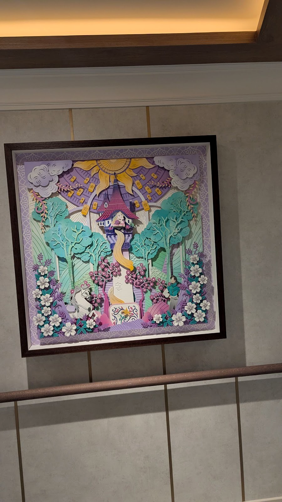 Near the UnTangled Salon on Deck 4, those walking by can stop and look at some stunning dimensional paper art depicting various films, including Tangled, as well as Encanto, Frozen, and The Little Mermaid.