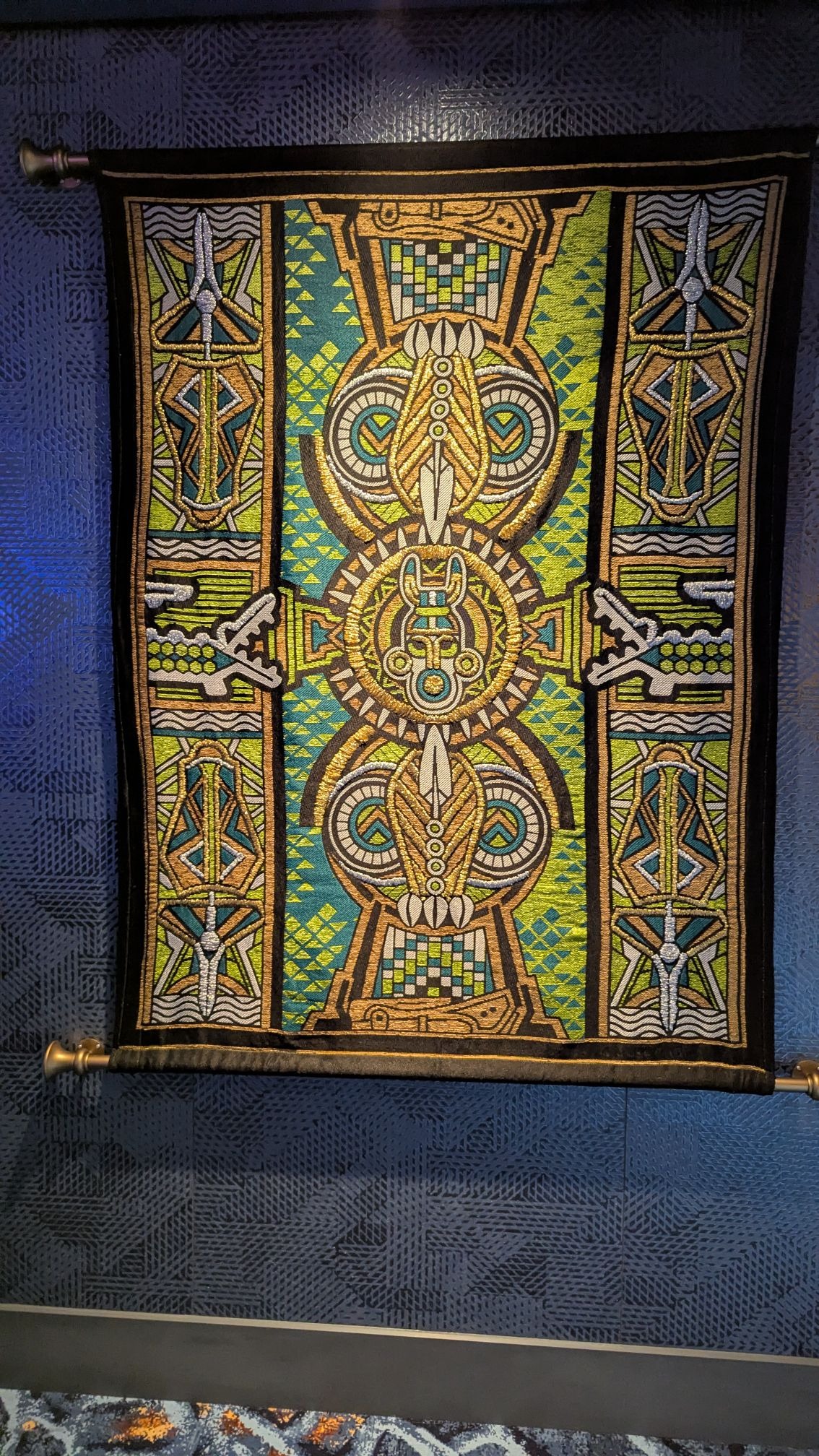 Loki inspired tapestries can be found along the walls of the hallway near one of the entrances of Saga.