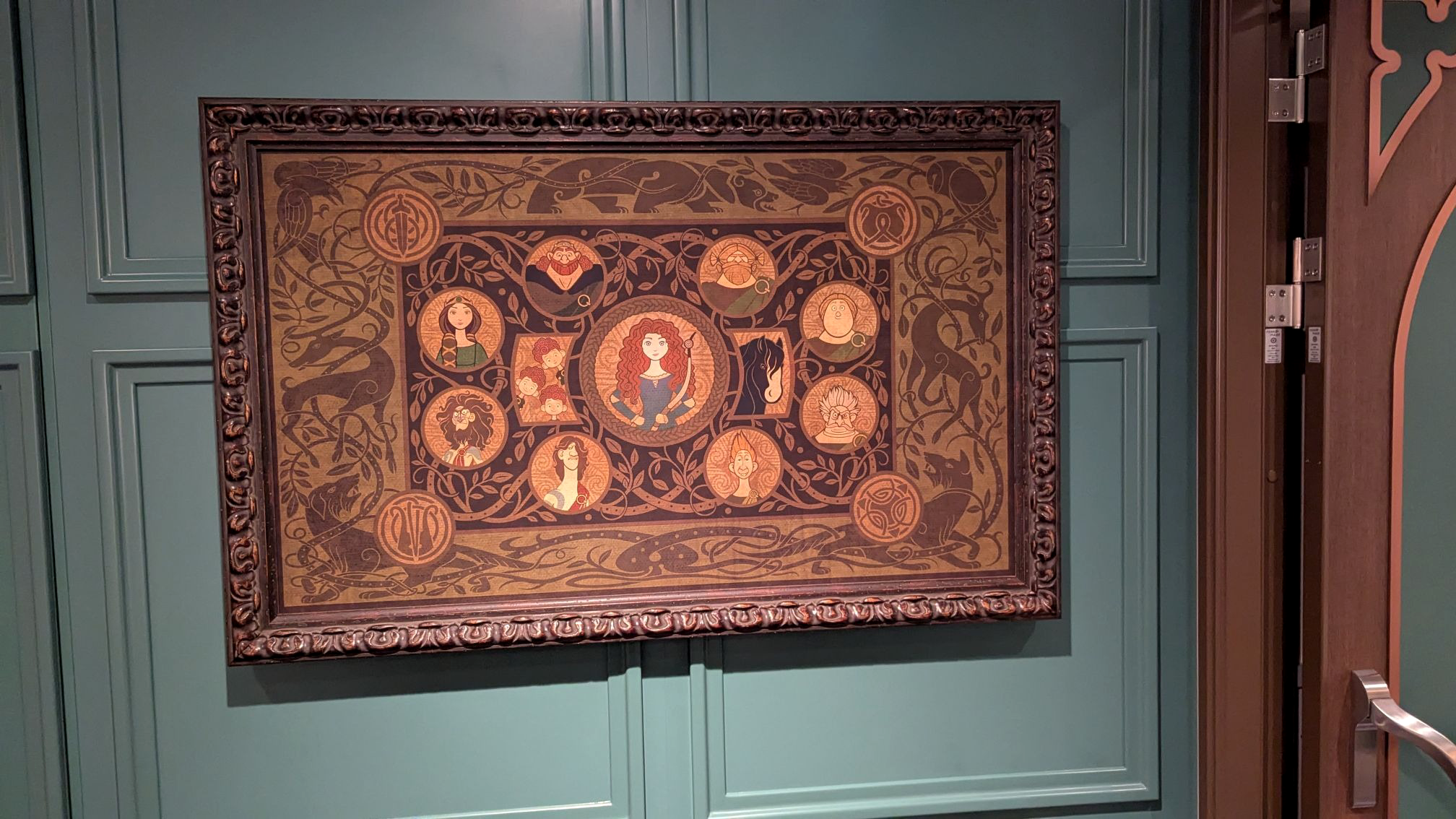 The Tartan-style carpeting brings us to Cafe Merida, themed to the Pixar movie, Brave. Look for Merida's family tree (of sorts) nearby as well.